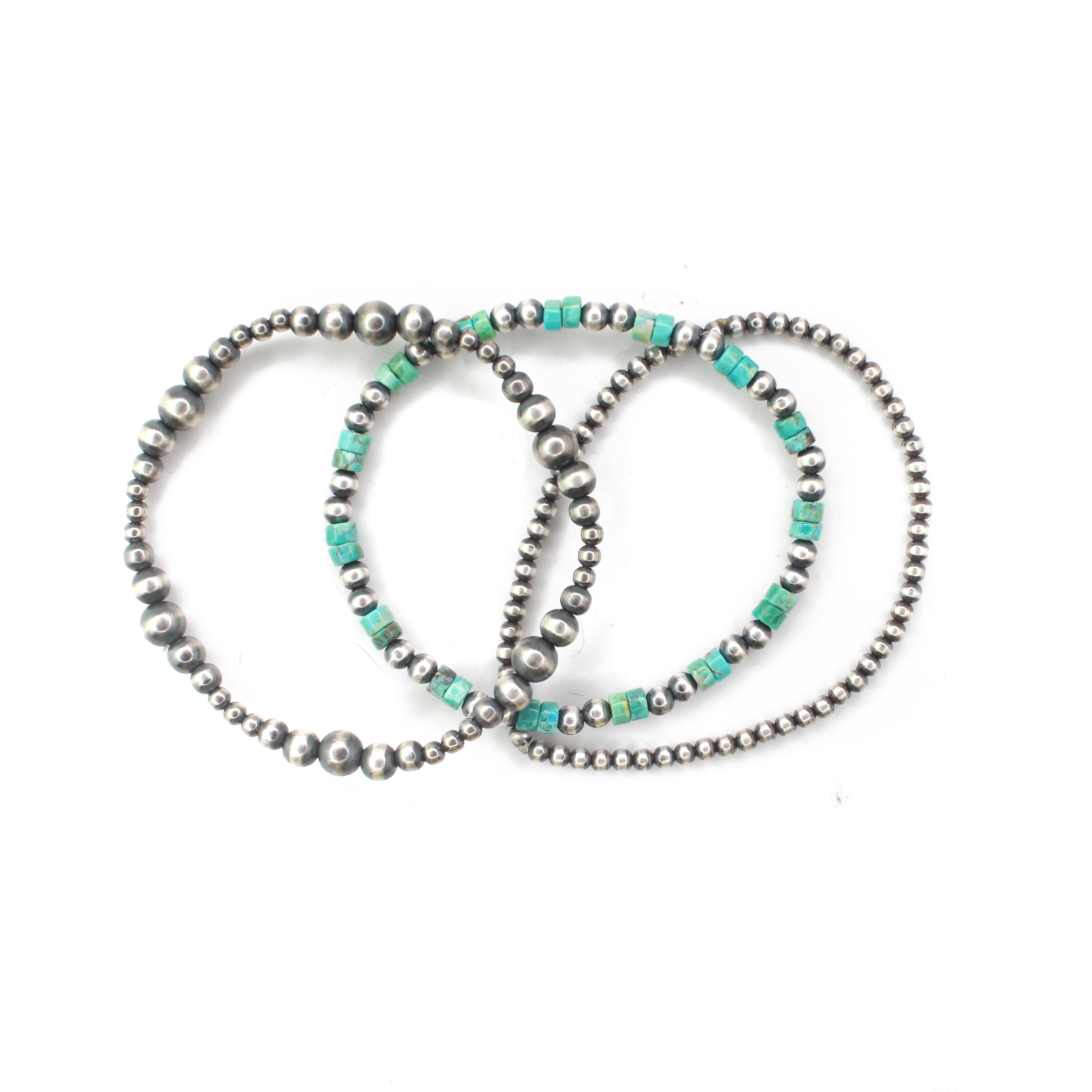 Set includes: (1) 3mm, (1) Multi Size, (1) 5mm w/ turquoise Navajo Pearl Stretch Bracelet