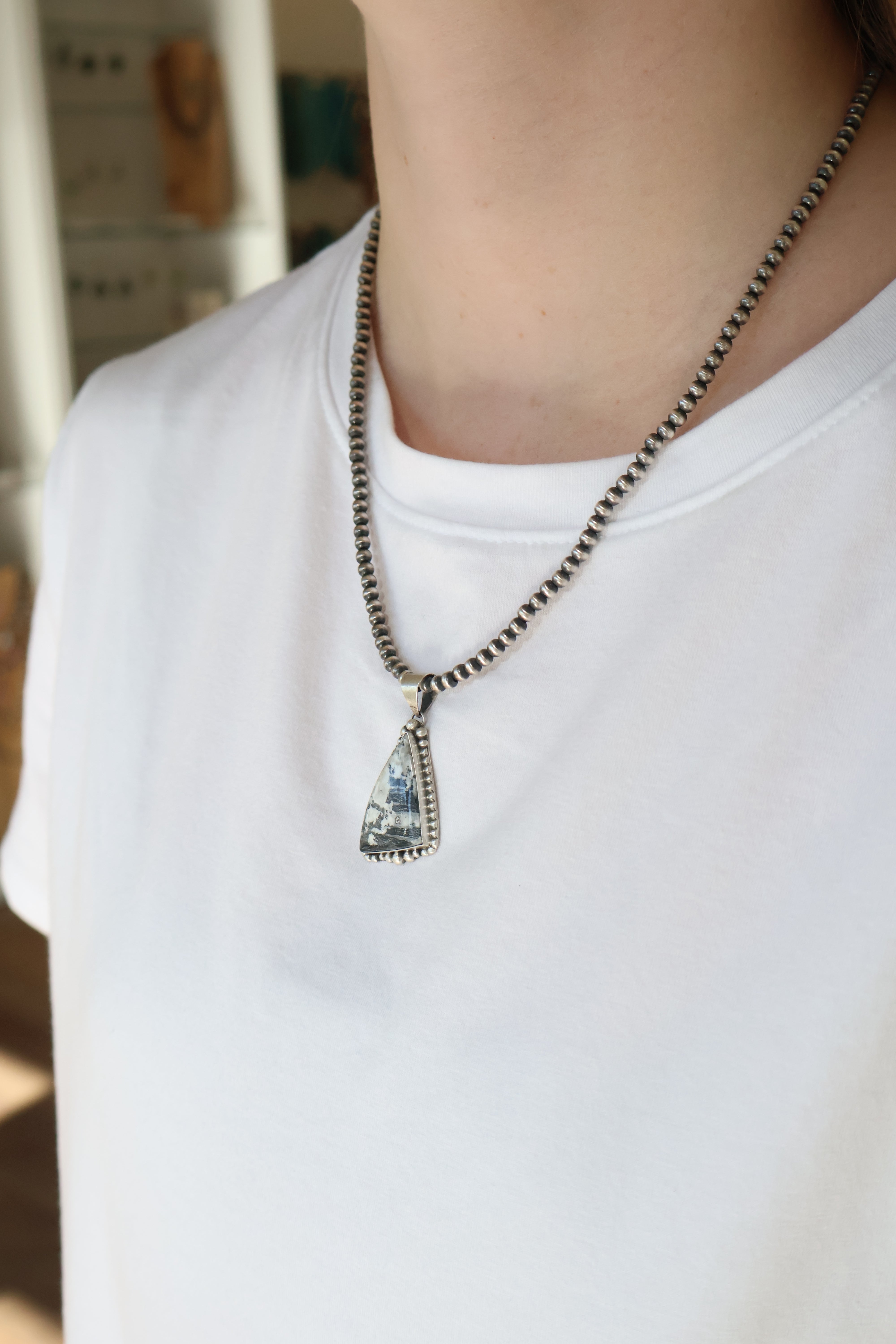 Pictured on 4mm, 20" Navajo Pearls Not Included