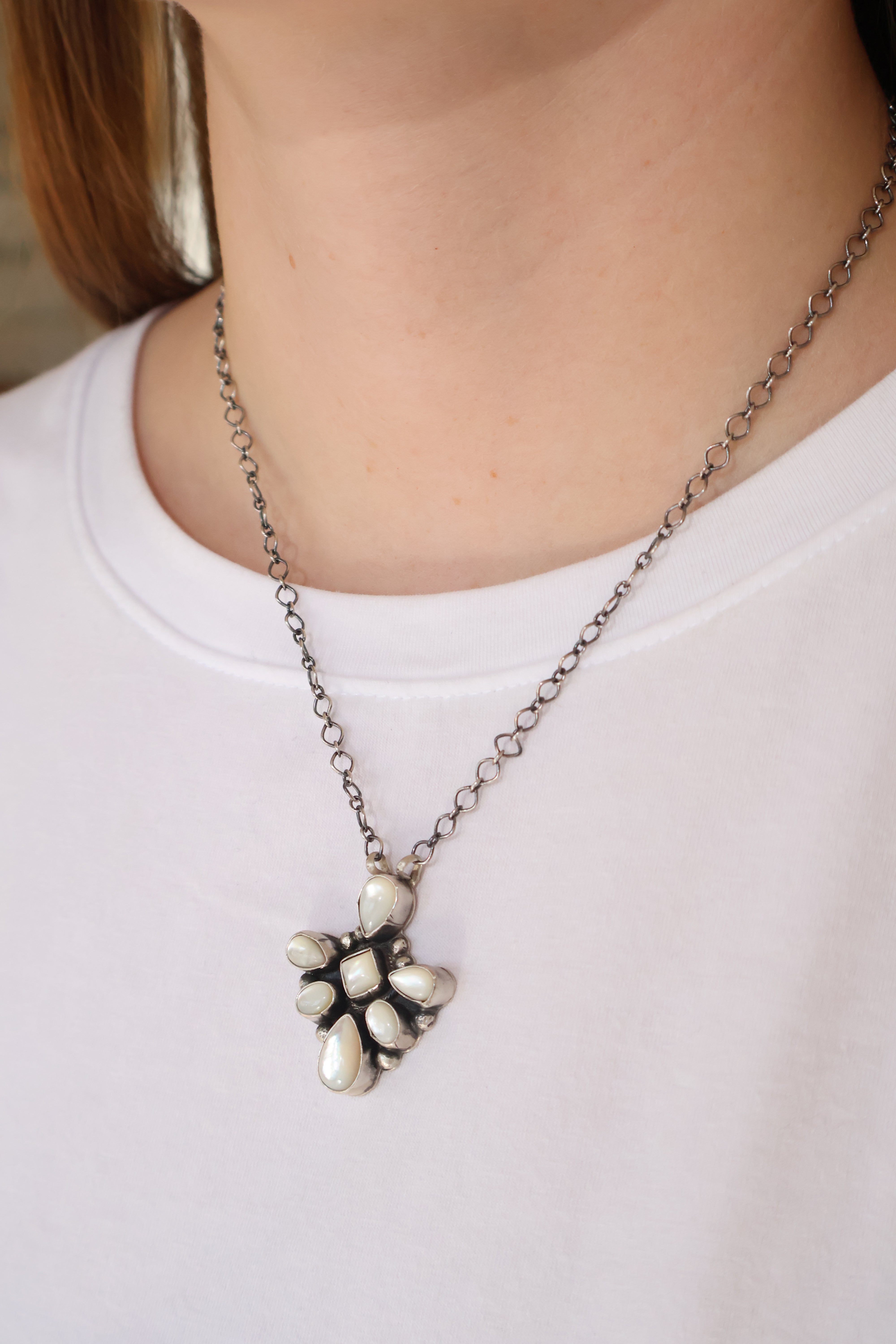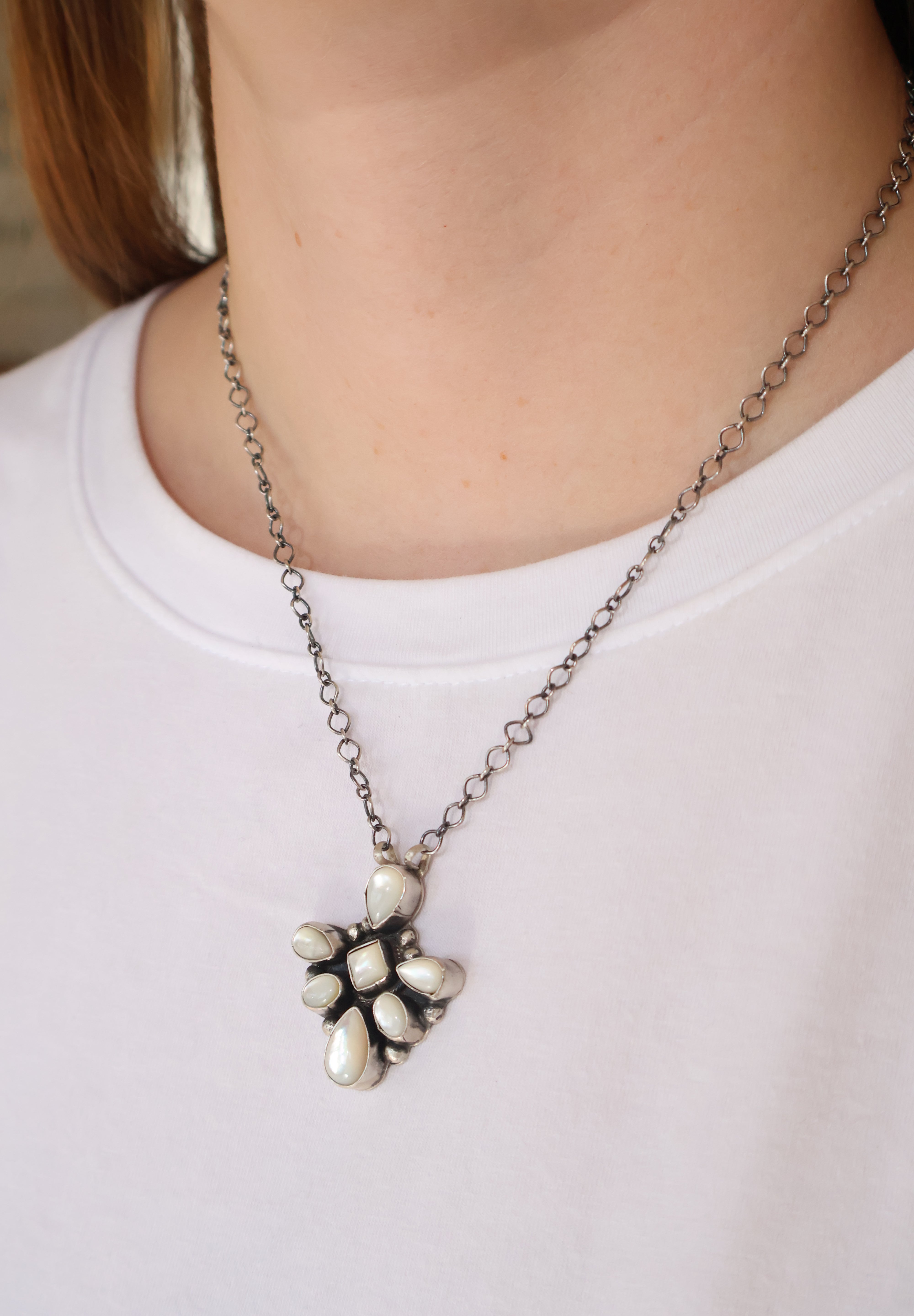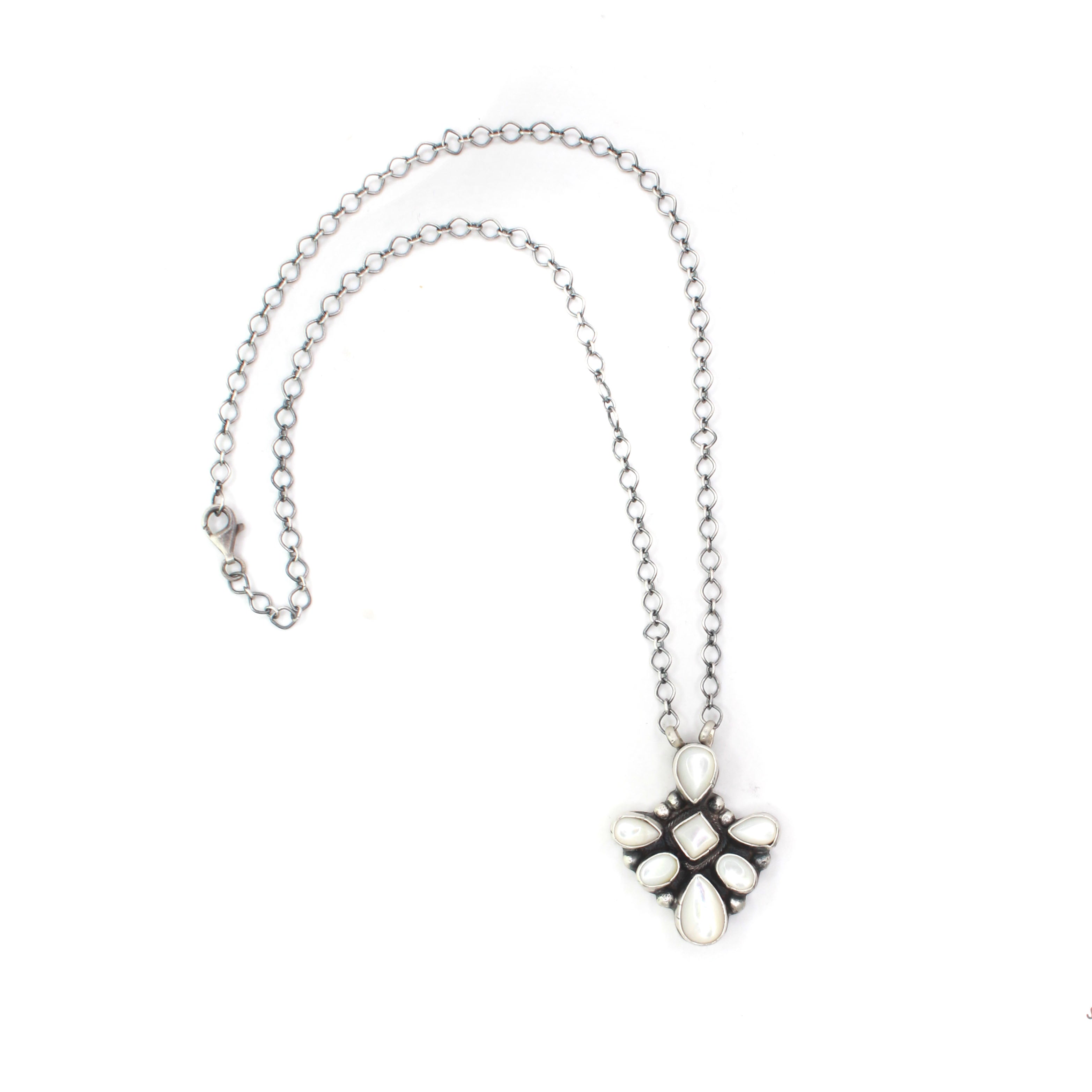 Mother of pearl, also known as nacre, is the iridescent inner layer of certain mollusk shells, such as oysters and abalones. It is composed primarily of aragonite (a form of calcium carbonate) and conchiolin (a protein), giving it a smooth, lustrous appearance. The unique play of colors, ranging from white to various shades of pink, blue, and green, is due to the way light interacts with the layered structure. Native American culture views mother of pearl as a symbol of beauty, protection, and tranquility, which adds deeper meaning to the jewelry.