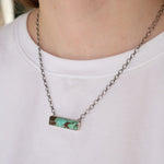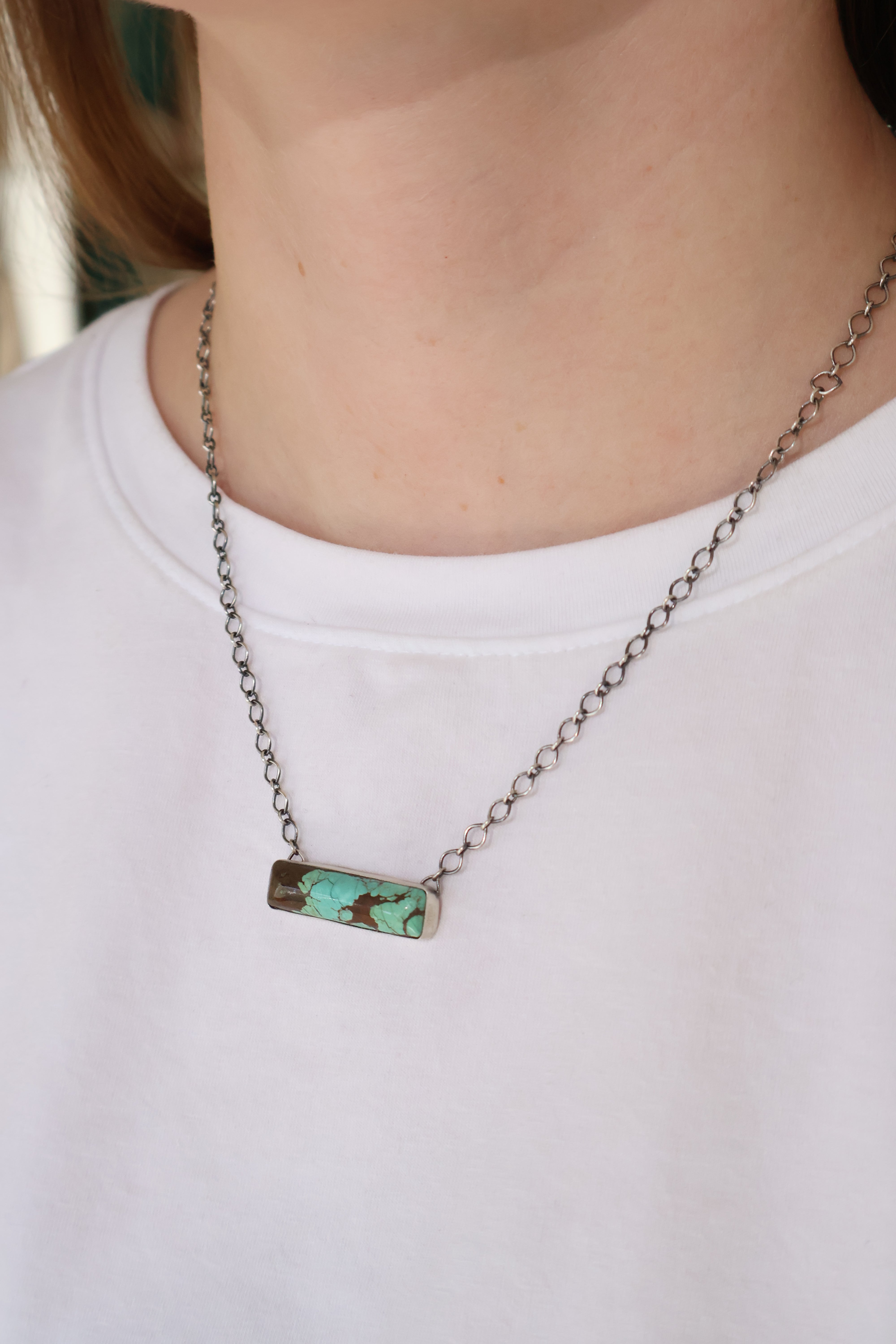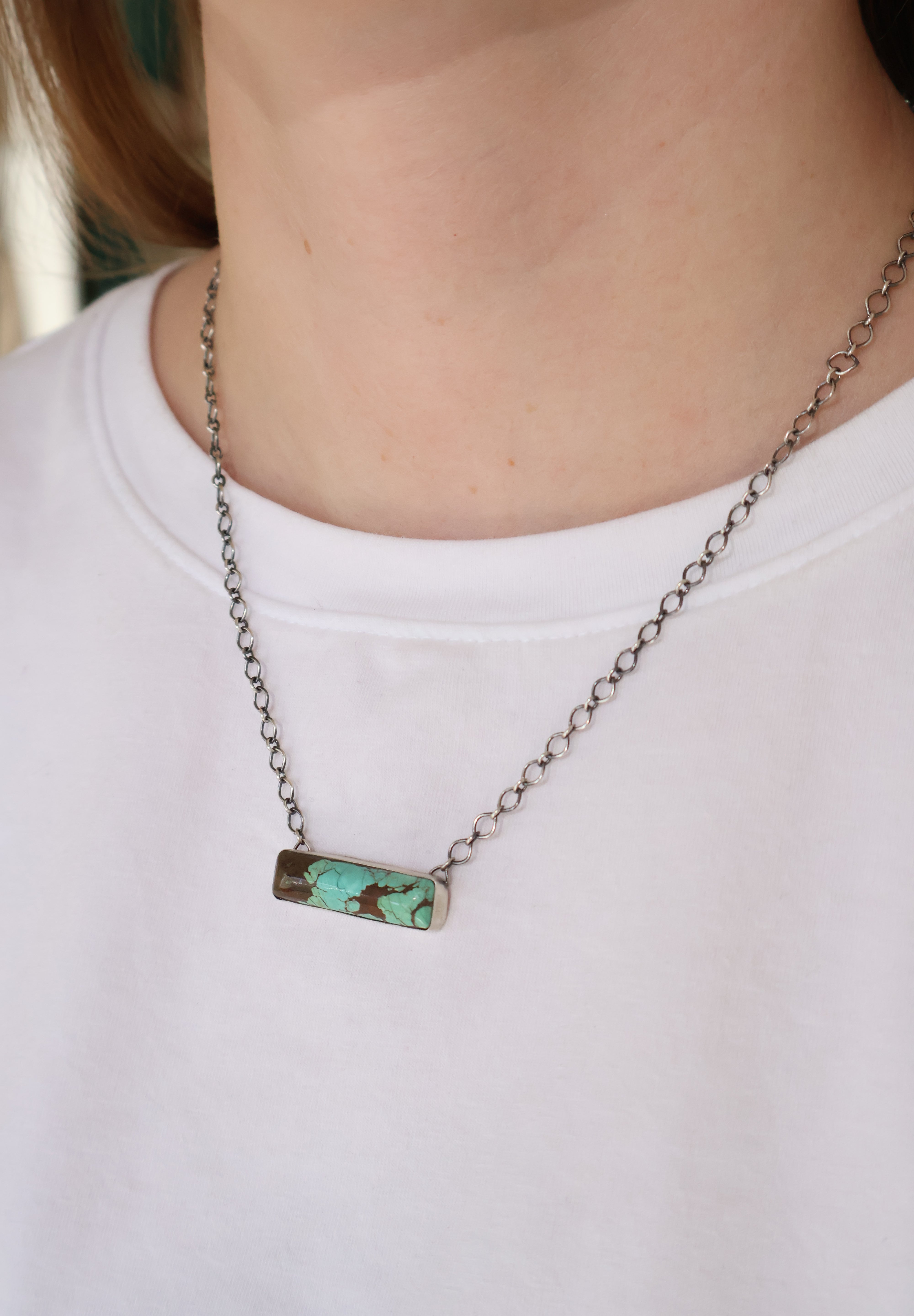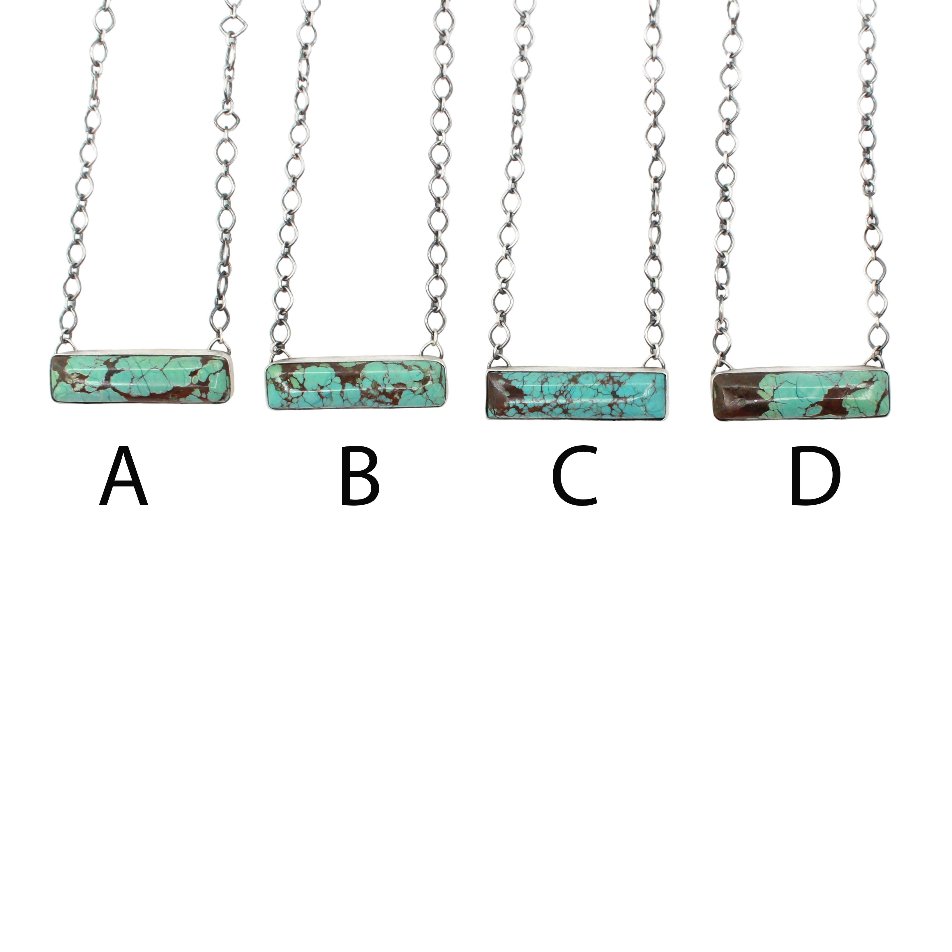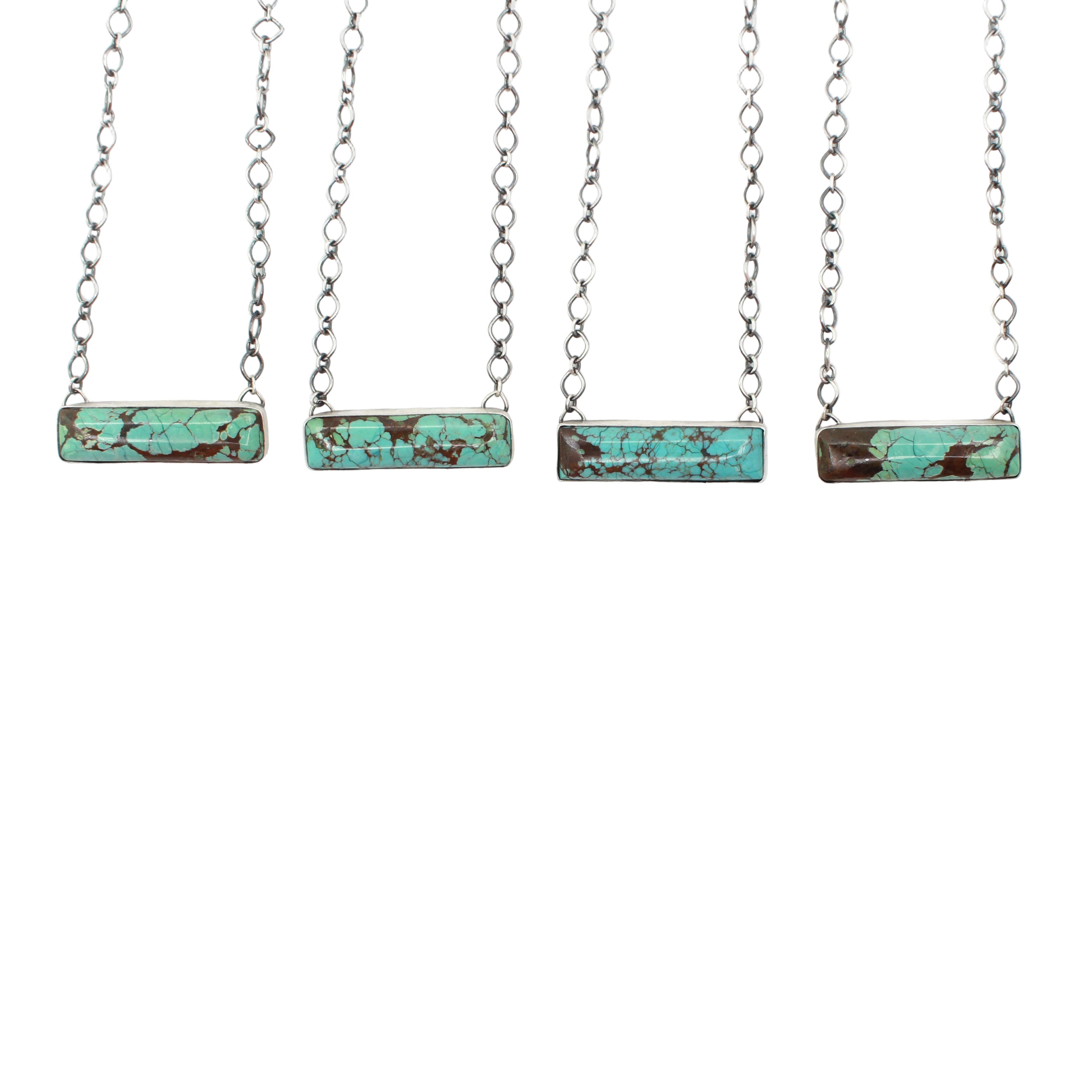 The length listed for bar necklaces is measured from clasp to hook, including the width of the bar. This total length does not directly reflect how the necklace will sit when worn. To more accurately determine where the necklace will sit, subtract the 'bar width' measurement from the 'length end to end" measurement.