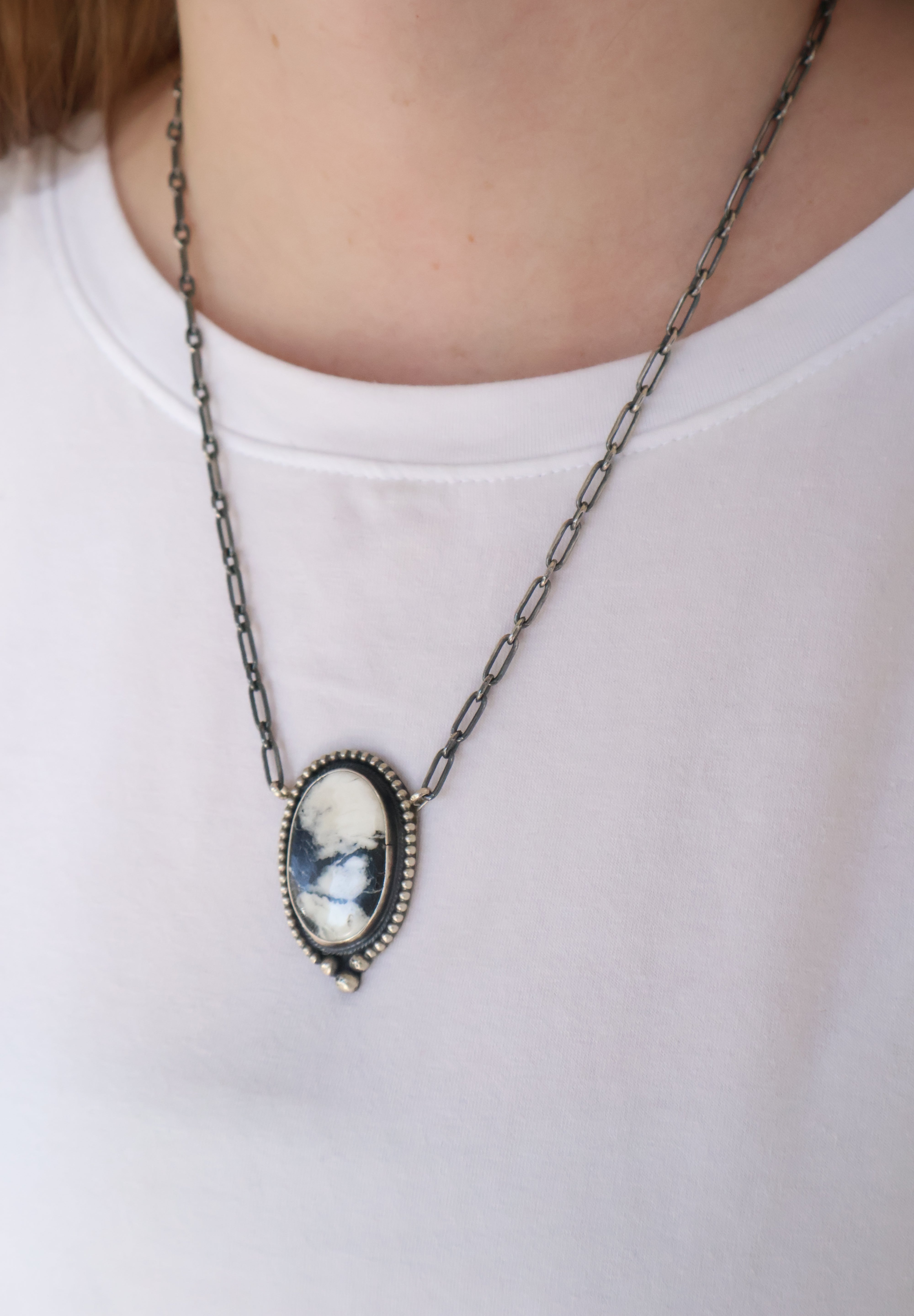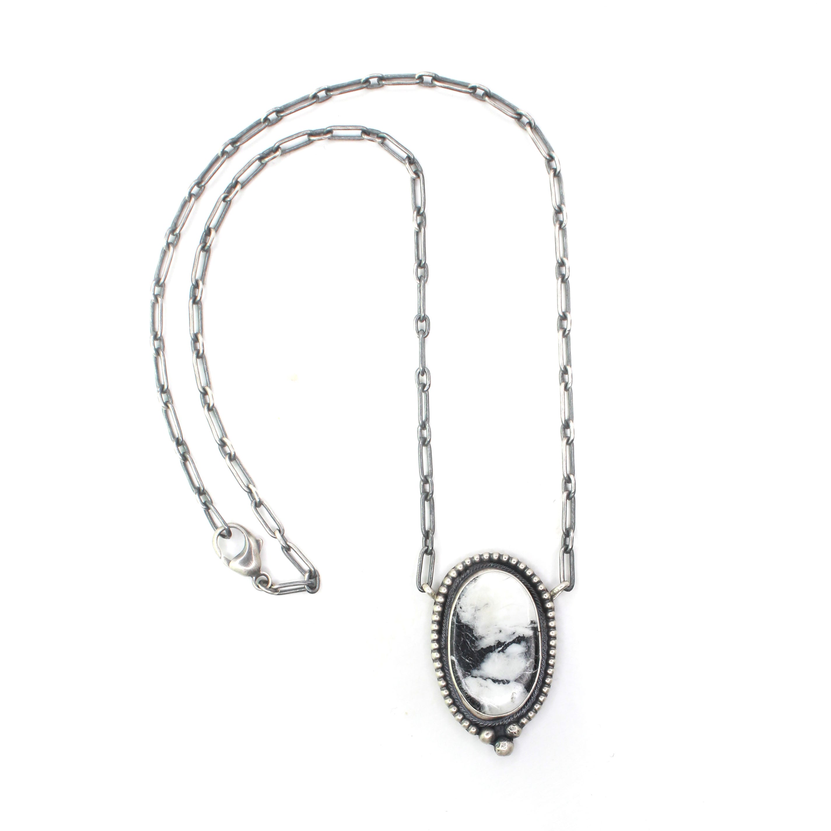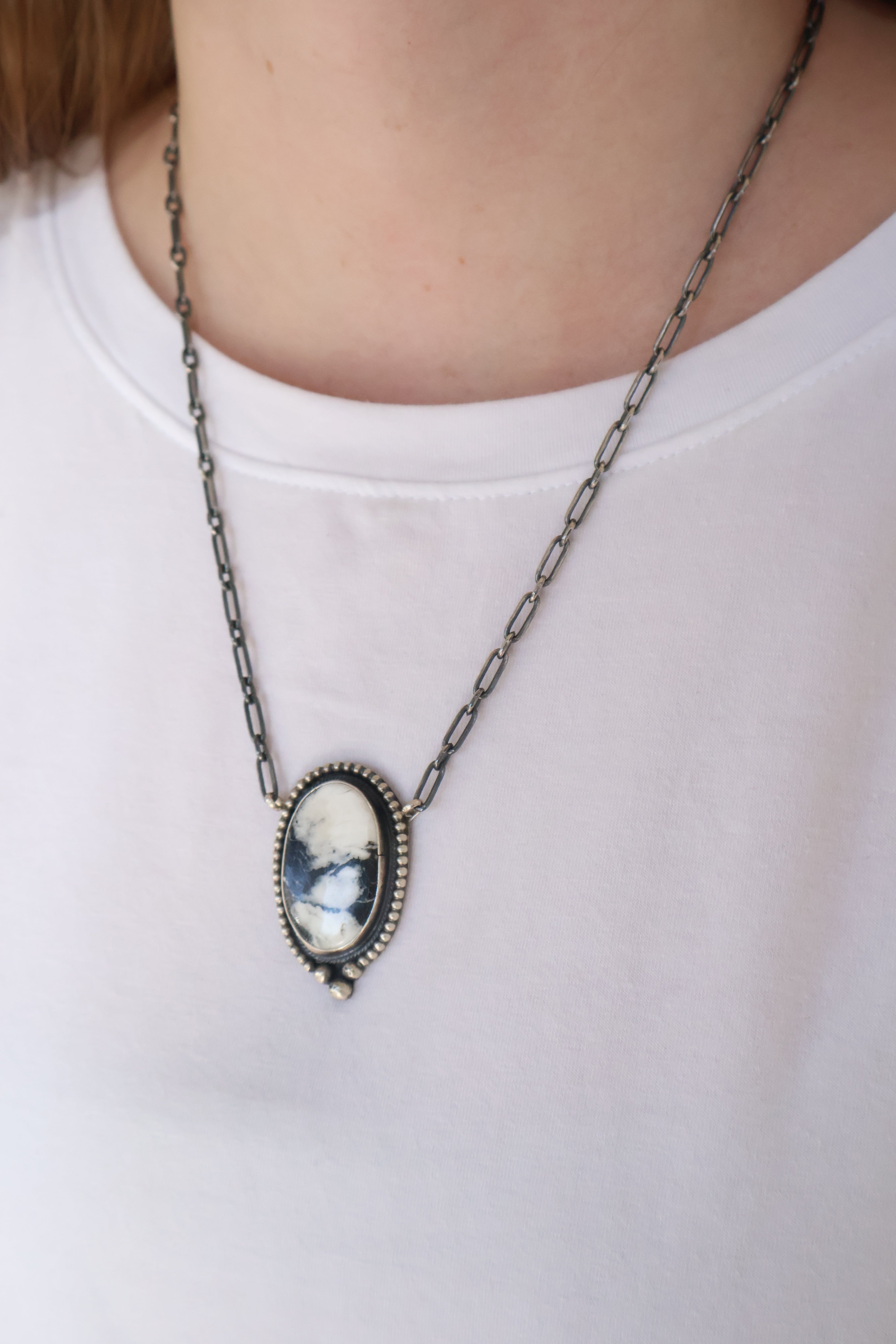 White Buffalo is in fact NOT turquoise. Although White Buffalo is often sold as turquoise, it's classification is actually magnesite and alumite. Its unique coloring comes from the presence of Calcite mineral. The only mine known to be home to White Buffalo is The Dry Creek Mine in Tonopah, NV. It was first discovered by the Otteson family in 1993. The name derives from the Native American belief that white buffaloes are pure and rare like the white buffalo stone. The white stone is surrounded by black and brown flint-like chert which creates beautiful patterns, and sometimes in rare pieces, a spider-web matrix. The stone appears in veins, is as hard as turquoise (Mohs hardness scale of 5.5 to 7.5) and cuts and polishes like turquoise.