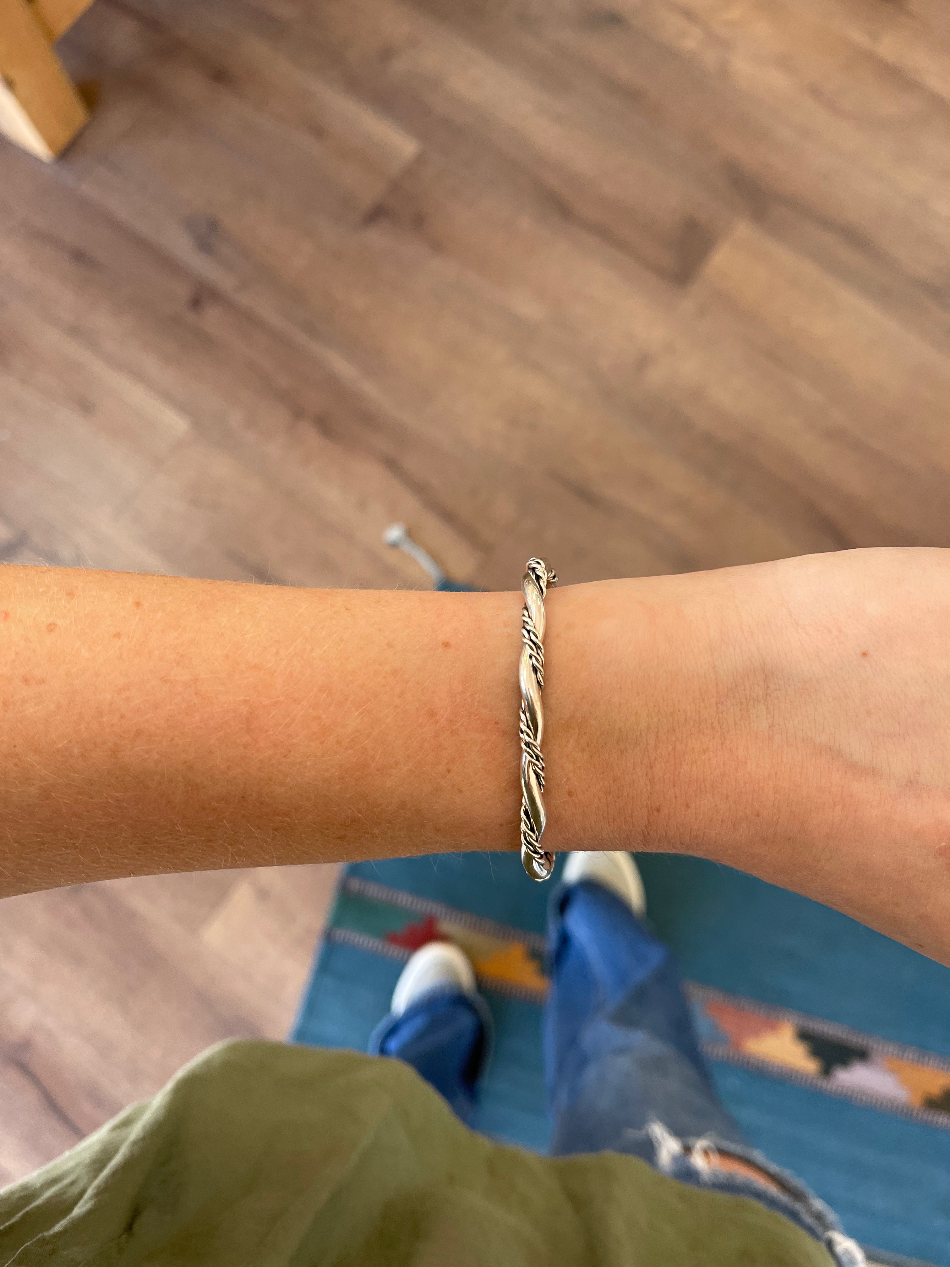 The Tahe name, originating from the Navajo community in Arizona, is linked to a variety of unique jewelry styles, with new interpretations emerging over time. Many pieces created under this name may come from artisans who are related to one another. The most prominent style features an array of wire types and metal sheets meticulously crafted into striking final products. This distinctive style resonates with both men and women; notable examples include a bracelet worn by Robert Redford in the film "The Horse Whisperer." Scroll down to explore examples of jewelry currently crafted by Elaine Tahe, who resides in New Mexico.
