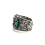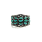 Murphy Platero is a talented Navajo silversmith known for his distinctive jewelry, which is featured in numerous fine galleries. His one-of-a-kind pieces showcase his unique stamp work and incorporate the finest turquoise stones, which he personally selects. Born in Crownpoint, New Mexico, Murphy comes from a lineage of craftsmanship; his mother, a respected Native American silversmith, is renowned for her exquisite stamped feather jewelry. Under her guidance, Murphy learned the art of silversmithing and has honed his skills over the years. One of his standout designs is called "Rainwater."