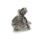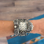 Tim began silversmithing as a young man, refining his skills alongside esteemed Native artists like Chalmers Day and Jimmy Harrison, who encouraged him to explore his talents. During this formative time, he developed many of his overlay designs and innovated by incorporating inlay work and stones, playfully dubbing this fusion his “orale” designs. His recent creations often feature motifs inspired by pottery, paying homage to his grandmother’s influence, and the addition of fine inlay and stonework elevates his pieces to the extraordinary.