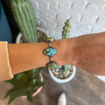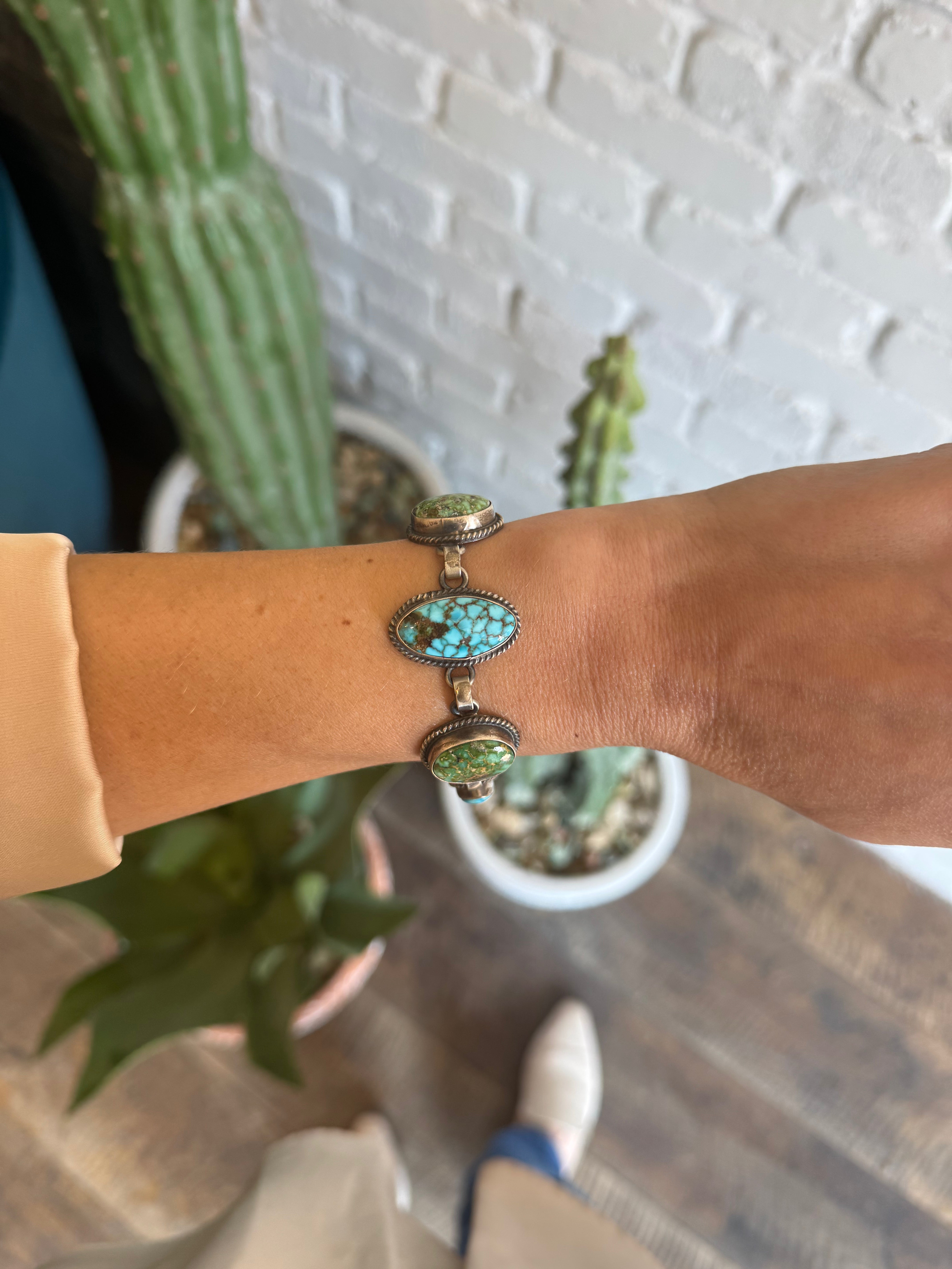 Sonoran turquoise, mined from the Campitos Mountain near Cananea, Sonora, Mexico. This region produces several distinctive types, including Sonoran Gold, known for its vibrant colors like aqua blue, lime, and two-tone blue and green with a golden-brown matrix; Sonoran Rose, a natural bright blue turquoise; and Sonoran Blue, valued for its hardness, shiny pyrite flakes, and black oxide veins.