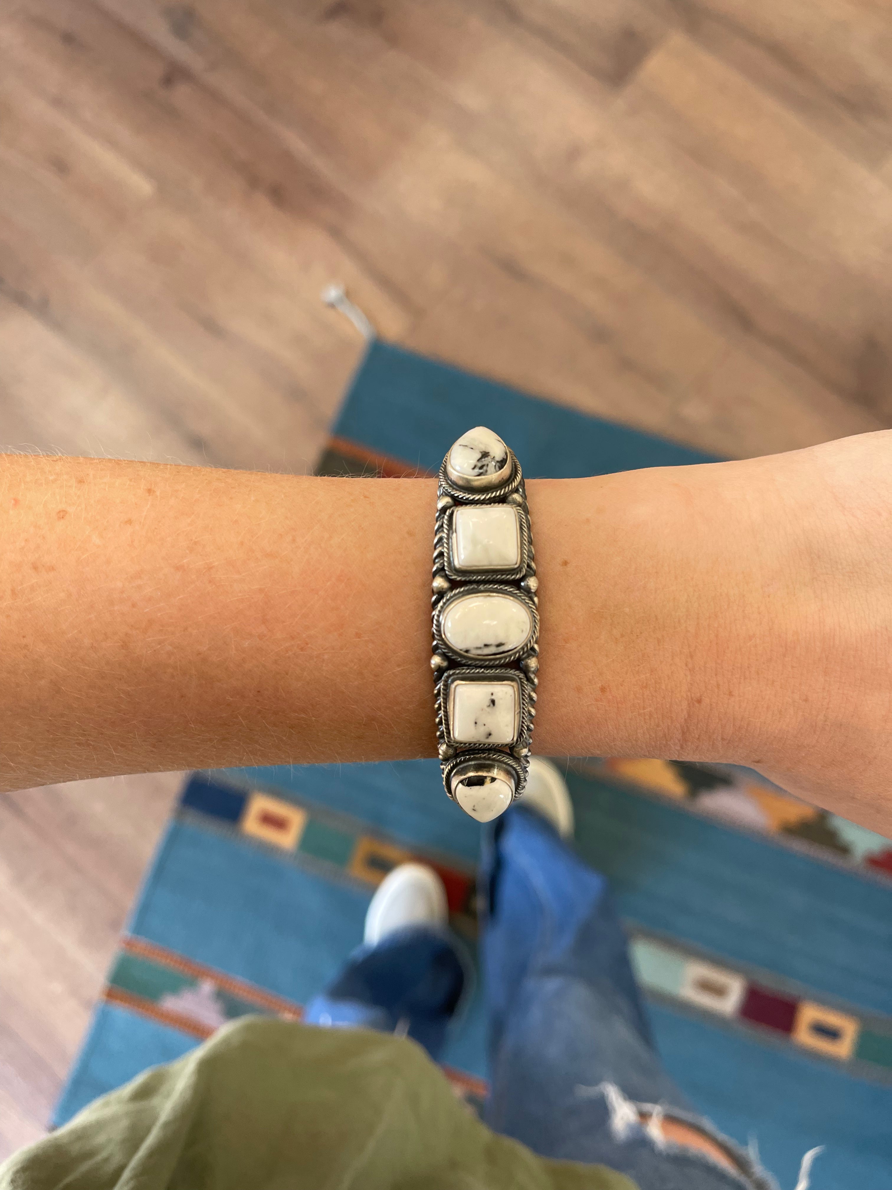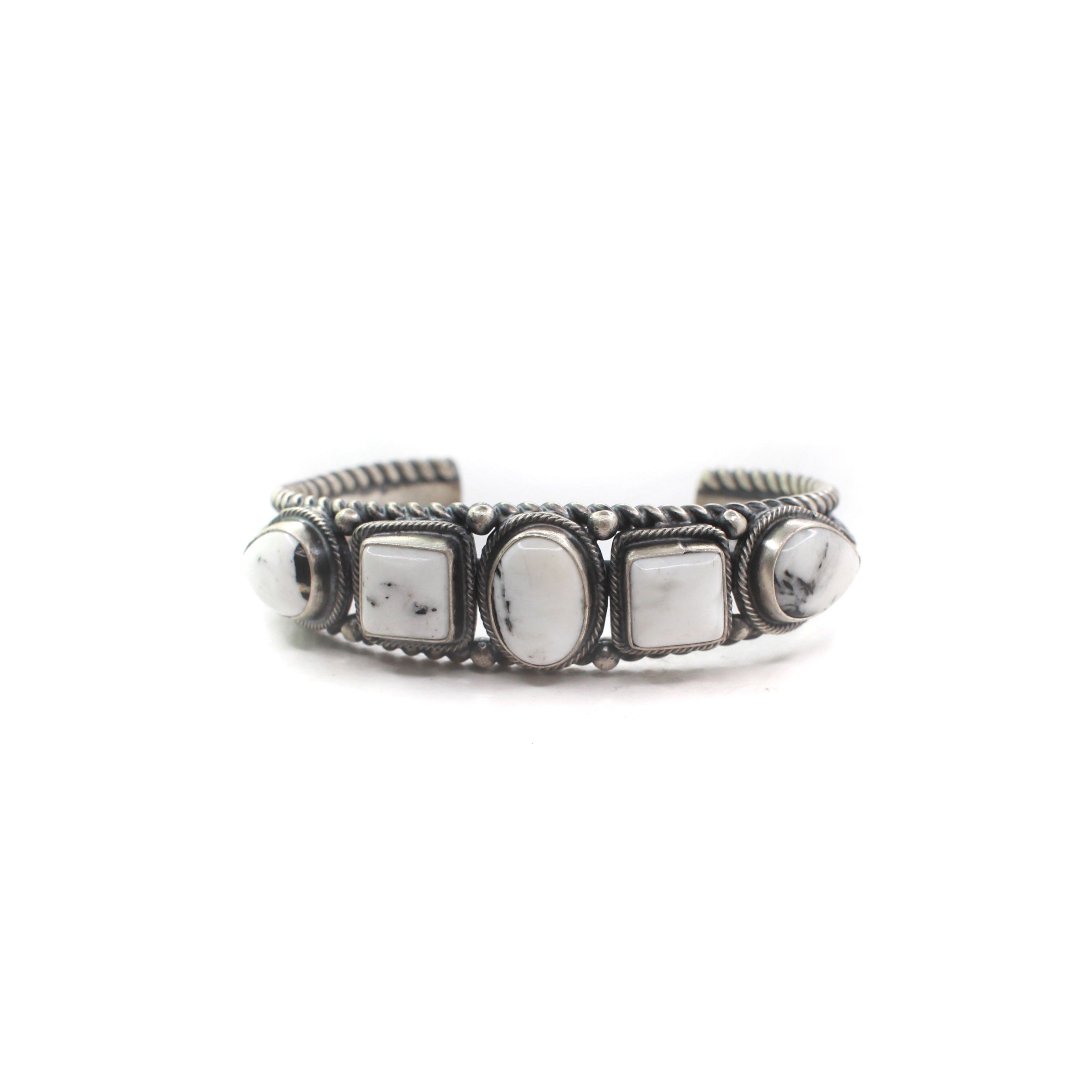 White Buffalo is in fact NOT turquoise. Although White Buffalo is often sold as turquoise, it's classification is actually magnesite and alumite. Its unique coloring comes from the presence of Calcite mineral. The only mine known to be home to White Buffalo is The Dry Creek Mine in Tonopah, NV. It was first discovered by the Otteson family in 1993. The name derives from the Native American belief that white buffaloes are pure and rare like the white buffalo stone. The white stone is surrounded by black and brown flint-like chert which creates beautiful patterns, and sometimes in rare pieces, a spider-web matrix. The stone appears in veins, is as hard as turquoise (Mohs hardness scale of 5.5 to 7.5) and cuts and polishes like turquoise.