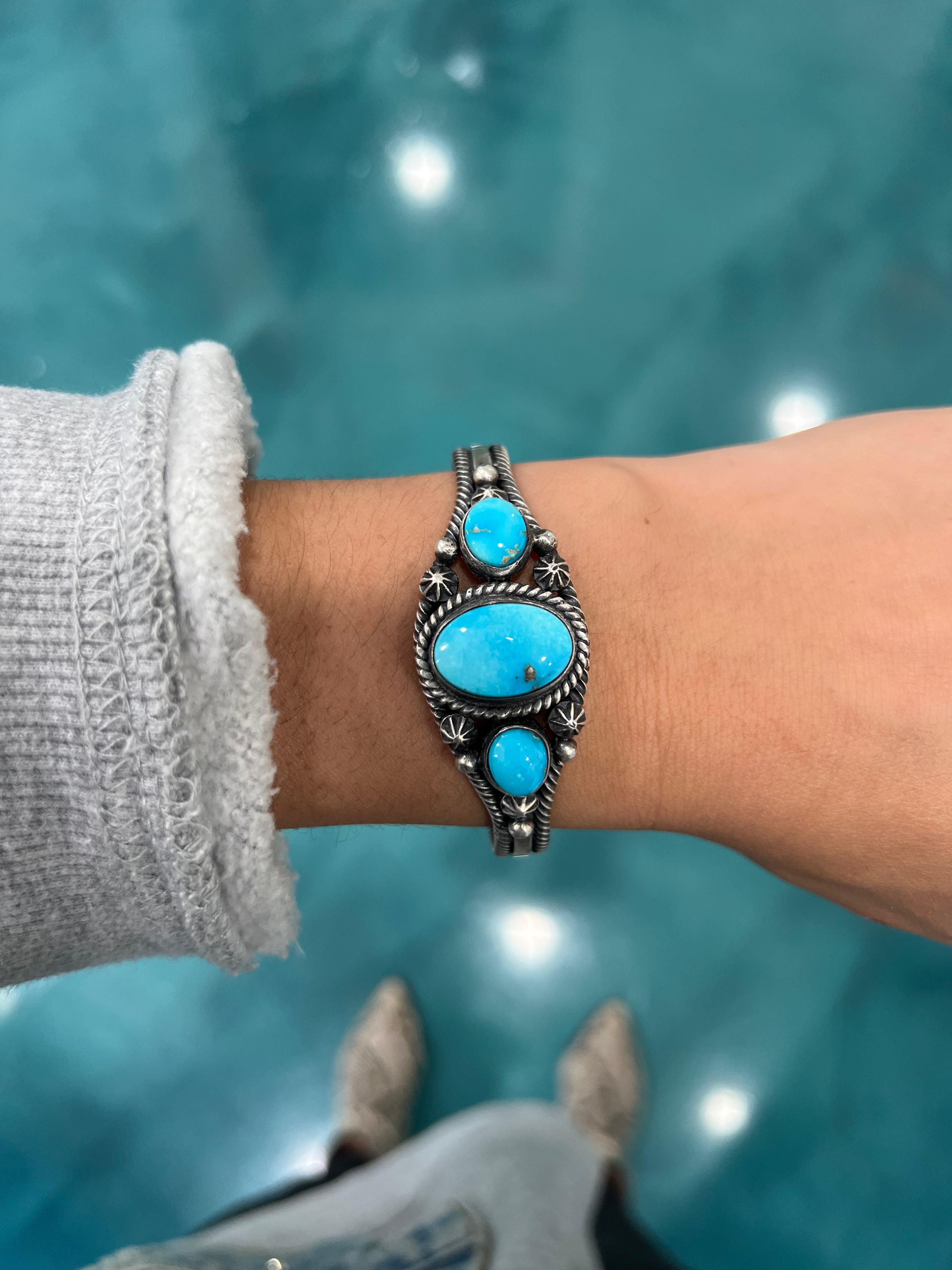Sonoran turquoise, mined from the Campitos Mountain near Cananea, Sonora, Mexico. This region produces several distinctive types, including Sonoran Gold, known for its vibrant colors like aqua blue, lime, and two-tone blue and green with a golden-brown matrix; Sonoran Rose, a natural bright blue turquoise; and Sonoran Blue, valued for its hardness, shiny pyrite flakes, and black oxide veins.