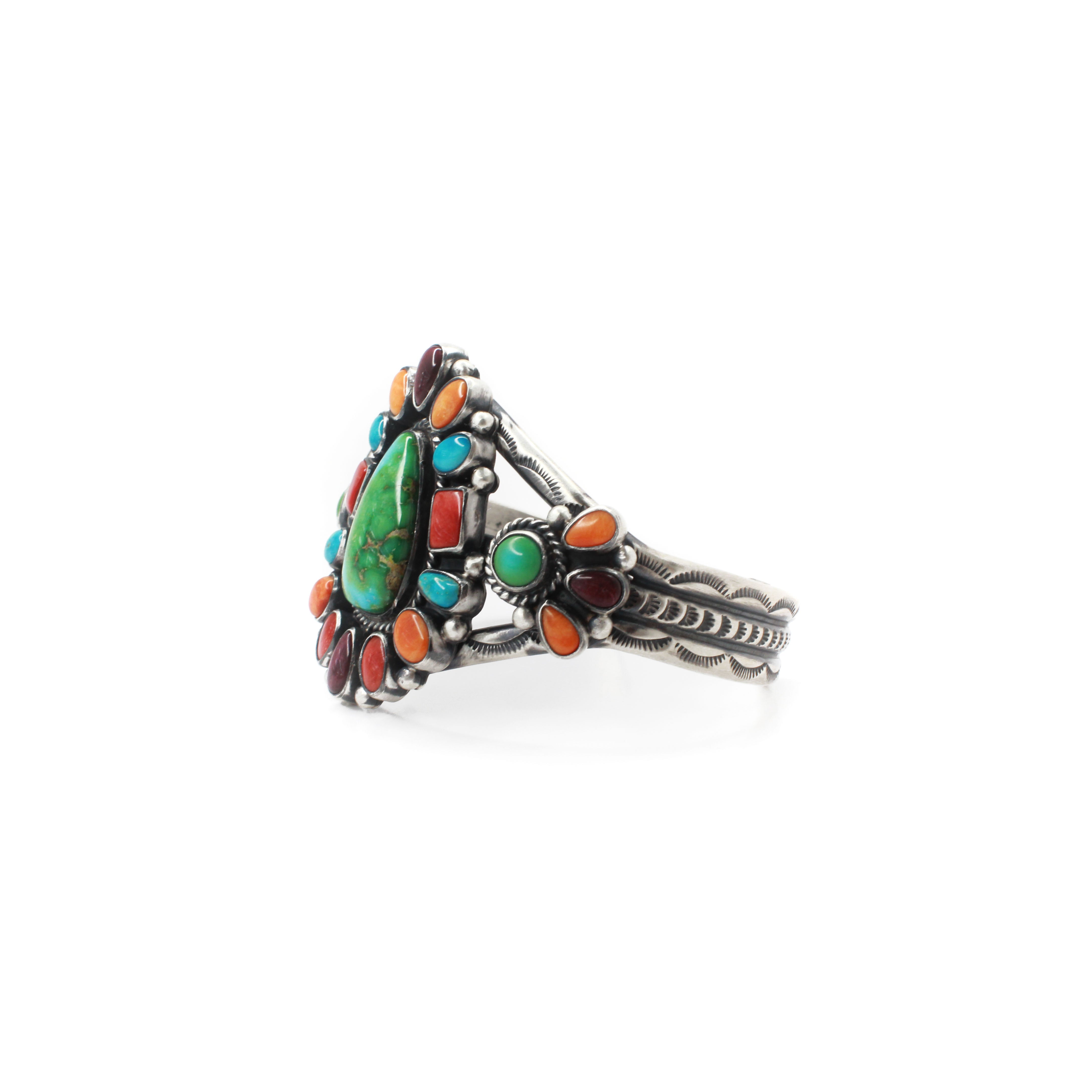 Murphy Platero is a talented Navajo silversmith known for his distinctive jewelry, which is featured in numerous fine galleries. His one-of-a-kind pieces showcase his unique stamp work and incorporate the finest turquoise stones, which he personally selects. Born in Crownpoint, New Mexico, Murphy comes from a lineage of craftsmanship; his mother, a respected Native American silversmith, is renowned for her exquisite stamped feather jewelry. Under her guidance, Murphy learned the art of silversmithing and has honed his skills over the years. One of his standout designs is called "Rainwater."
