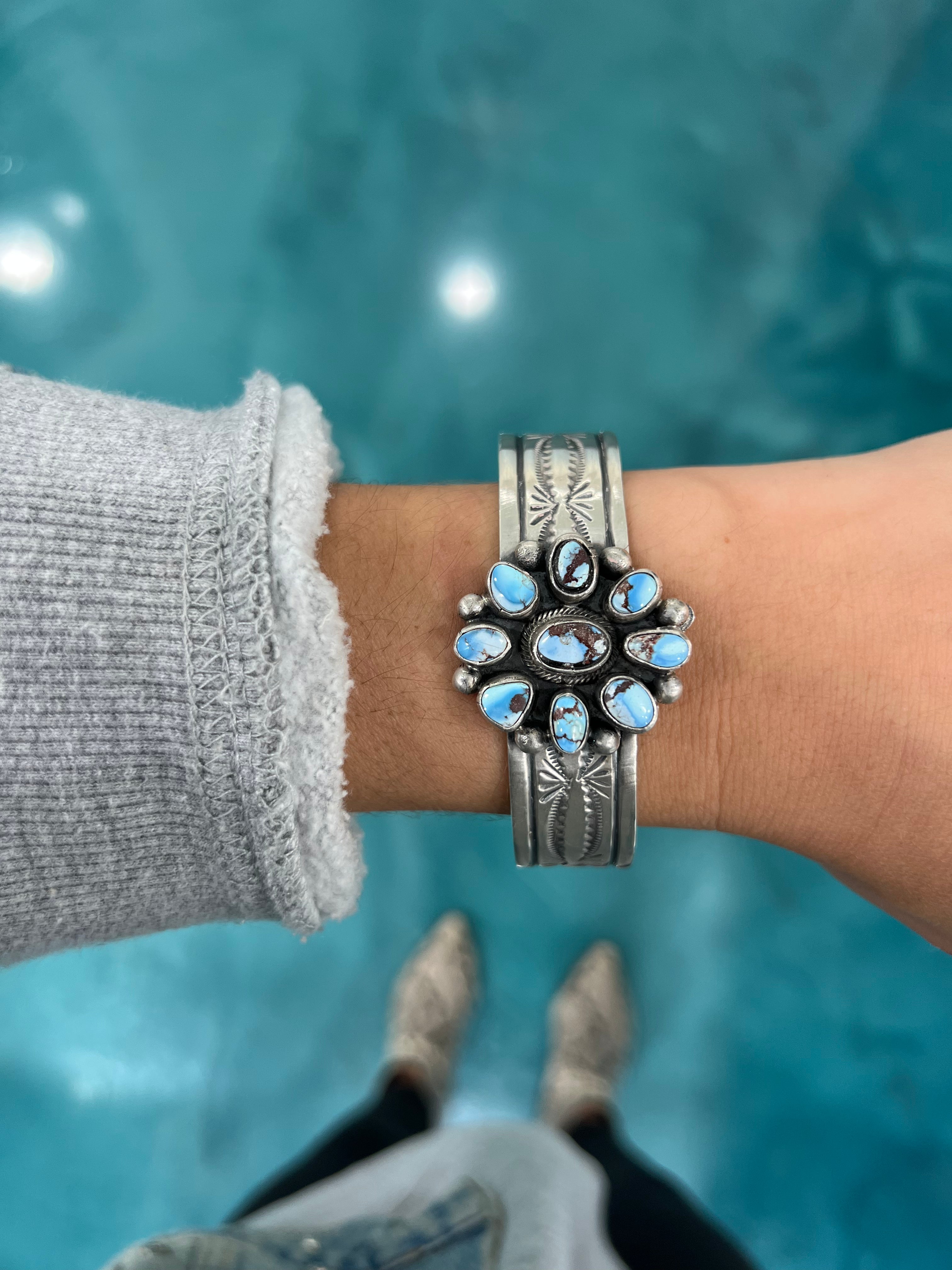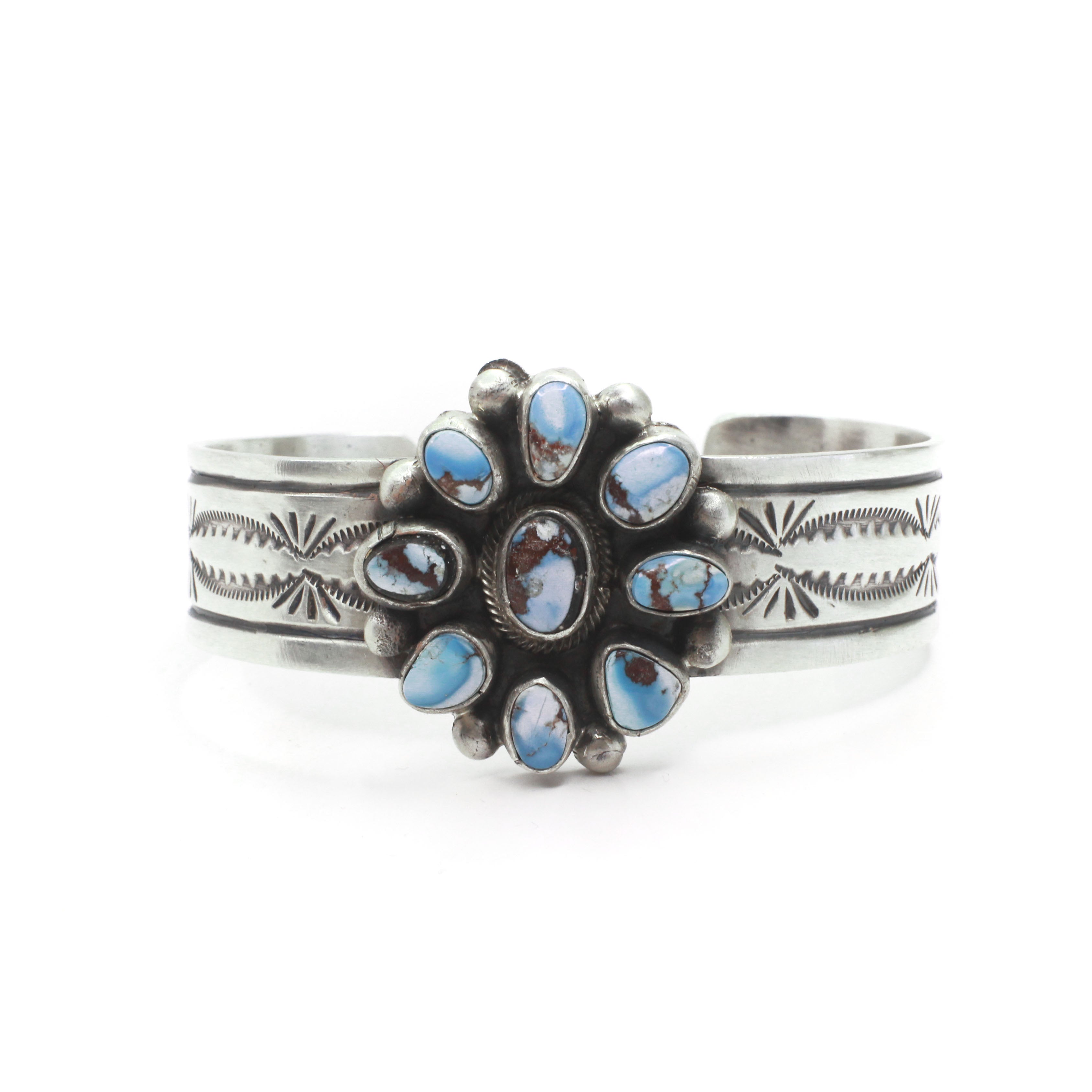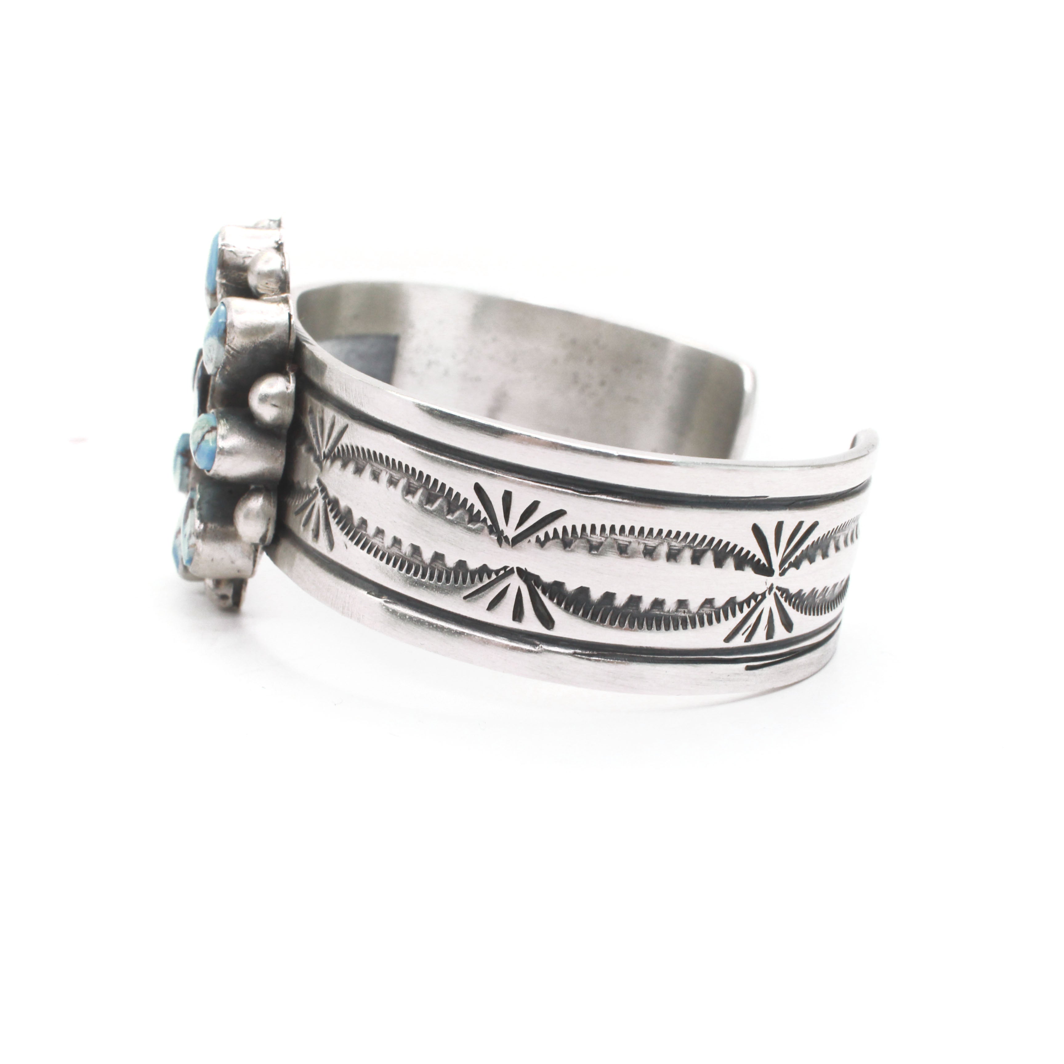 Bobby’s journey in silversmithing began in the early 1970s, learning the craft from his older siblings, who are also skilled silversmiths. Growing up in a family dedicated to this art, he developed a profound love for working with silver and turquoise that has only deepened over the years. Now in his sixties, Bobby remains as productive as ever, creating unique designs that blend traditional techniques with his personal style.