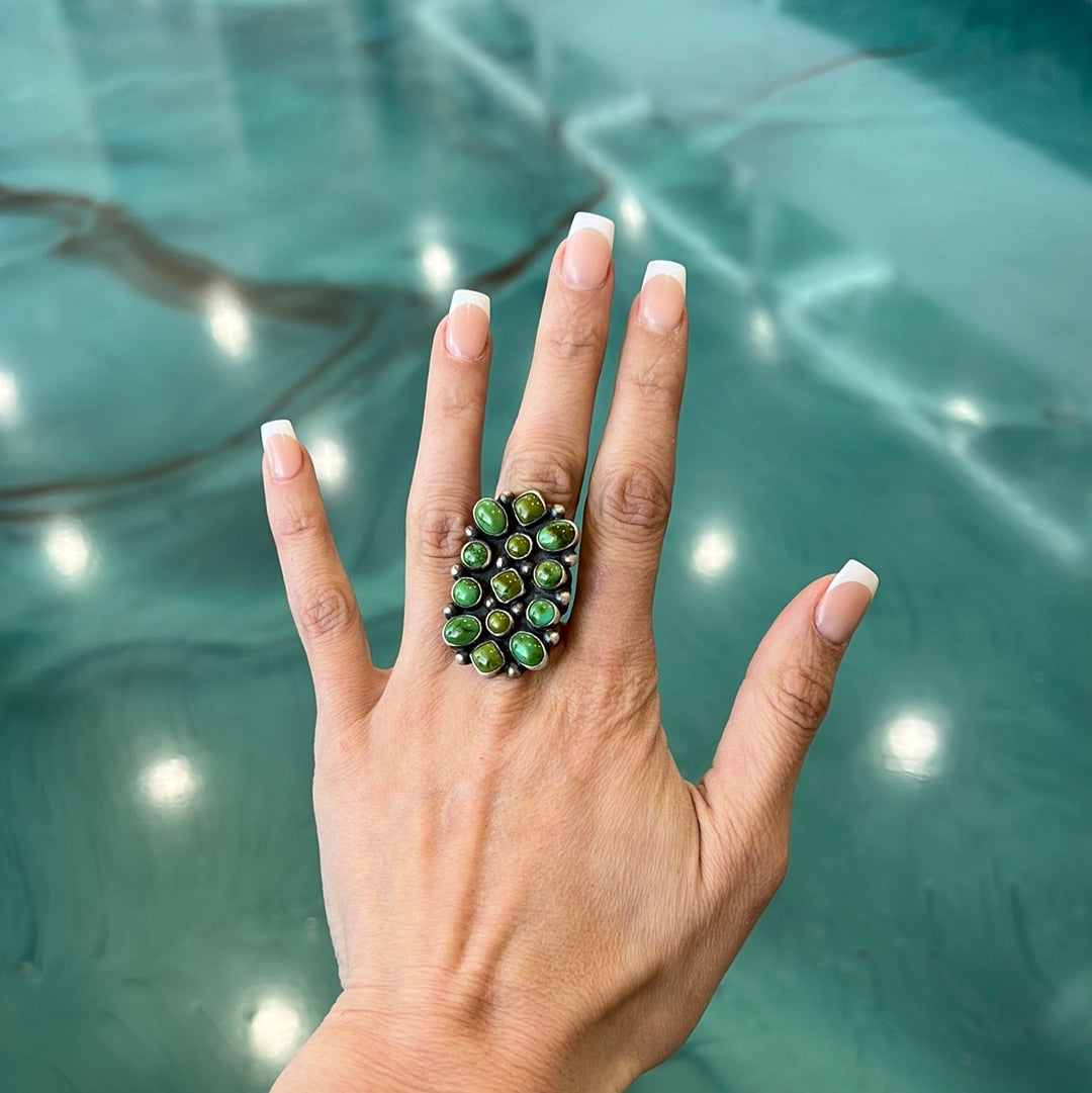 Sonoran turquoise, mined from the Campitos Mountain near Cananea, Sonora, Mexico. This region produces several distinctive types, including Sonoran Gold, known for its vibrant colors like aqua blue, lime, and two-tone blue and green with a golden-brown matrix; Sonoran Rose, a natural bright blue turquoise; and Sonoran Blue, valued for its hardness, shiny pyrite flakes, and black oxide veins.