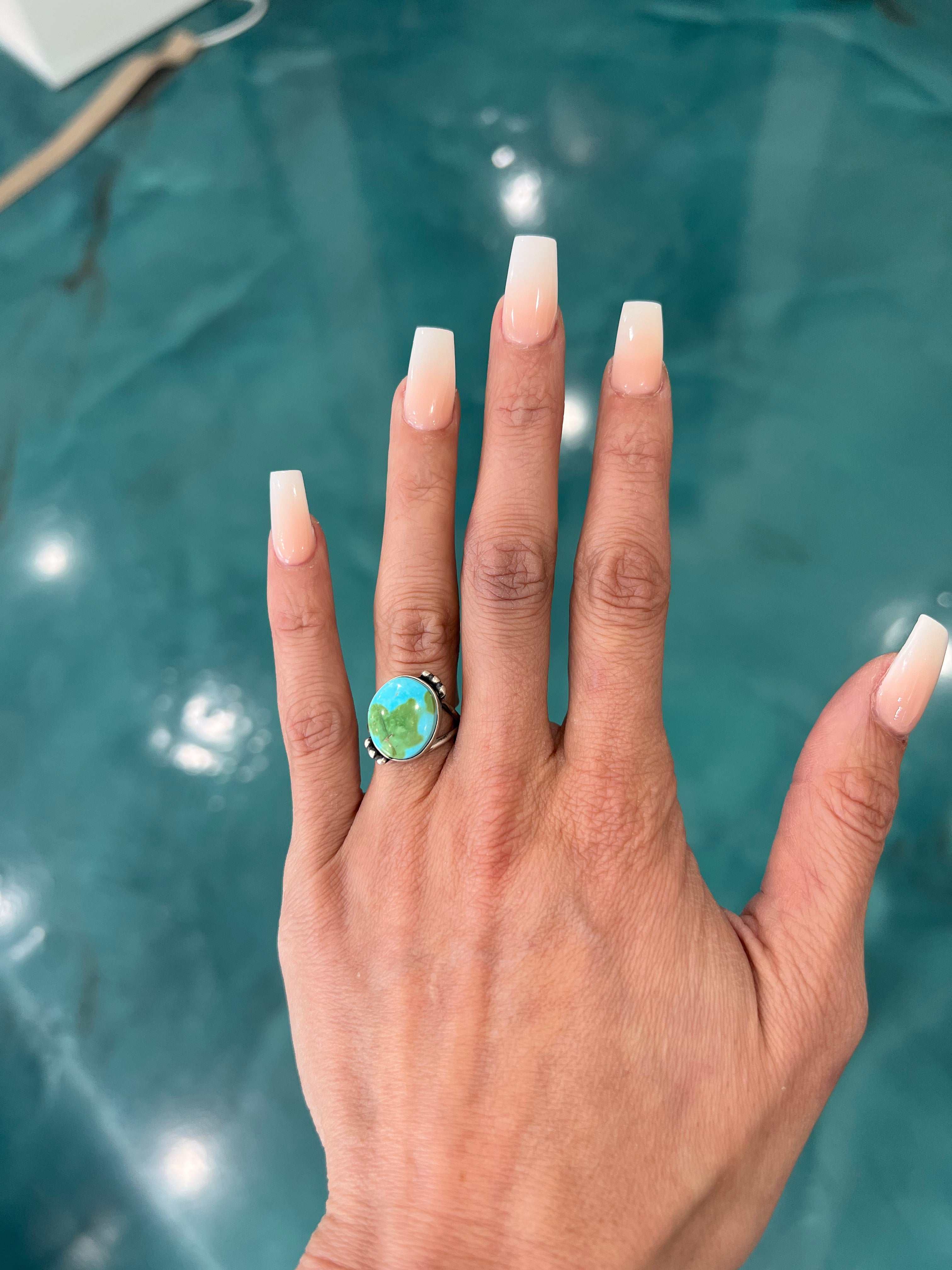 Sonoran turquoise, mined from the Campitos Mountain near Cananea, Sonora, Mexico. This region produces several distinctive types, including Sonoran Gold, known for its vibrant colors like aqua blue, lime, and two-tone blue and green with a golden-brown matrix; Sonoran Rose, a natural bright blue turquoise; and Sonoran Blue, valued for its hardness, shiny pyrite flakes, and black oxide veins.