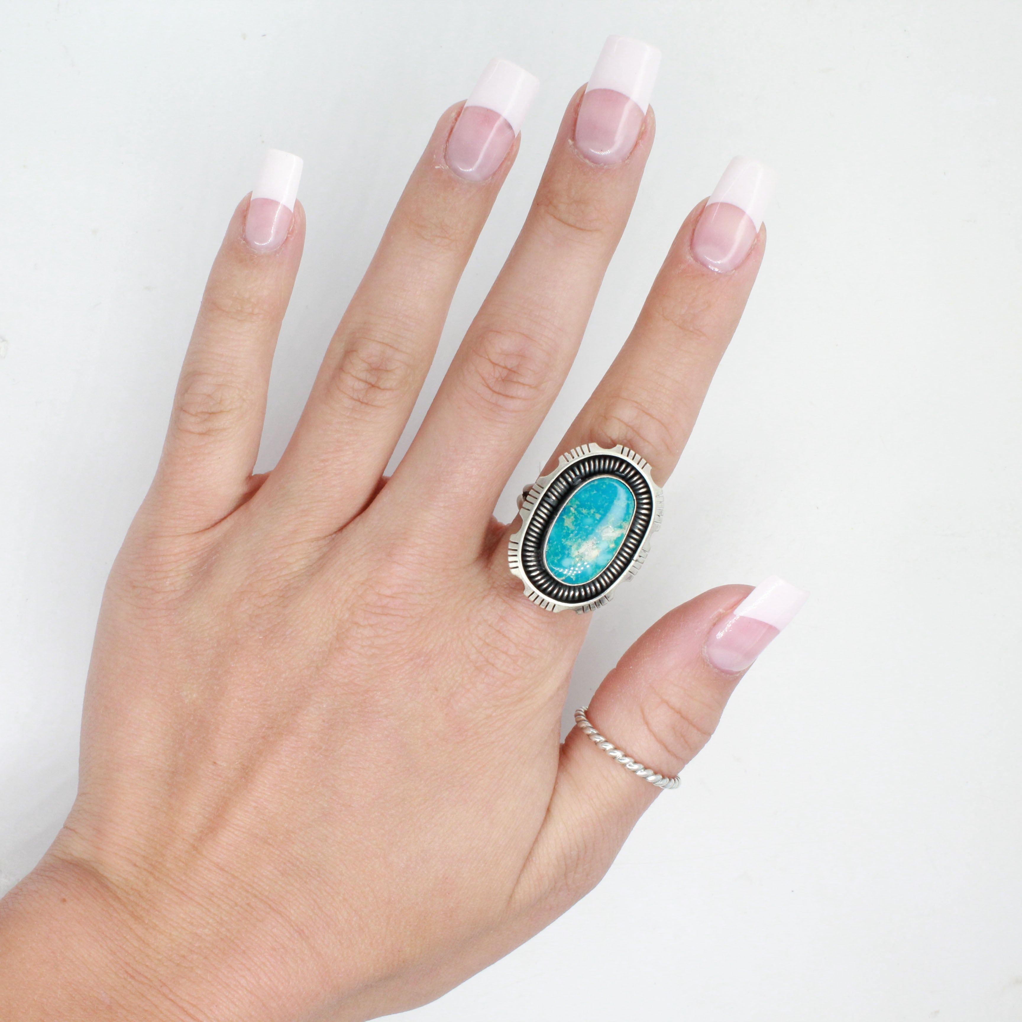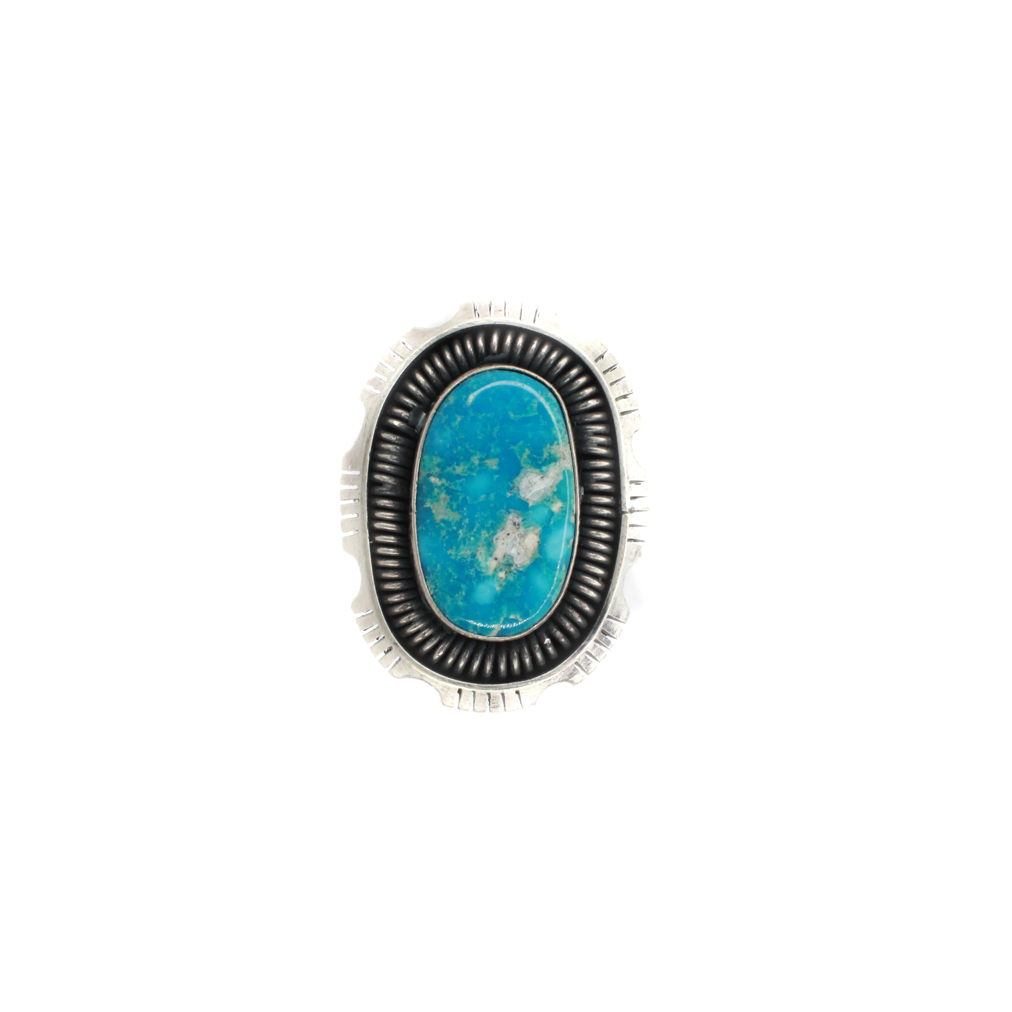 Eli Skeets is renowned as a master silversmith, distinguished by his hallmark oxidized silver borders that beautifully frame stunning turquoise stones. His craftsmanship results in remarkable pieces that are true works of art. One standout creation is a statement ring that not only captivates the eye but is also destined to be a cherished treasure for generations to come.