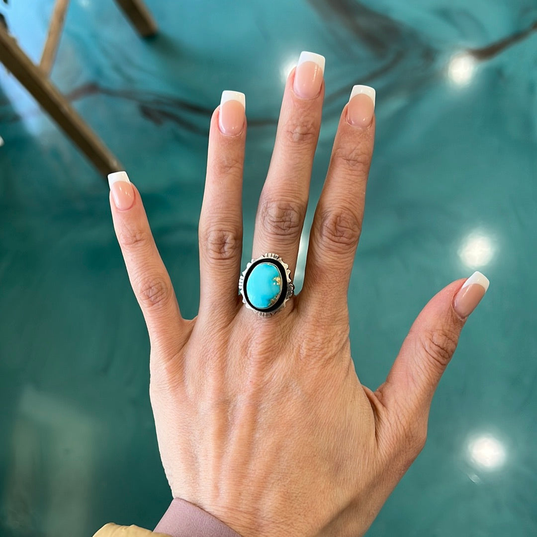 Eli Skeets is renowned as a master silversmith, distinguished by his hallmark oxidized silver borders that beautifully frame stunning turquoise stones. His craftsmanship results in remarkable pieces that are true works of art. One standout creation is a statement ring that not only captivates the eye but is also destined to be a cherished treasure for generations to come.