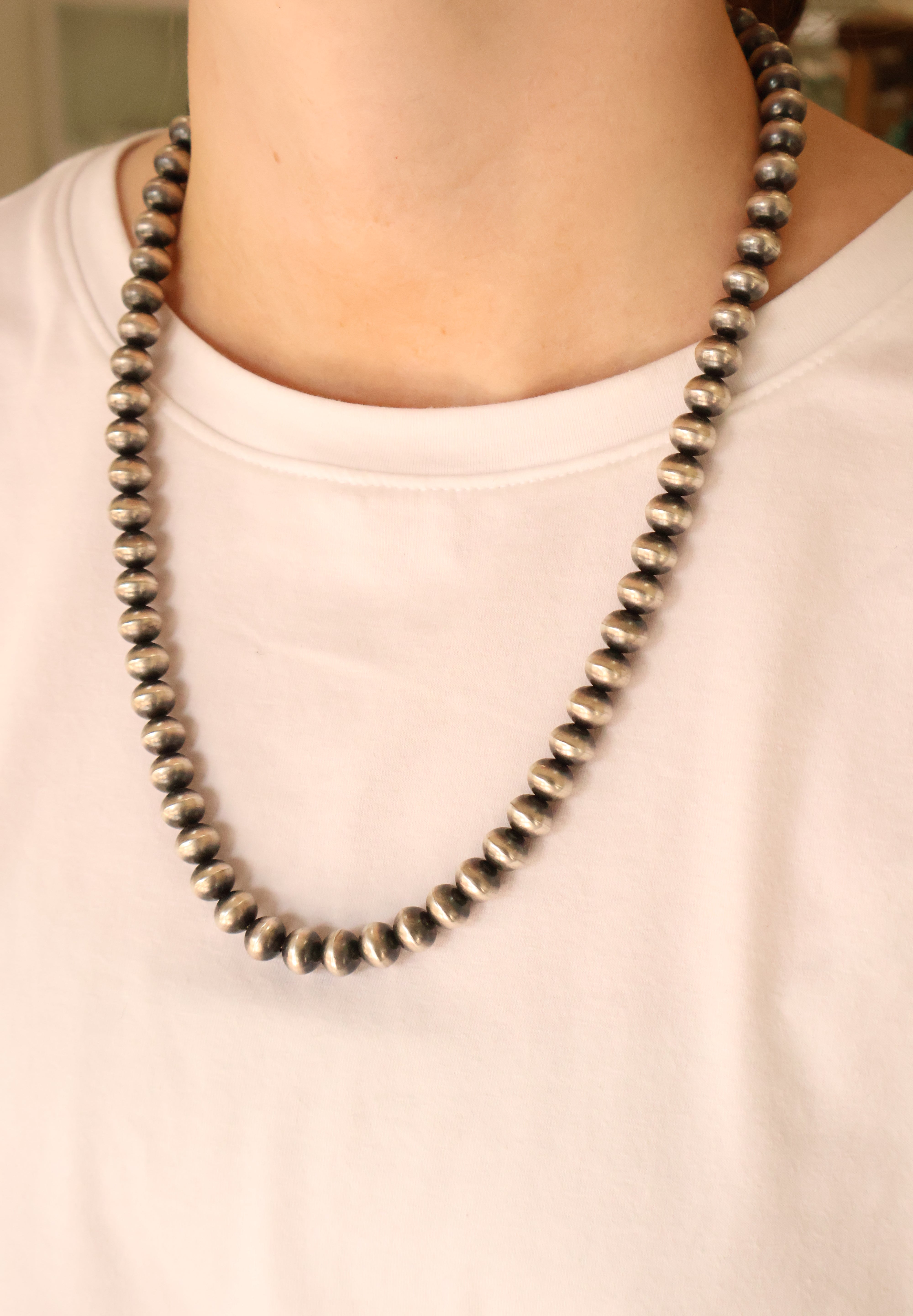 Creating hand-rolled silver beads is a celebrated tradition among Navajo silversmiths and an icon of Navajo jewelry. Handmade beads are meticulously crafted, with each bead being the result of an extremely labor-intensive process. These beads are shaped by hand using tools such as hammers, pliers, and files. The lengthy process includes melting, rolling, cutting, shaping, soldering & filing each sterling silver bead by BY HAND. This meticulous time honored method is a highly skilled trade that few artists have mastered.