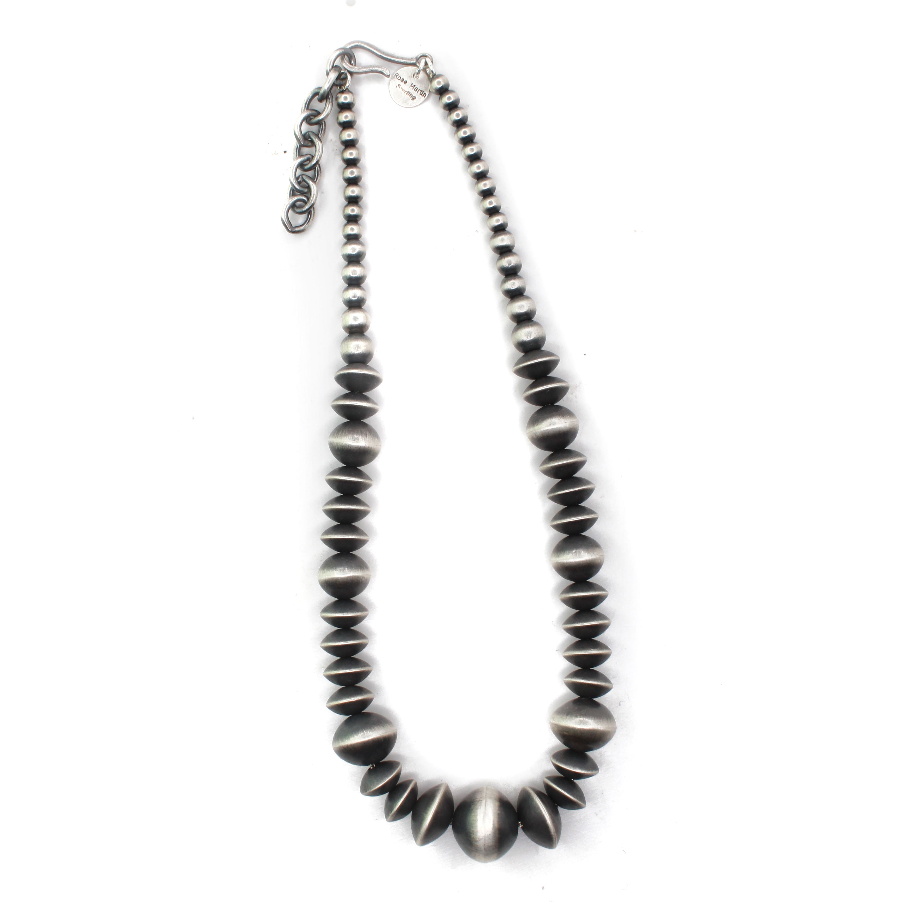 Creating hand-rolled silver beads is a celebrated tradition among Navajo silversmiths and an icon of Navajo jewelry. Handmade beads are meticulously crafted, with each bead being the result of an extremely labor-intensive process. These beads are shaped by hand using tools such as hammers, pliers, and files. The lengthy process includes melting, rolling, cutting, shaping, soldering & filing each sterling silver bead by BY HAND. This meticulous time honored method is a highly skilled trade that few artists have mastered.