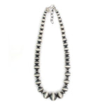 Creating hand-rolled silver beads is a celebrated tradition among Navajo silversmiths and an icon of Navajo jewelry. Handmade beads are meticulously crafted, with each bead being the result of an extremely labor-intensive process. These beads are shaped by hand using tools such as hammers, pliers, and files. The lengthy process includes melting, rolling, cutting, shaping, soldering & filing each sterling silver bead by BY HAND. This meticulous time honored method is a highly skilled trade that few artists have mastered.