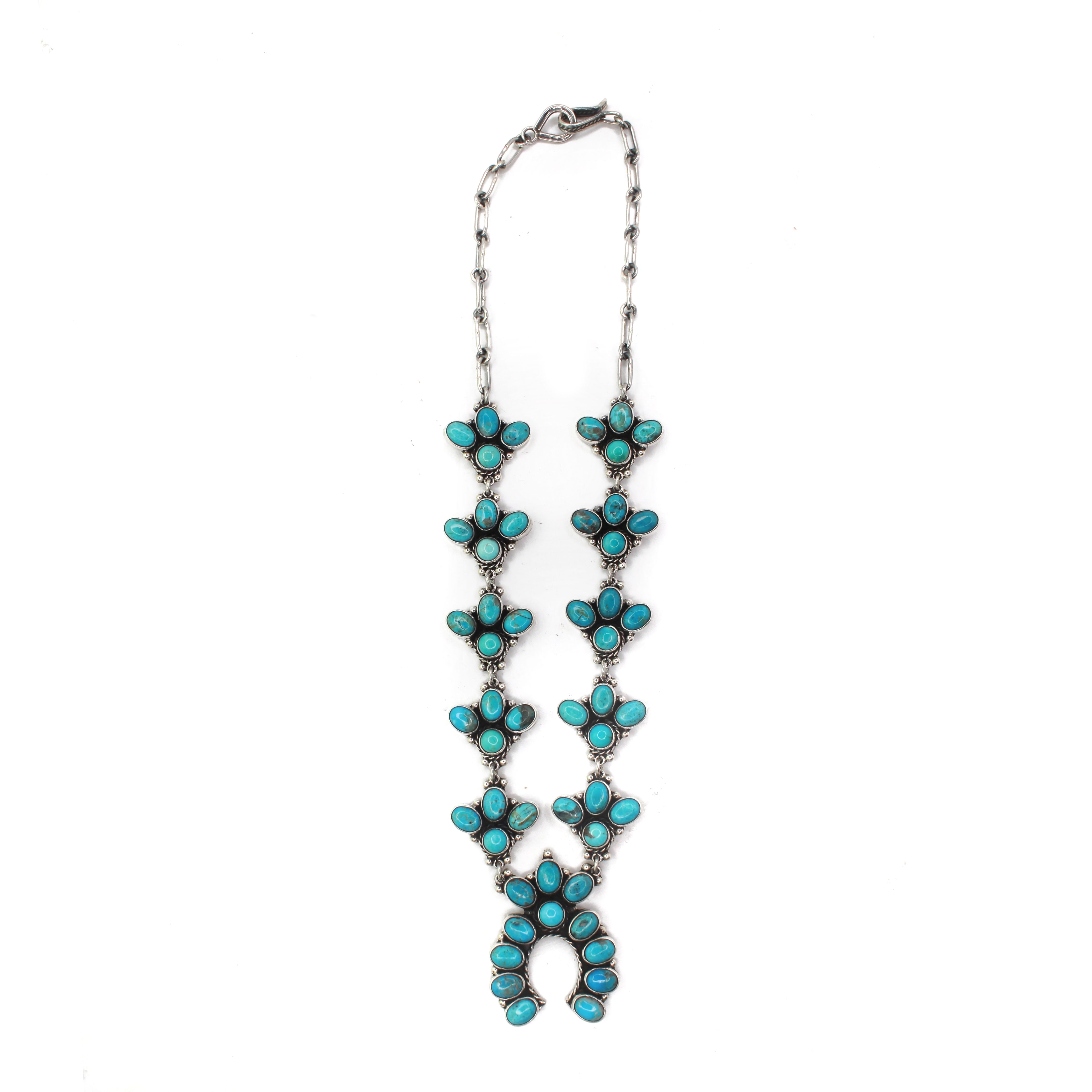 The 'end to end' length listed for Squash Blossom necklaces is measured from clasp to hook and does not include the 'drop' of the Naja. For a more accurate length reference, model photos are provided. Additionally, Naja measurements are also included to give a complete view of the necklace's dimensions.