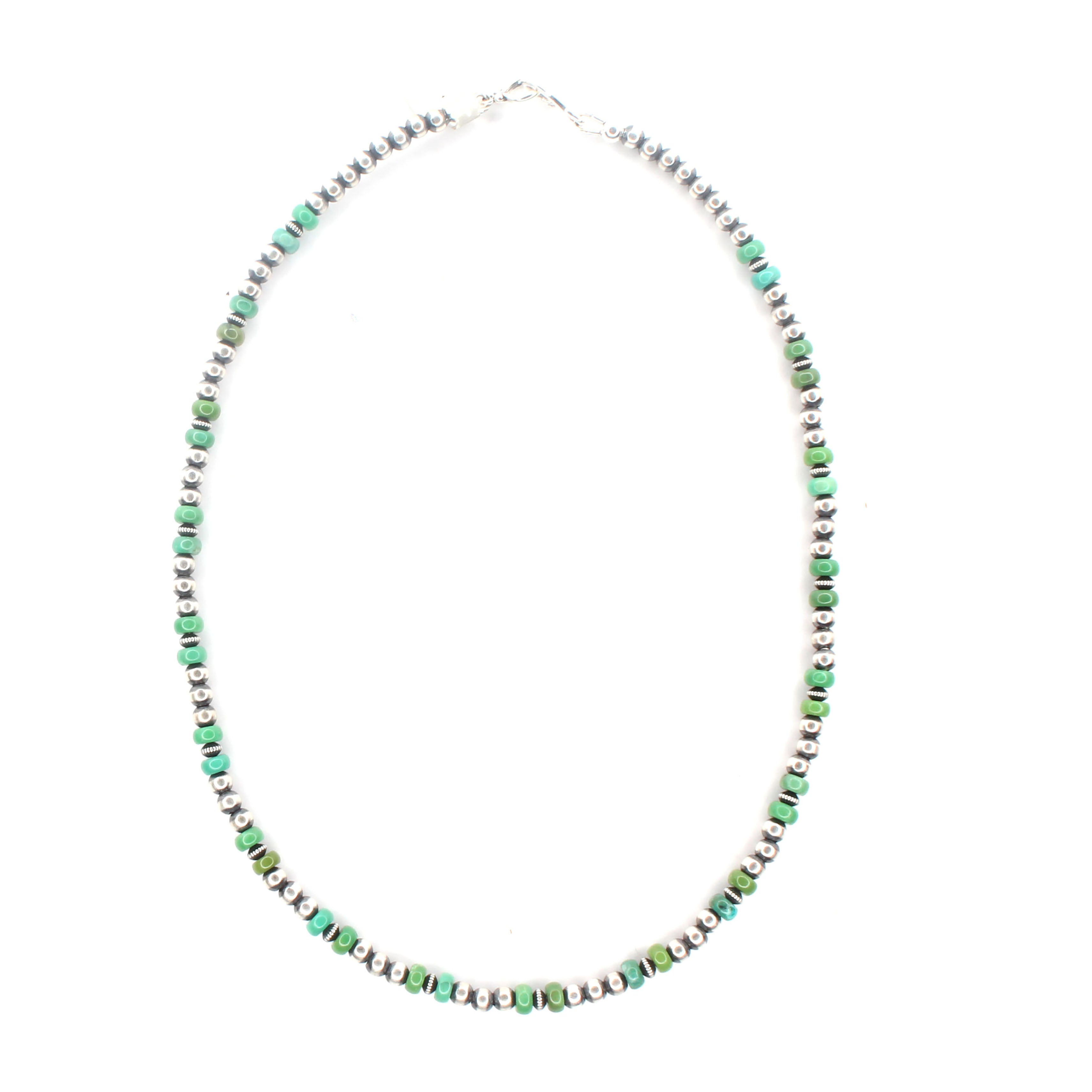 Navajo pearls by Marilyn Platero are a stunning blend of traditional style and contemporary craftsmanship. Known for her impeccable attention to detail, Marilyn strings her pearls on foxtail chain and finishes the ends with soldered clasps for added durability. Her use of machine-made beads provides a uniform and consistent appearance compared to handmade options. The use of machines also allows her to create pearls that range in size from 4mm. Unlike other machine-made beads, Marilyn's have a substantial weight and feel, adding to their quality and appearance. Her beads are oxidized and buffed by hand by Navajo artist Bronson Belone.