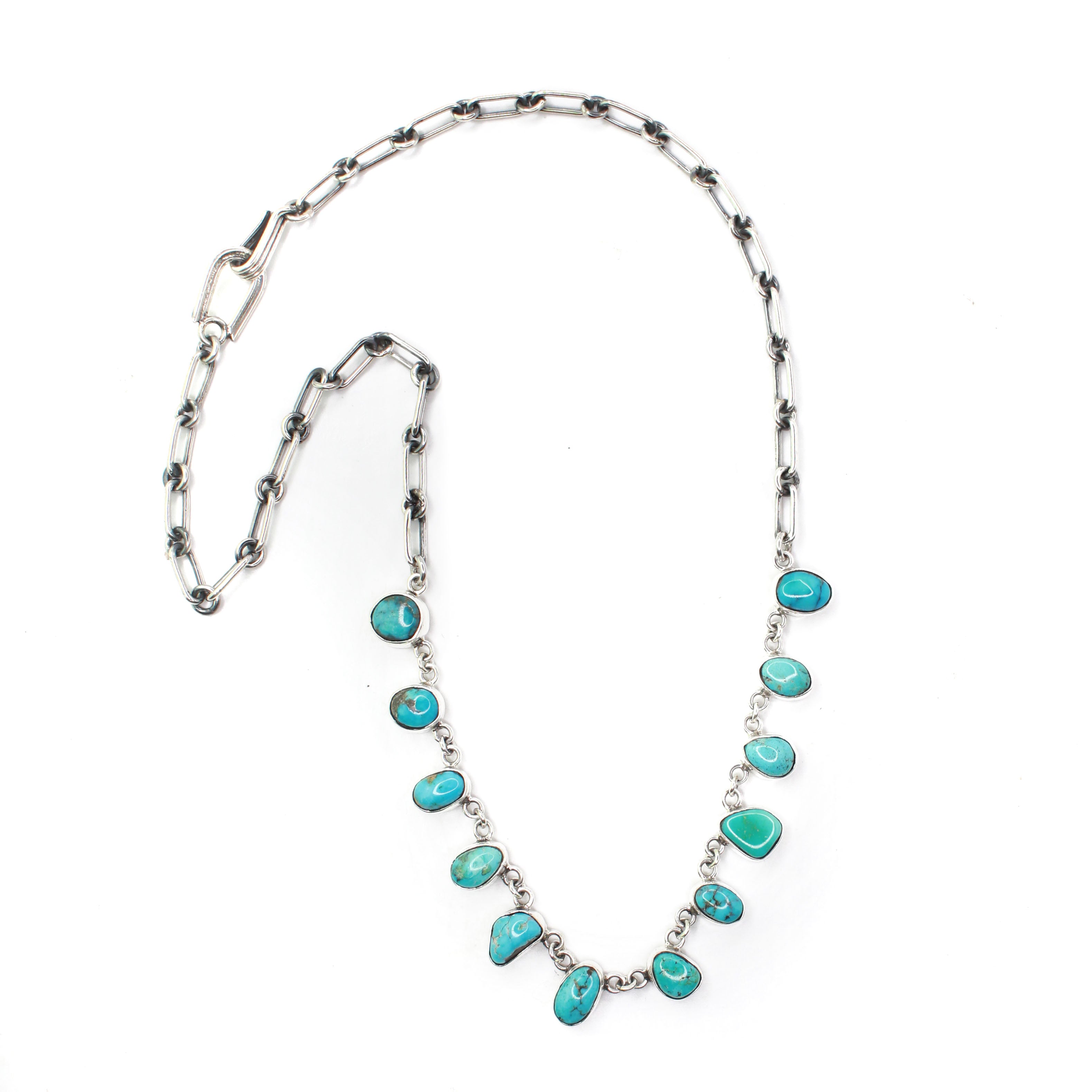 The Kingman Mine, located near Kingman, Arizona, is an active turquoise mine that has been in production since the 1880s, following its discovery by S.A. Colbaugh in the Aztec Mountains. The Colbaugh family continues to mine, process, sort, and distribute Kingman Turquoise. Most Kingman Turquoise is porous and requires processing for jewelry, with only about 3% of the stones being naturally hard enough for direct use. The mine is renowned for its blue matrix turquoise. Read More