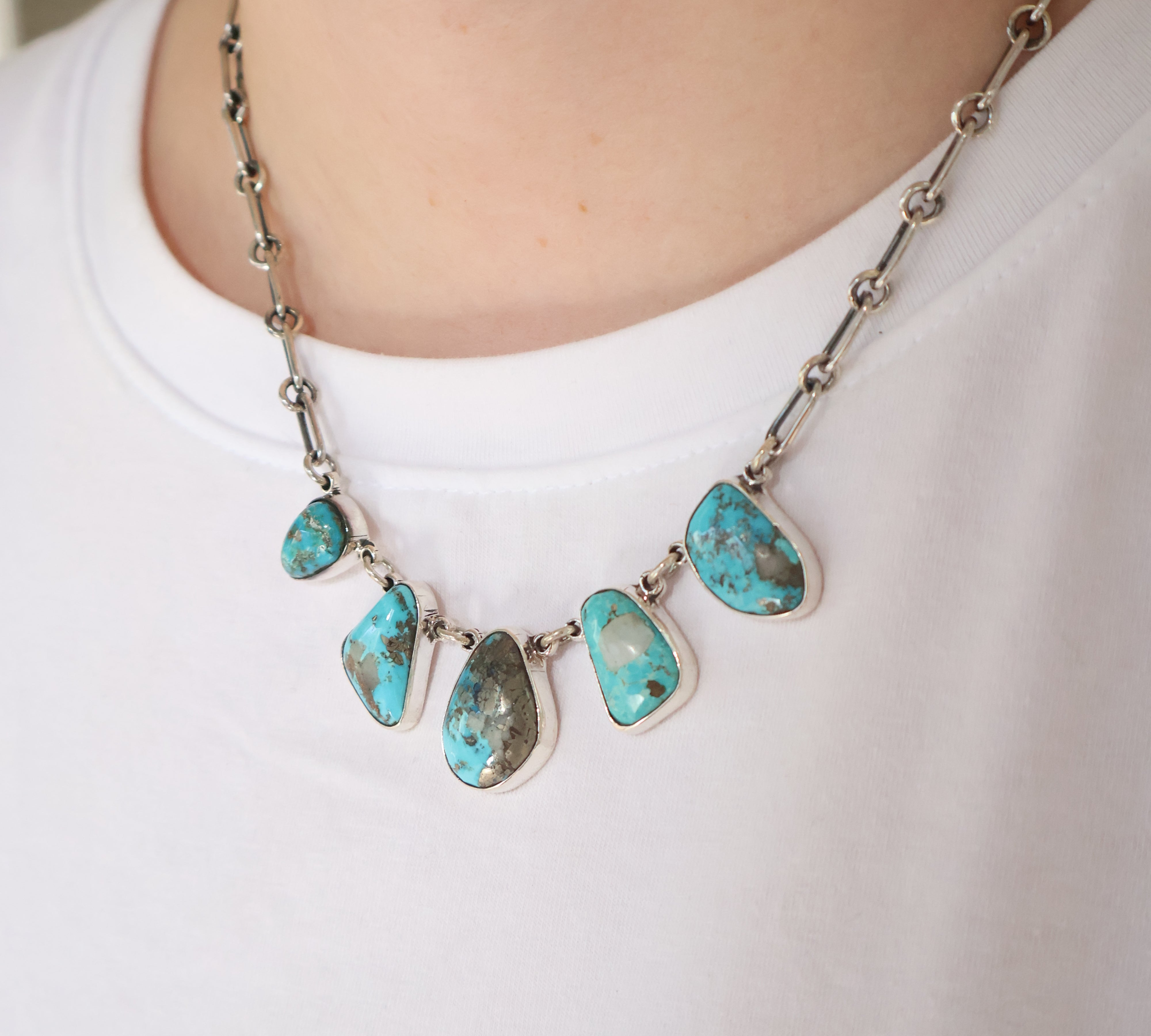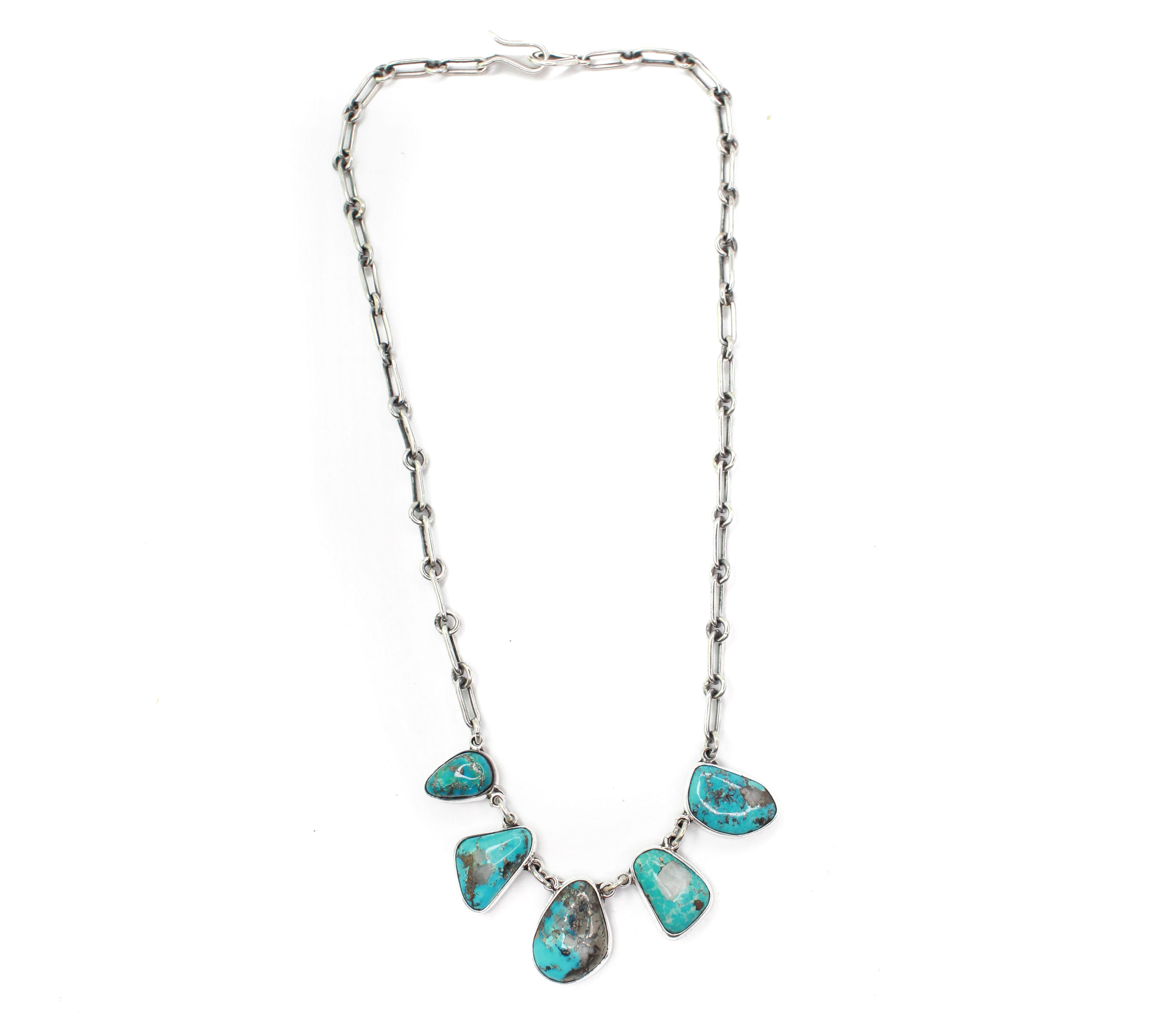 The Kingman Mine is located at The Mineral Park Mines just outside of the of Kingman, Arizona. The Kingman Mine is still in production. Commercial mining of the site began in the 1880s when S.A. Colbaugh discovered the ancient mine, in what was known as the "Aztec Mountains" back then.  At the time Arizona wasn't even a state. Kingman Turquoise is still mined, processed, sorted, graded, and distributed by the Colbaugh Family. Navajo hammers dating back to 600 a.d. and materials used for polishing and finishing turquoise were also discovered at the Kingman Turquoise Mine, along with water skins and charcoal. Archeologists believe that Native Americans would heat the rocks up using charcoal and then douse the hot rock with water from the skins... resulting in the rocks fracturing and exposing the turquoise veins. Most Kingman Turquoise is very porous and requires processing for use in jewelry. Approximately three percent of the stones pulled from the Kingman Turquoise Mine are naturally hard enough to be used unprocessed. Kingman Turquoise sets an industry standard for blue matrix turquoise. The mine became famous for its nuggets, which few mines produce. Today, the Kingman turquoise is highly prized and sought after by collectors everywhere, and it's one of the more easily recognized American Turquoises.