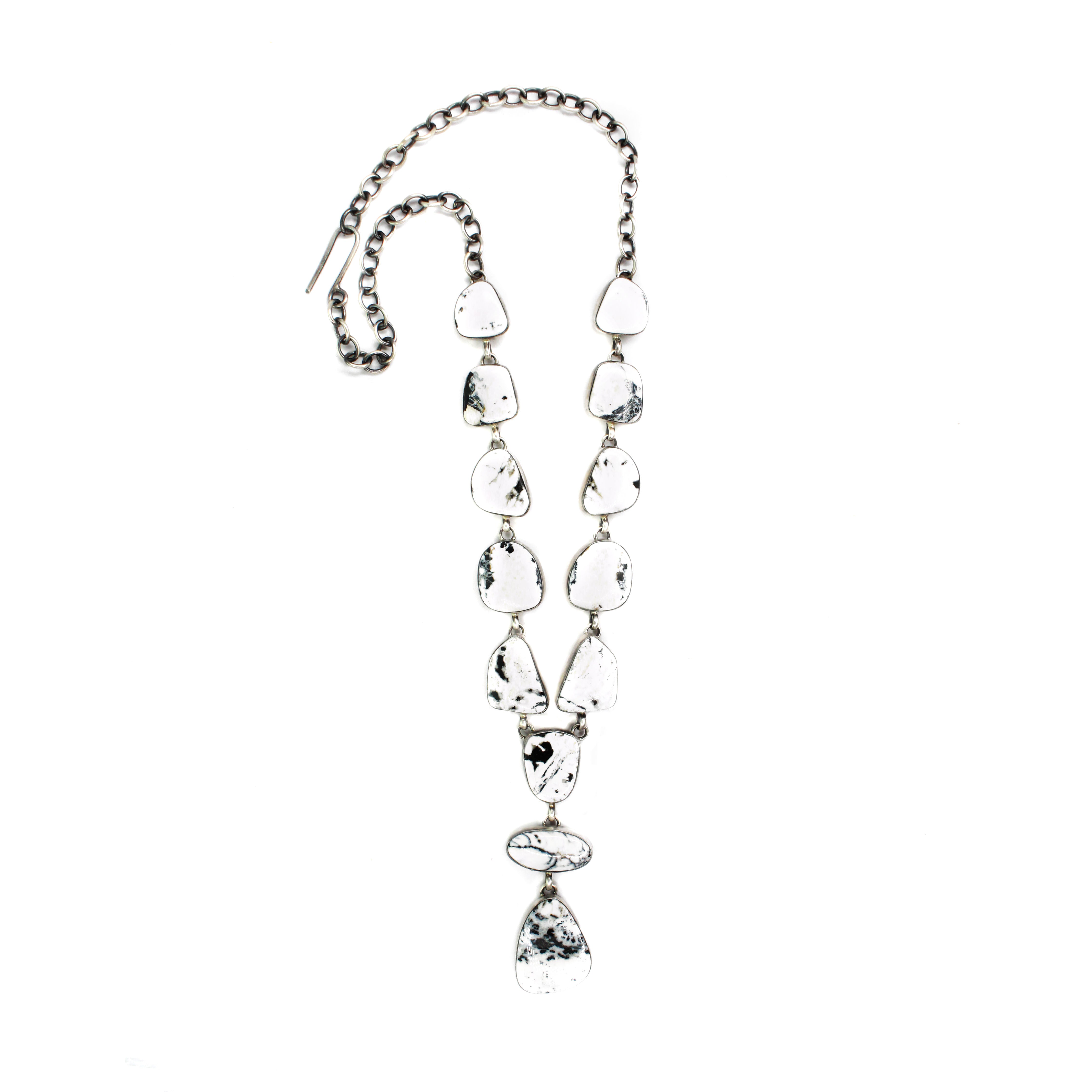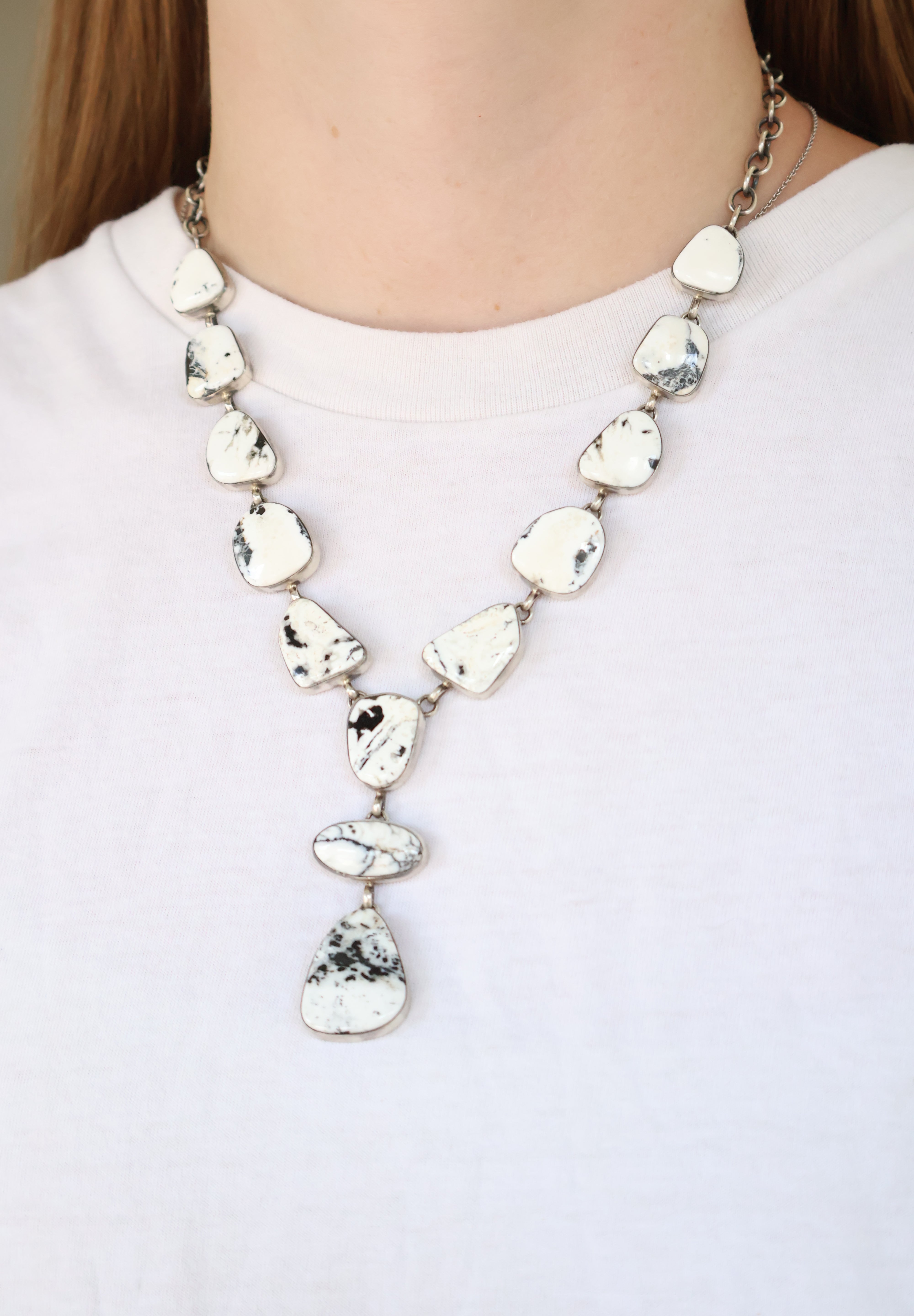 White Buffalo is in fact NOT turquoise. Although White Buffalo is often sold as turquoise, it's classification is actually magnesite and alumite. Its unique coloring comes from the presence of Calcite mineral. The only mine known to be home to White Buffalo is The Dry Creek Mine in Tonopah, NV. It was first discovered by the Otteson family in 1993. The name derives from the Native American belief that white buffaloes are pure and rare like the white buffalo stone. The white stone is surrounded by black and brown flint-like chert which creates beautiful patterns, and sometimes in rare pieces, a spider-web matrix. The stone appears in veins, is as hard as turquoise (Mohs hardness scale of 5.5 to 7.5) and cuts and polishes like turquoise.