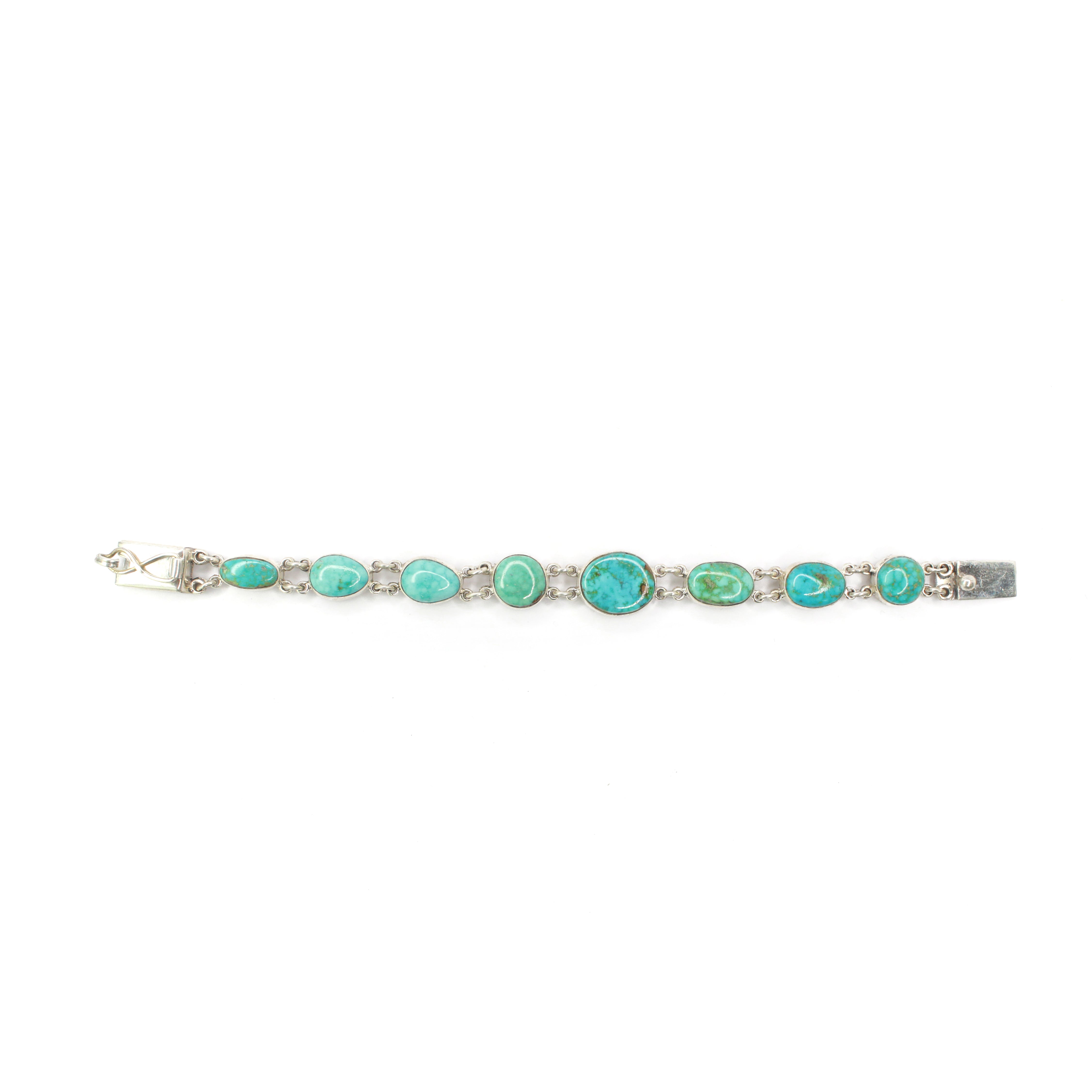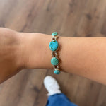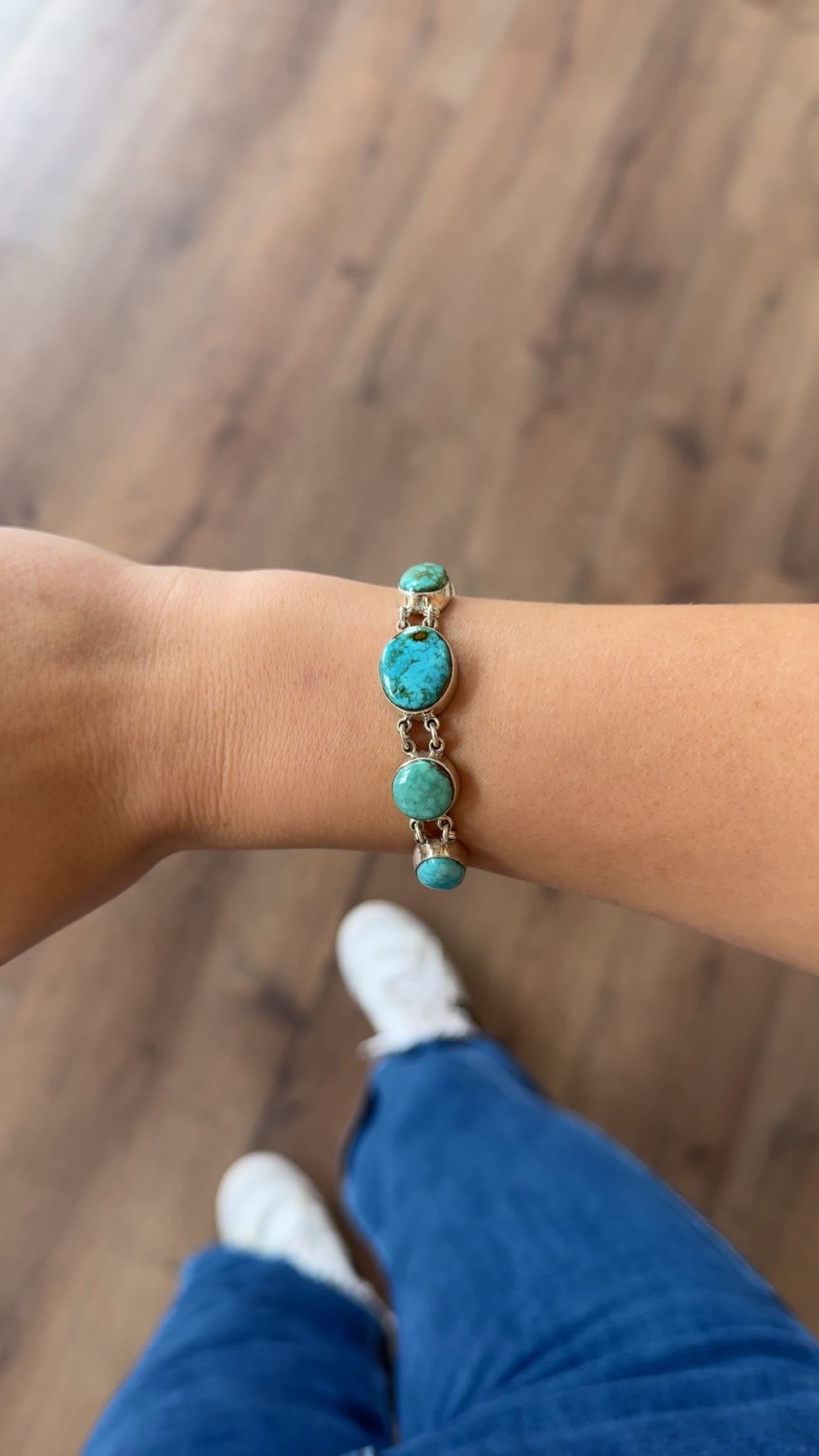 Sonoran turquoise, mined from the Campitos Mountain near Cananea, Sonora, Mexico. This region produces several distinctive types, including Sonoran Gold, known for its vibrant colors like aqua blue, lime, and two-tone blue and green with a golden-brown matrix; Sonoran Rose, a natural bright blue turquoise; and Sonoran Blue, valued for its hardness, shiny pyrite flakes, and black oxide veins.