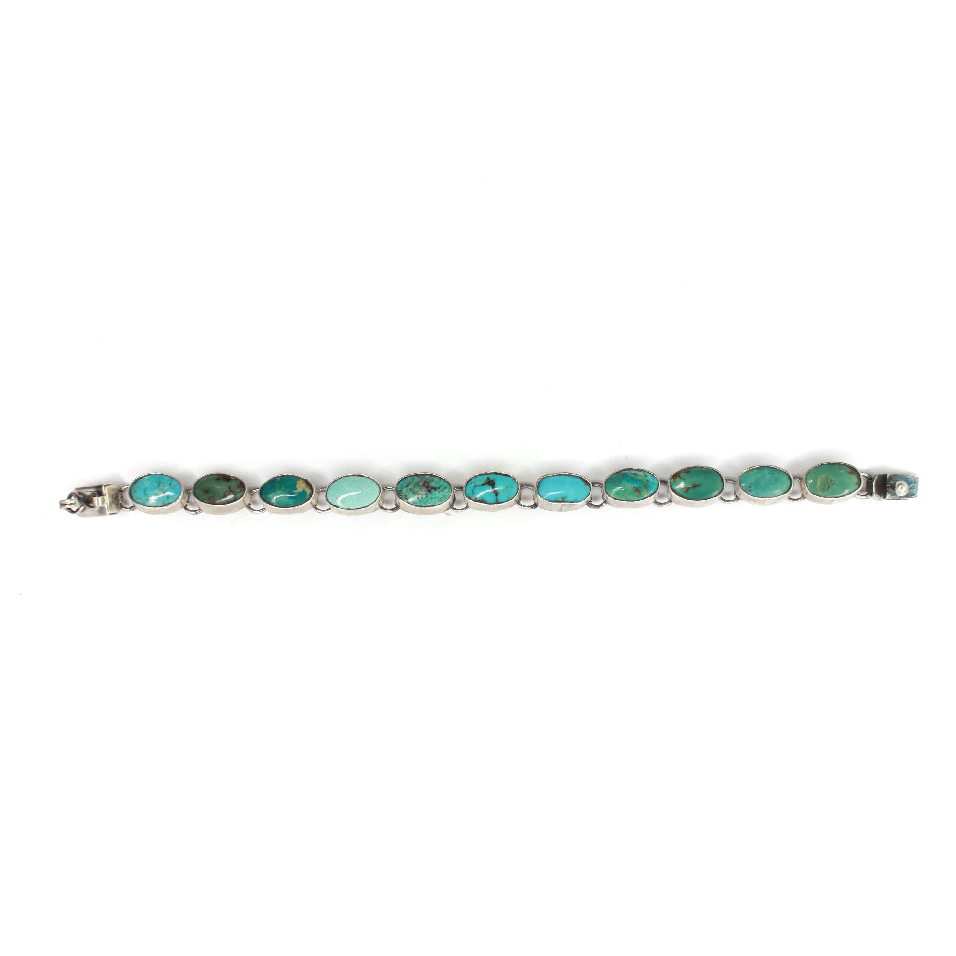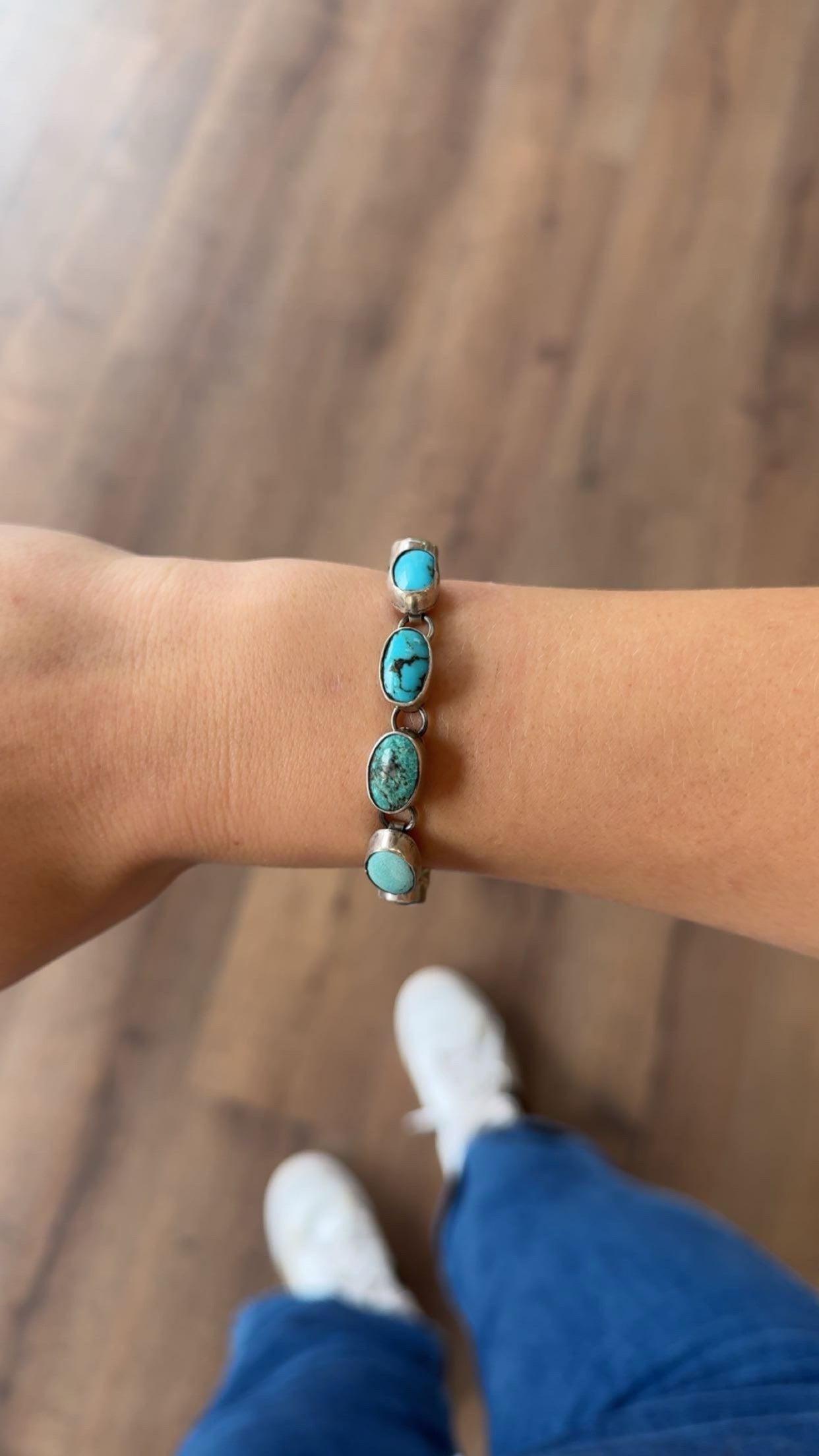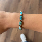 Sonoran turquoise, mined from the Campitos Mountain near Cananea, Sonora, Mexico. This region produces several distinctive types, including Sonoran Gold, known for its vibrant colors like aqua blue, lime, and two-tone blue and green with a golden-brown matrix; Sonoran Rose, a natural bright blue turquoise; and Sonoran Blue, valued for its hardness, shiny pyrite flakes, and black oxide veins.