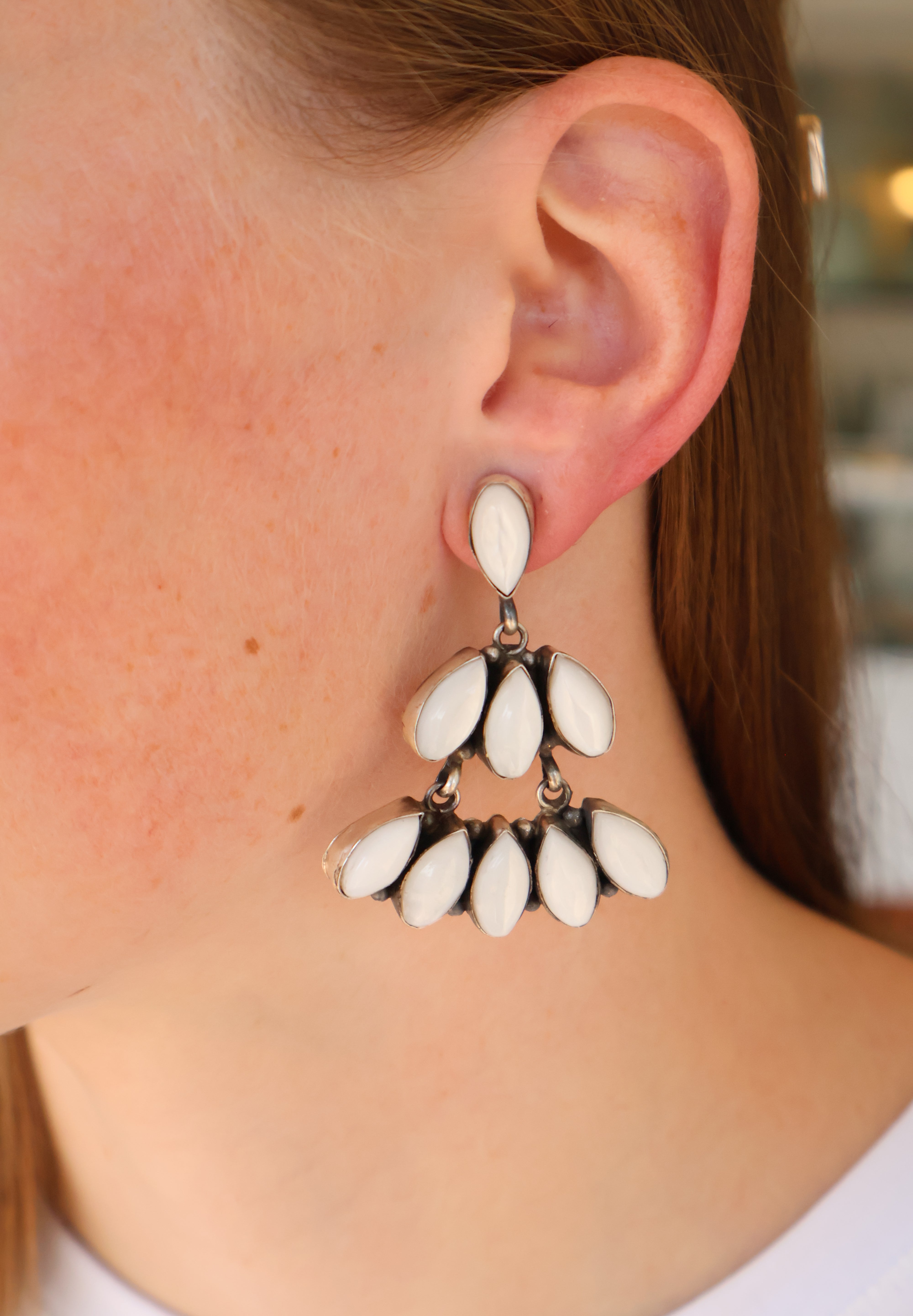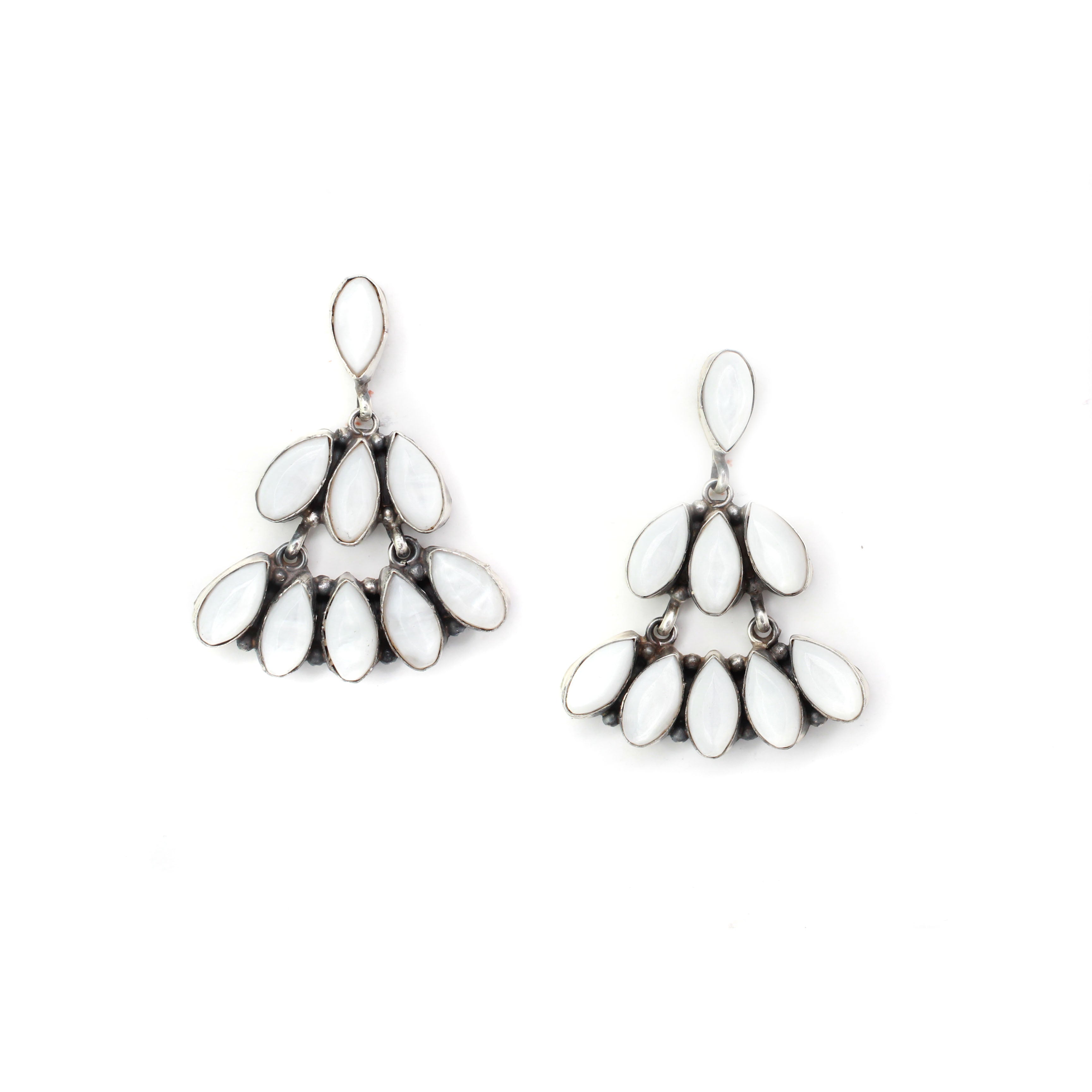 Mother of pearl, also known as nacre, is the iridescent inner layer of certain mollusk shells, such as oysters and abalones. It is composed primarily of aragonite (a form of calcium carbonate) and conchiolin (a protein), giving it a smooth, lustrous appearance. The unique play of colors, ranging from white to various shades of pink, blue, and green, is due to the way light interacts with the layered structure. Native American culture views mother of pearl as a symbol of beauty, protection, and tranquility, which adds deeper meaning to the jewelry.