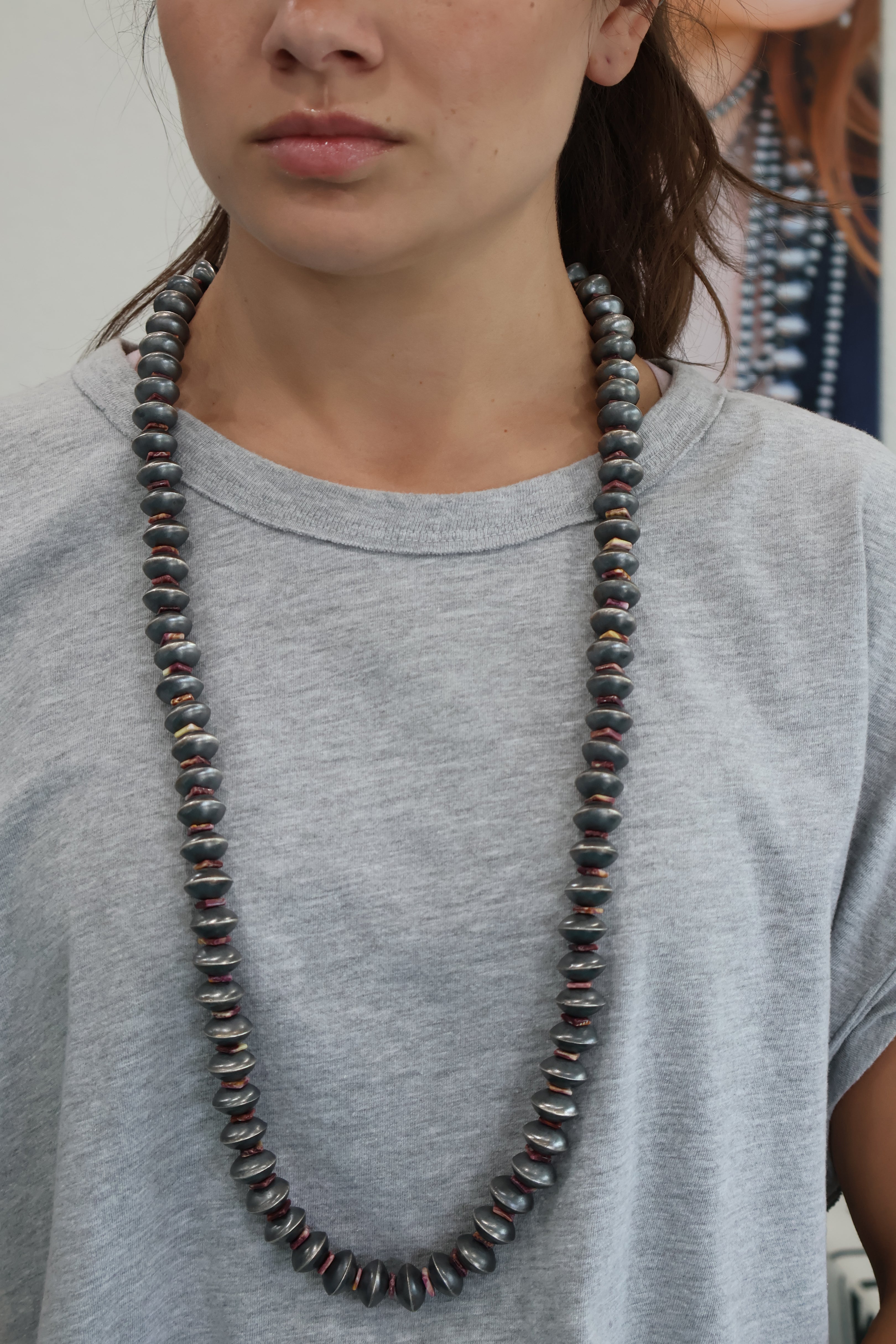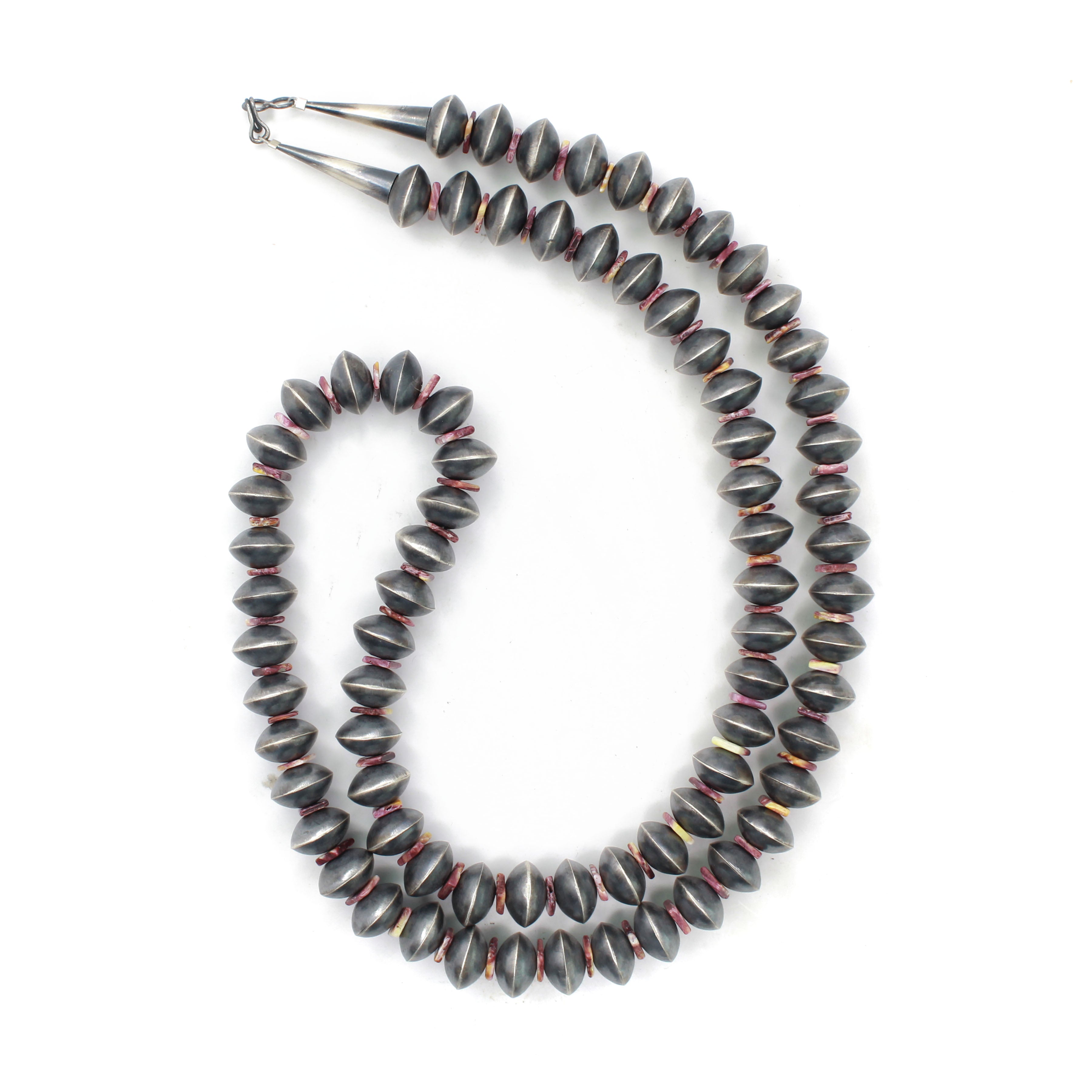 Creating hand-rolled silver beads is a celebrated tradition among Navajo silversmiths and an icon of Navajo jewelry. Handmade beads are meticulously crafted, with each bead being the result of an extremely labor-intensive process. These beads are shaped by hand using tools such as hammers, pliers, and files. The lengthy process includes melting, rolling, cutting, shaping, soldering & filing each sterling silver bead by BY HAND. This meticulous time honored method is a highly skilled trade that few artists have mastered.