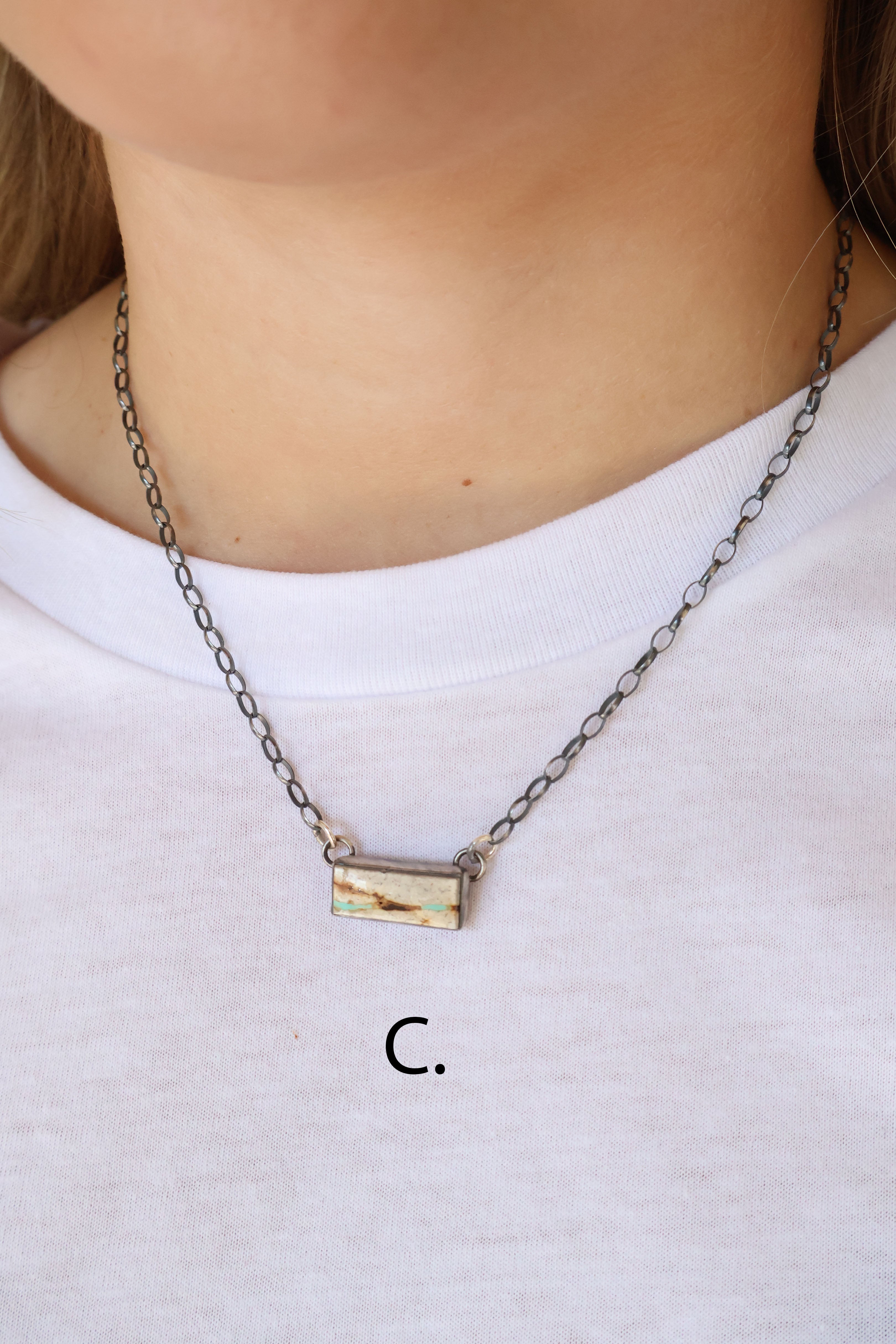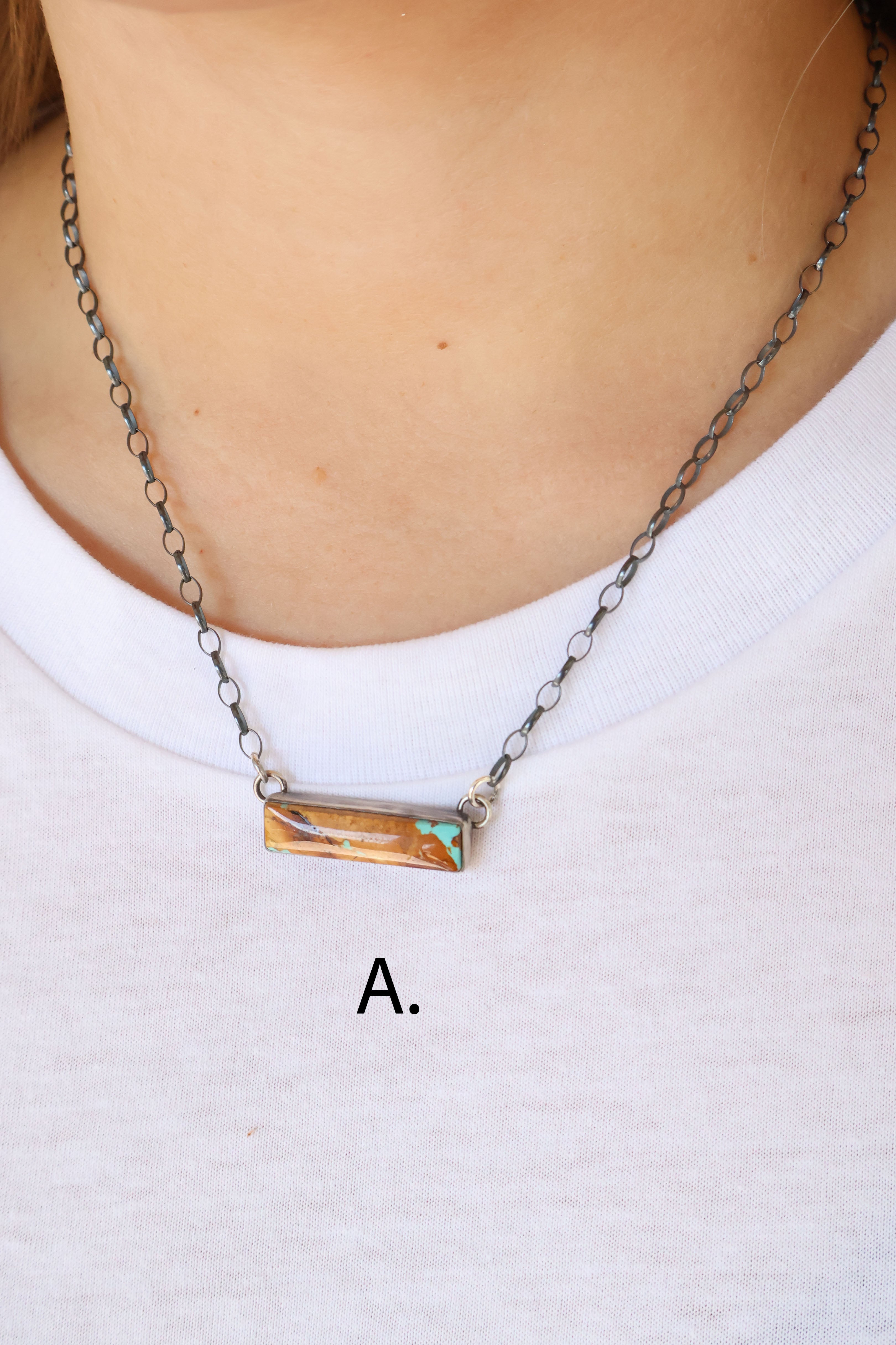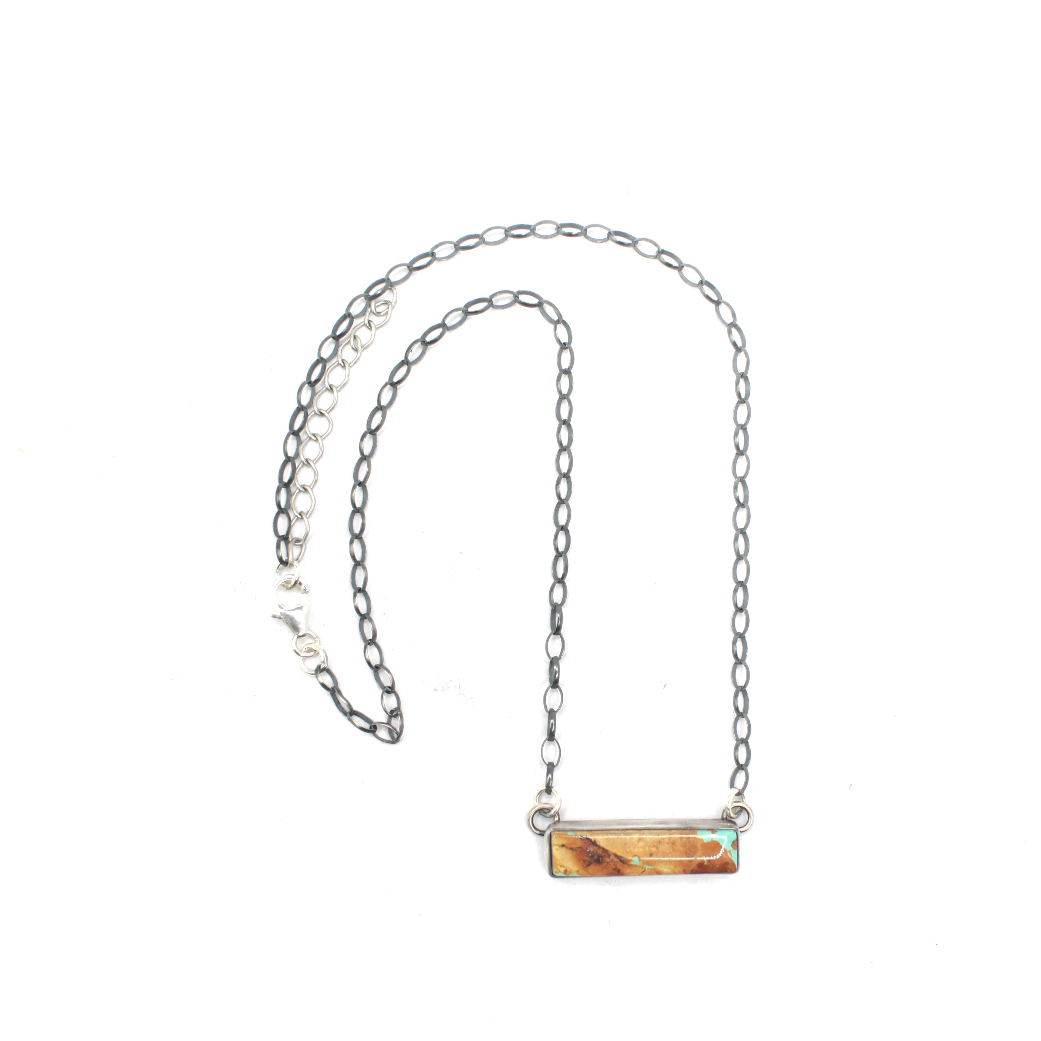 The length listed for bar necklaces is measured from clasp to hook, including the width of the bar. This total length does not directly reflect how the necklace will sit when worn. To more accurately determine where the necklace will sit, subtract the 'bar width' measurement from the 'length end to end" measurement.