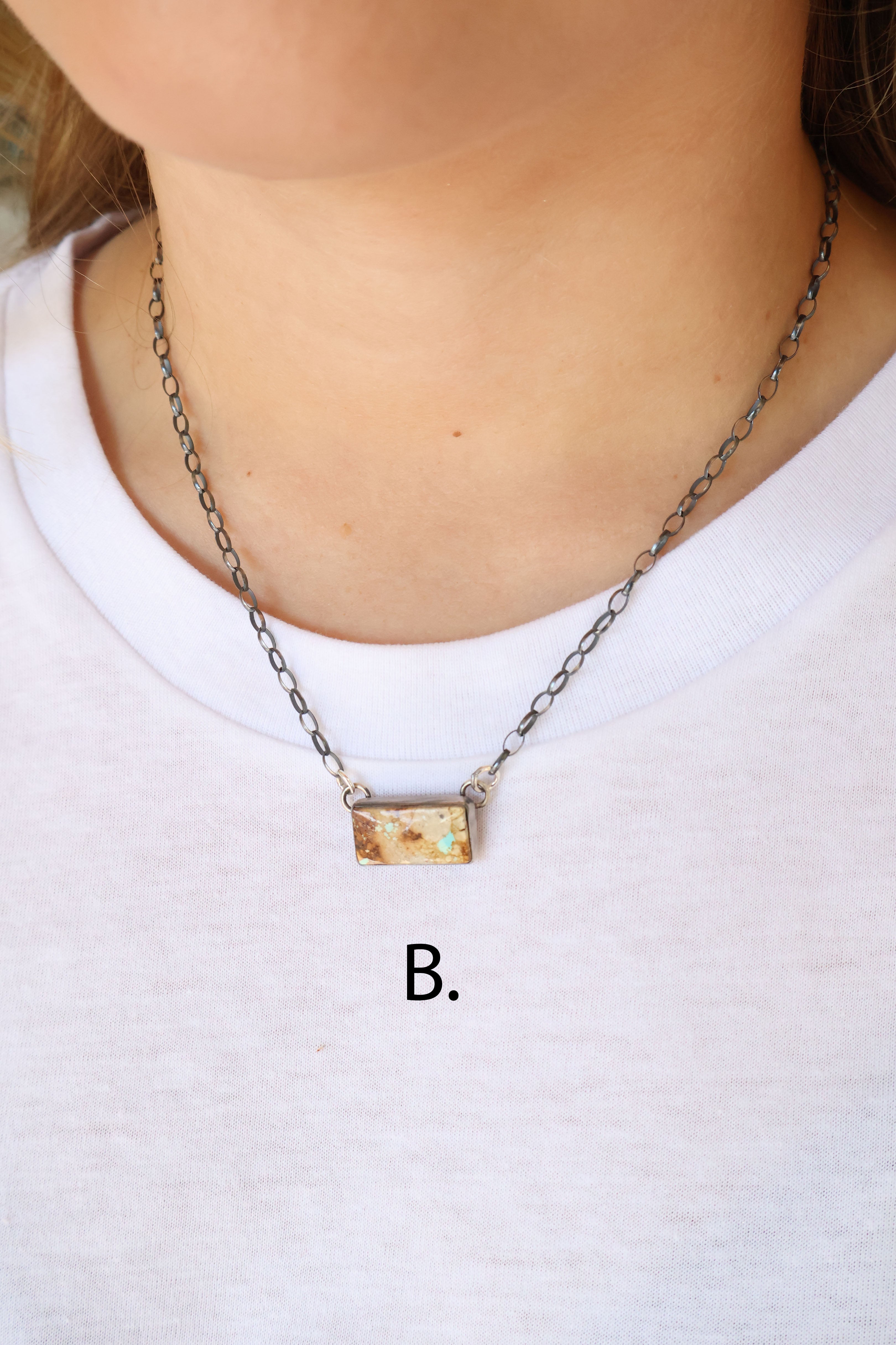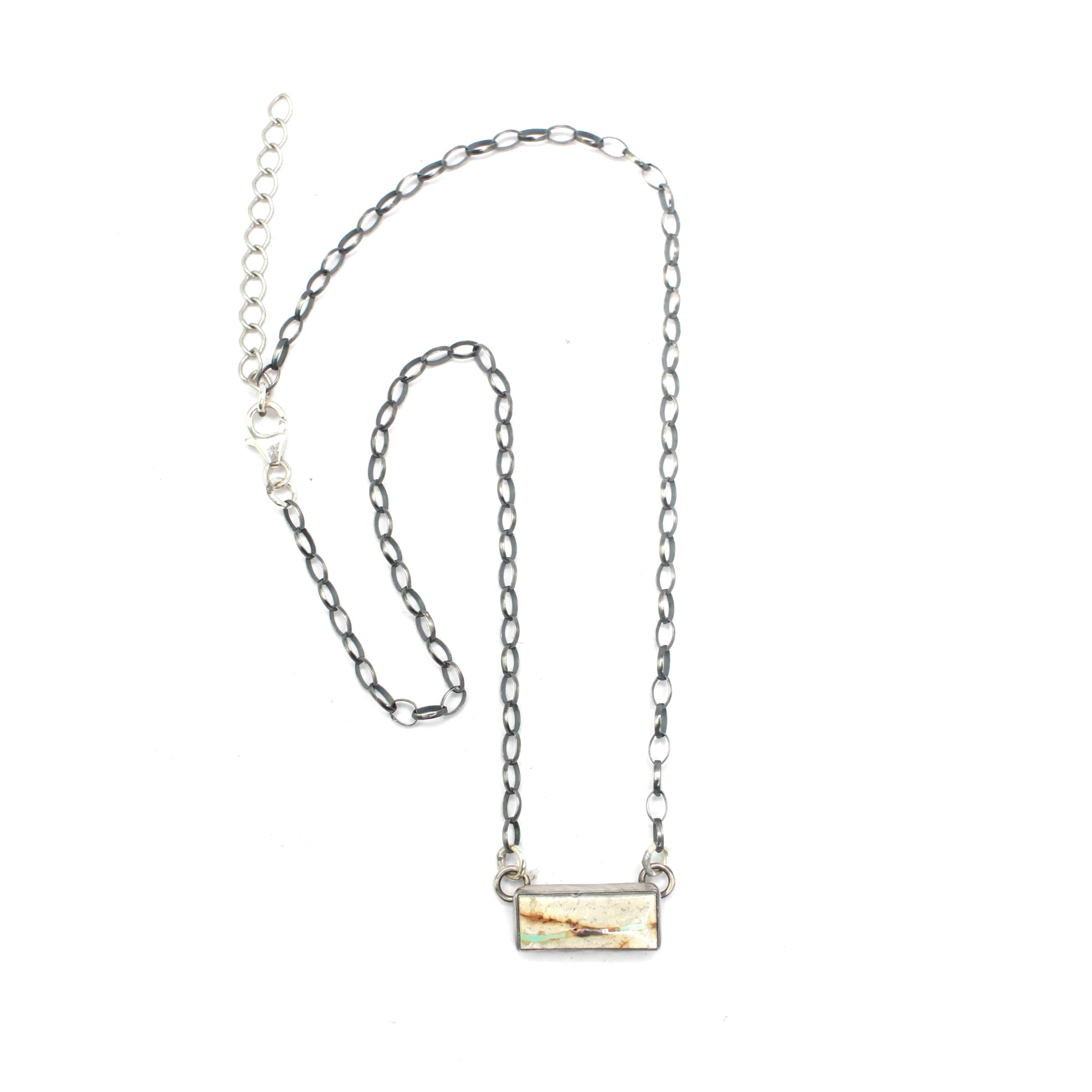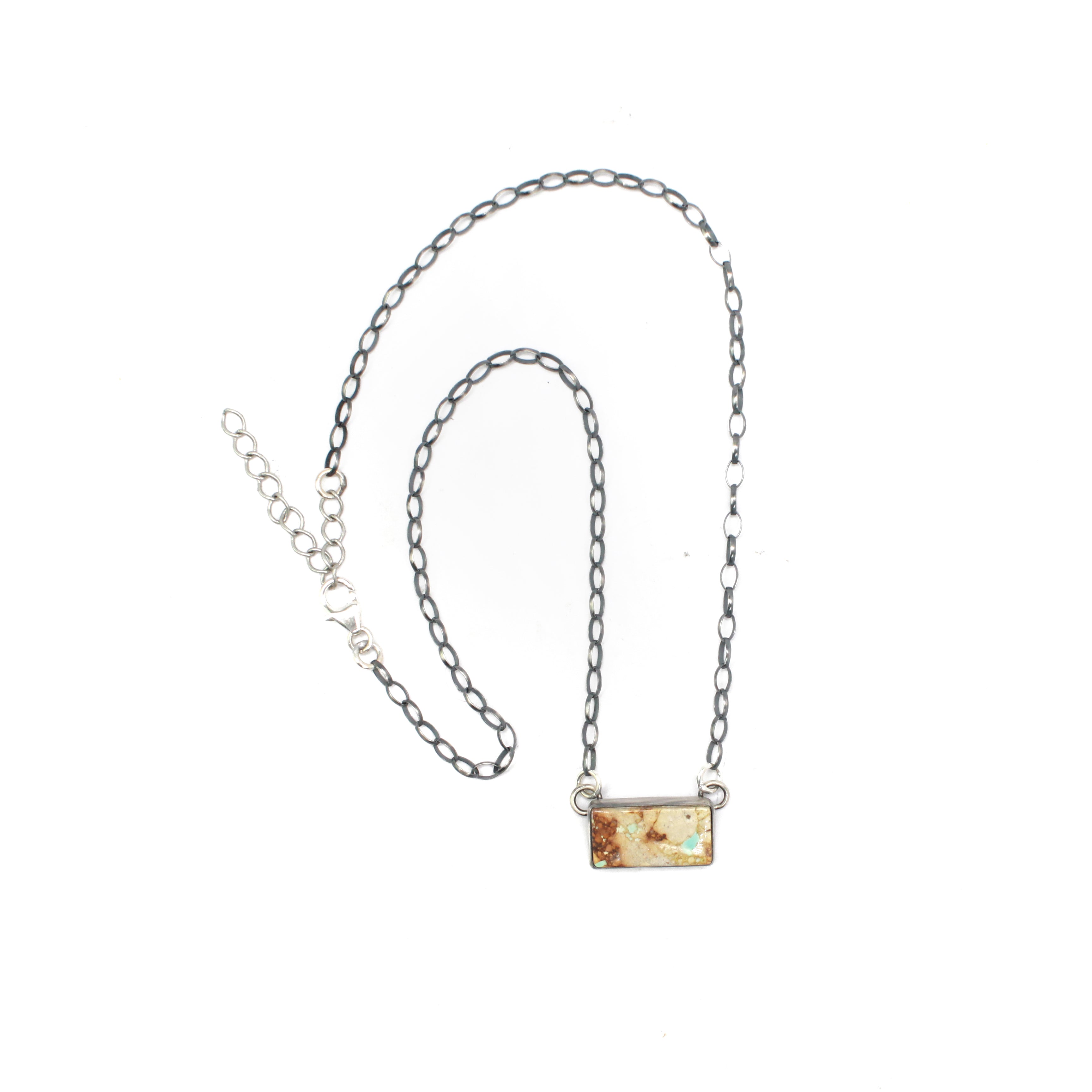 The length listed for bar necklaces is measured from clasp to hook, including the width of the bar. This total length does not directly reflect how the necklace will sit when worn. To more accurately determine where the necklace will sit, subtract the 'bar width' measurement from the 'length end to end" measurement.