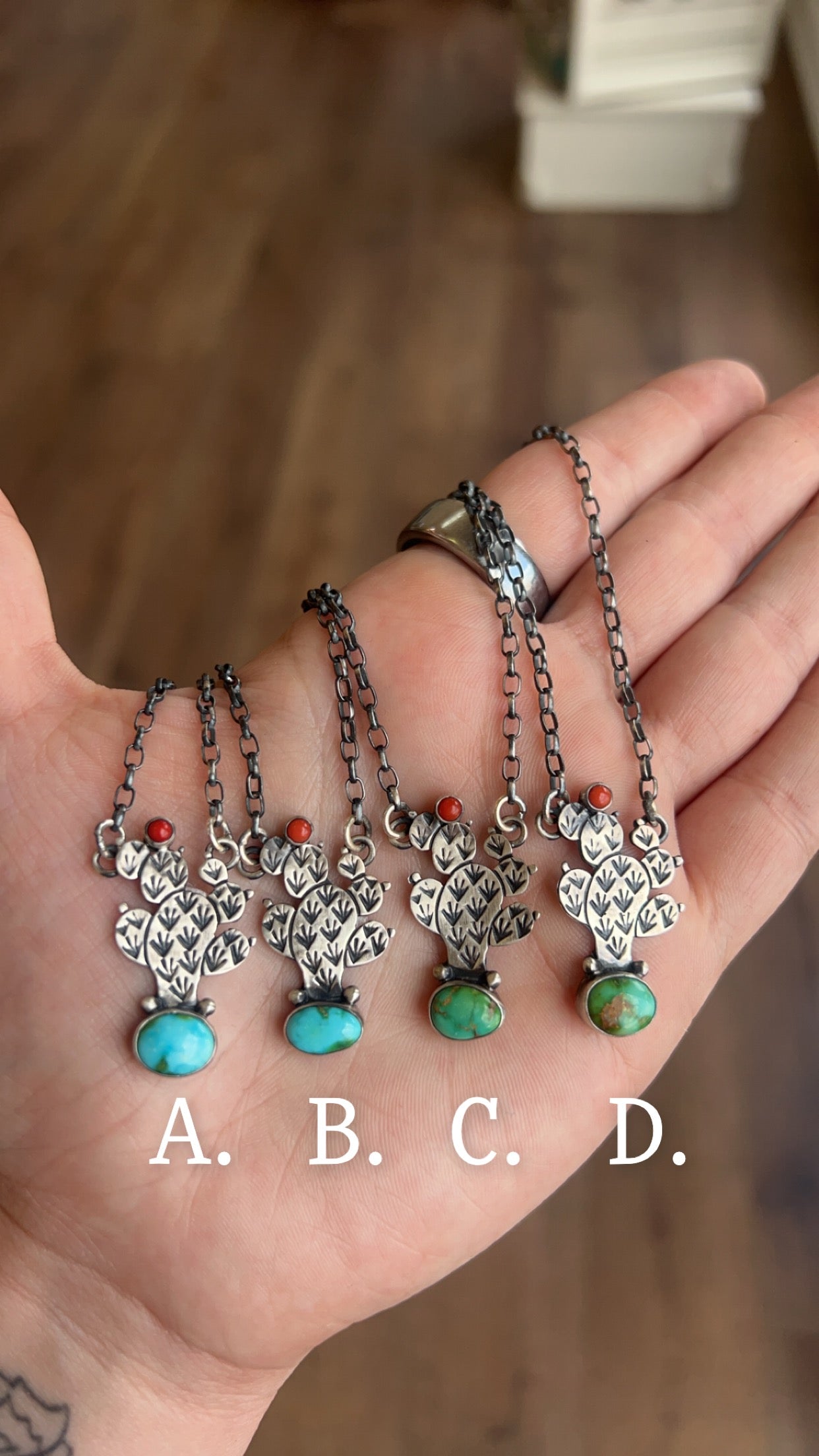 Loretta has a special fondness for turquoise, as it reminds her of her grandmother. Her jewelry style combines traditional techniques with a contemporary twist. She explains that her cluster-style pieces symbolize family, with the center representing the grandparents and the surrounding stones representing their children and grandchildren.