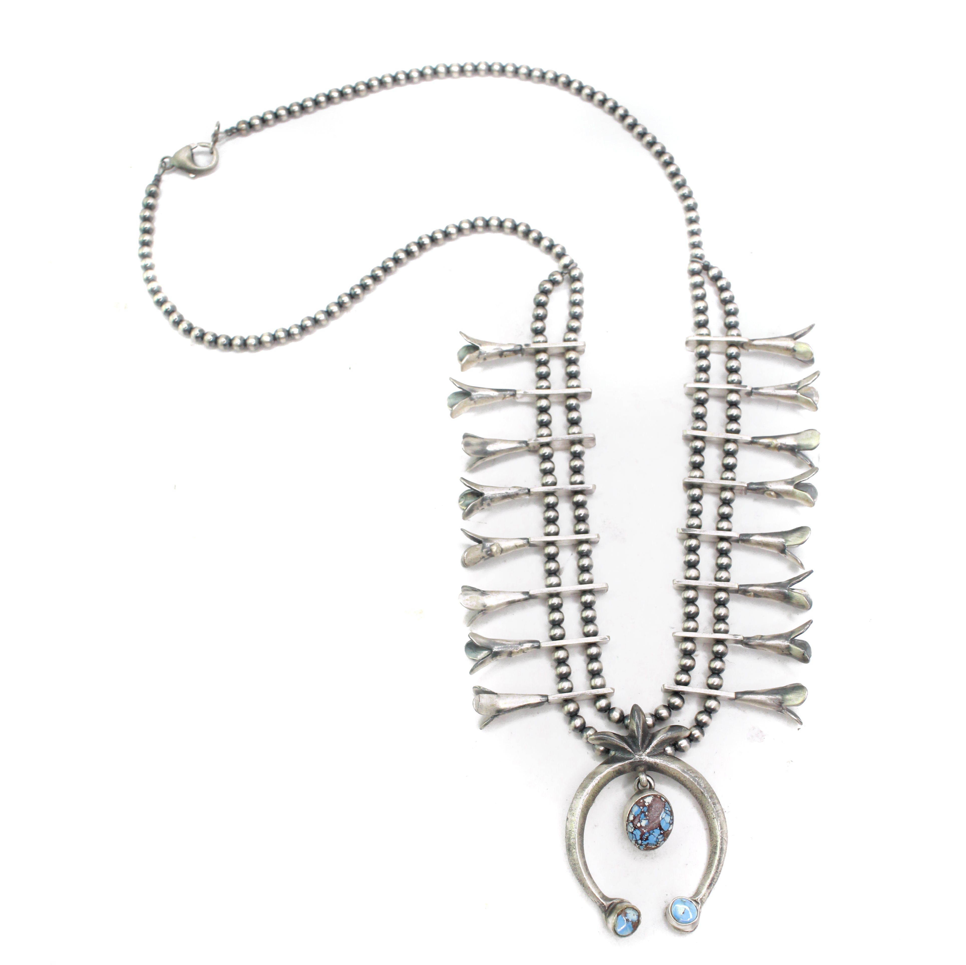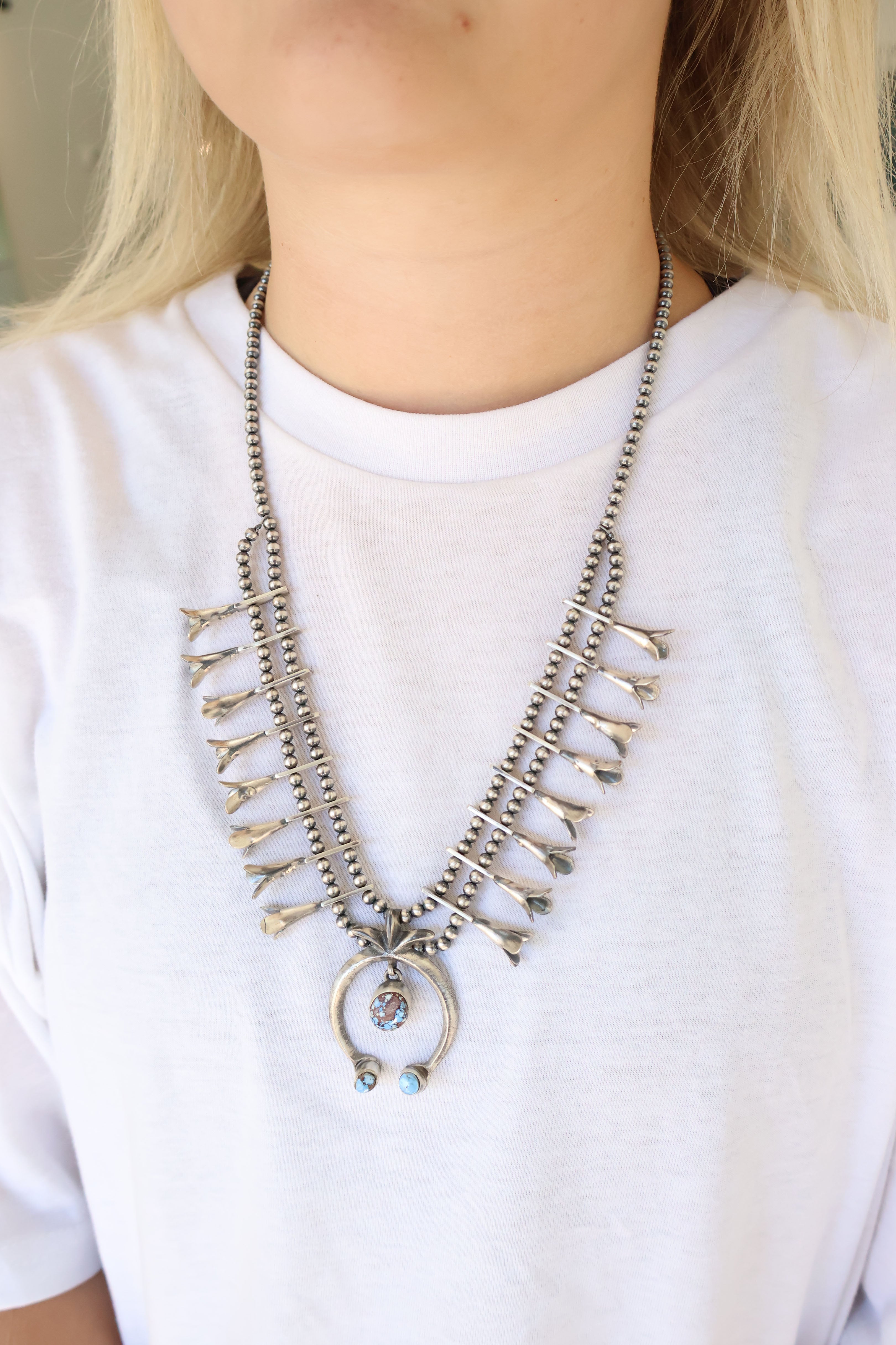 The 'end to end' length listed for Squash Blossom necklaces is measured from clasp to hook and does not include the 'drop' of the Naja. For a more accurate length reference, model photos are provided. Additionally, Naja measurements are also included to give a complete view of the necklace's dimensions.