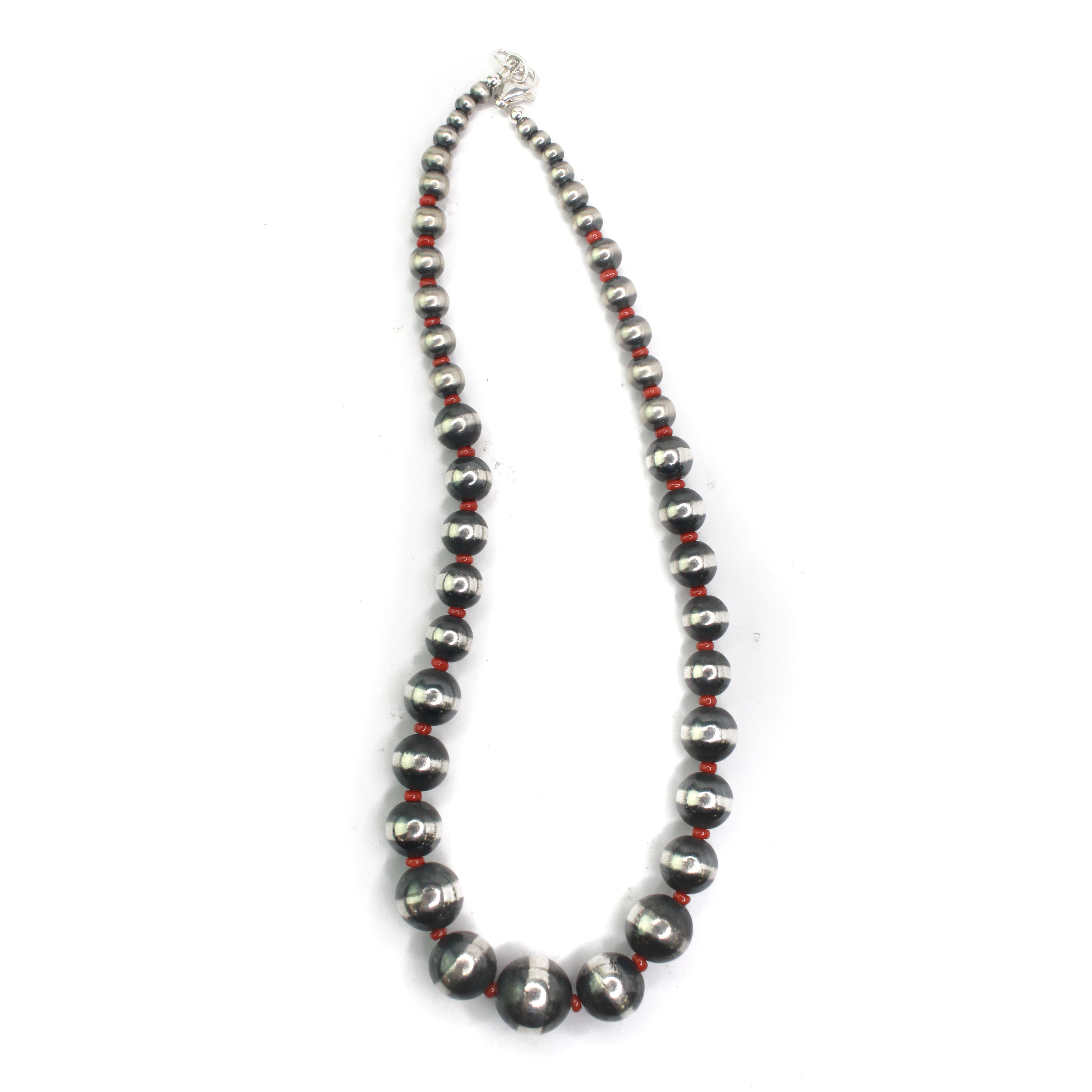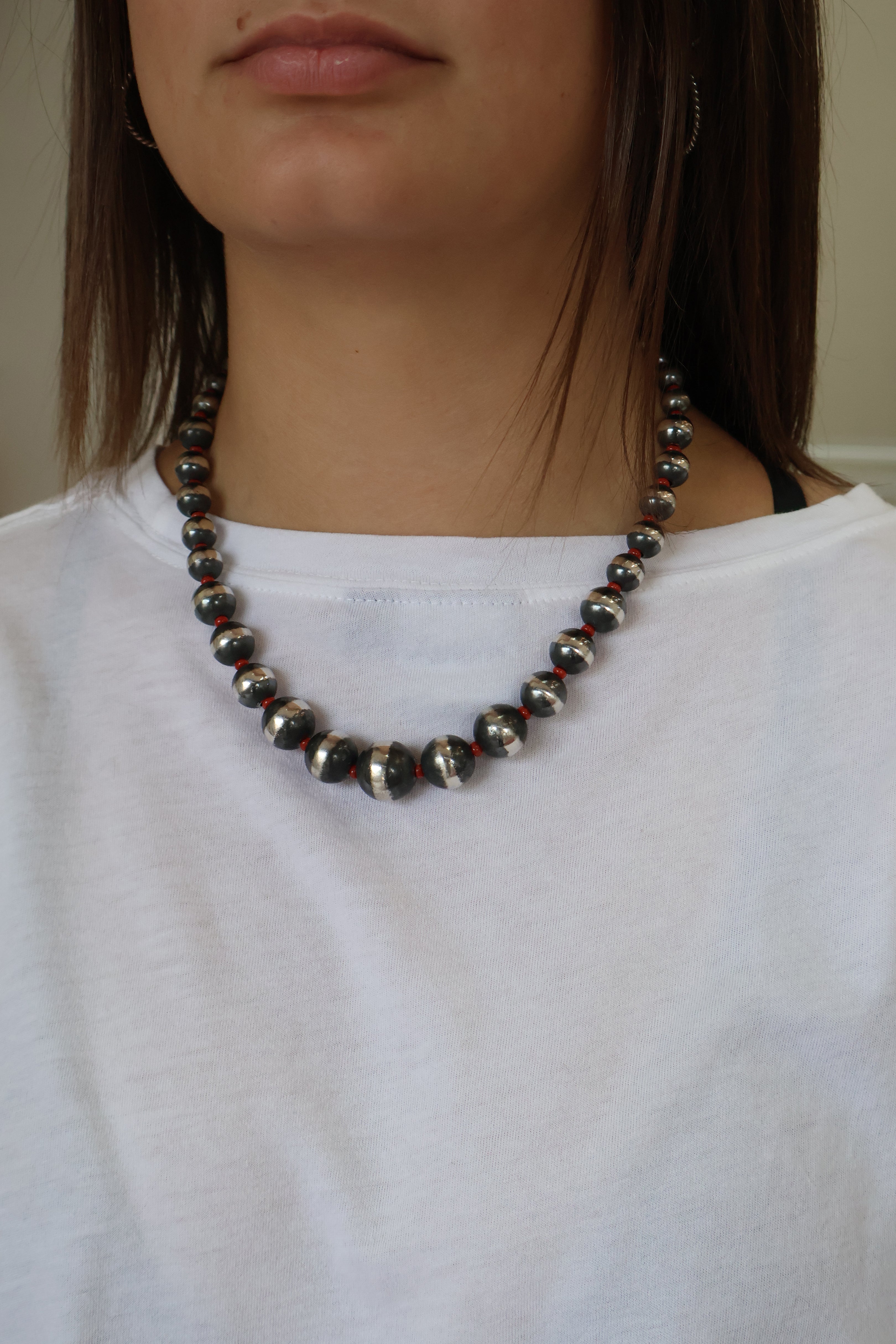 Navajo pearls by Marilyn Platero are a stunning blend of traditional style and contemporary craftsmanship. Known for her impeccable attention to detail, Marilyn strings her pearls on foxtail chain and finishes the ends with soldered clasps for added durability. Her use of machine-made beads provides a uniform and consistent appearance compared to handmade options. The use of machines also allows her to create pearls that range in size from 4mm. Unlike other machine-made beads, Marilyn's have a substantial weight and feel, adding to their quality and appearance. Her beads are oxidized and buffed by hand by Navajo artist Bronson Belone.