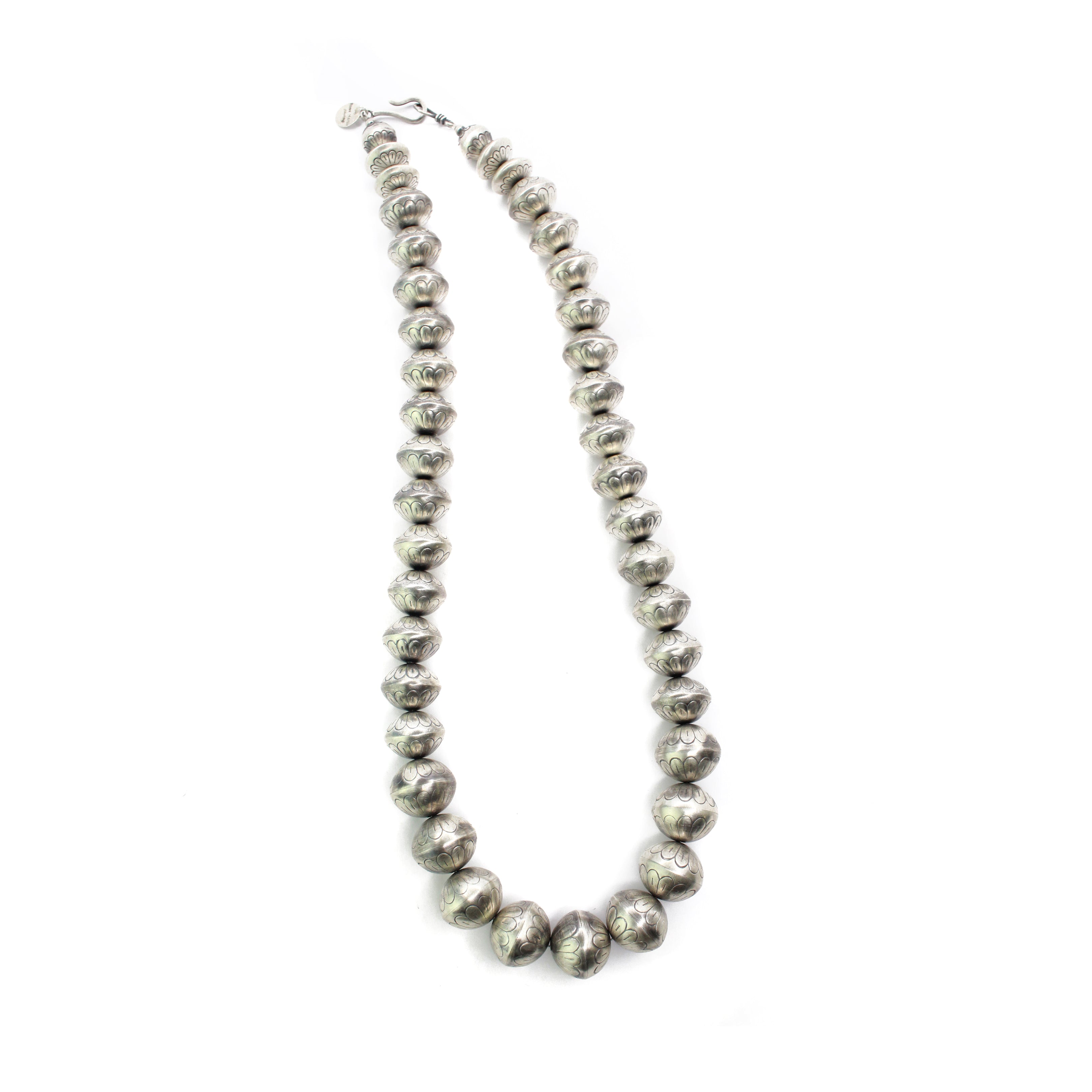 Creating hand-rolled silver beads is a celebrated tradition among Navajo silversmiths and an icon of Navajo jewelry. Handmade beads are meticulously crafted, with each bead being the result of an extremely labor-intensive process. These beads are shaped by hand using tools such as hammers, pliers, and files. The lengthy process includes melting, rolling, cutting, shaping, soldering & filing each sterling silver bead by BY HAND. This meticulous time honored method is a highly skilled trade that few artists have mastered.