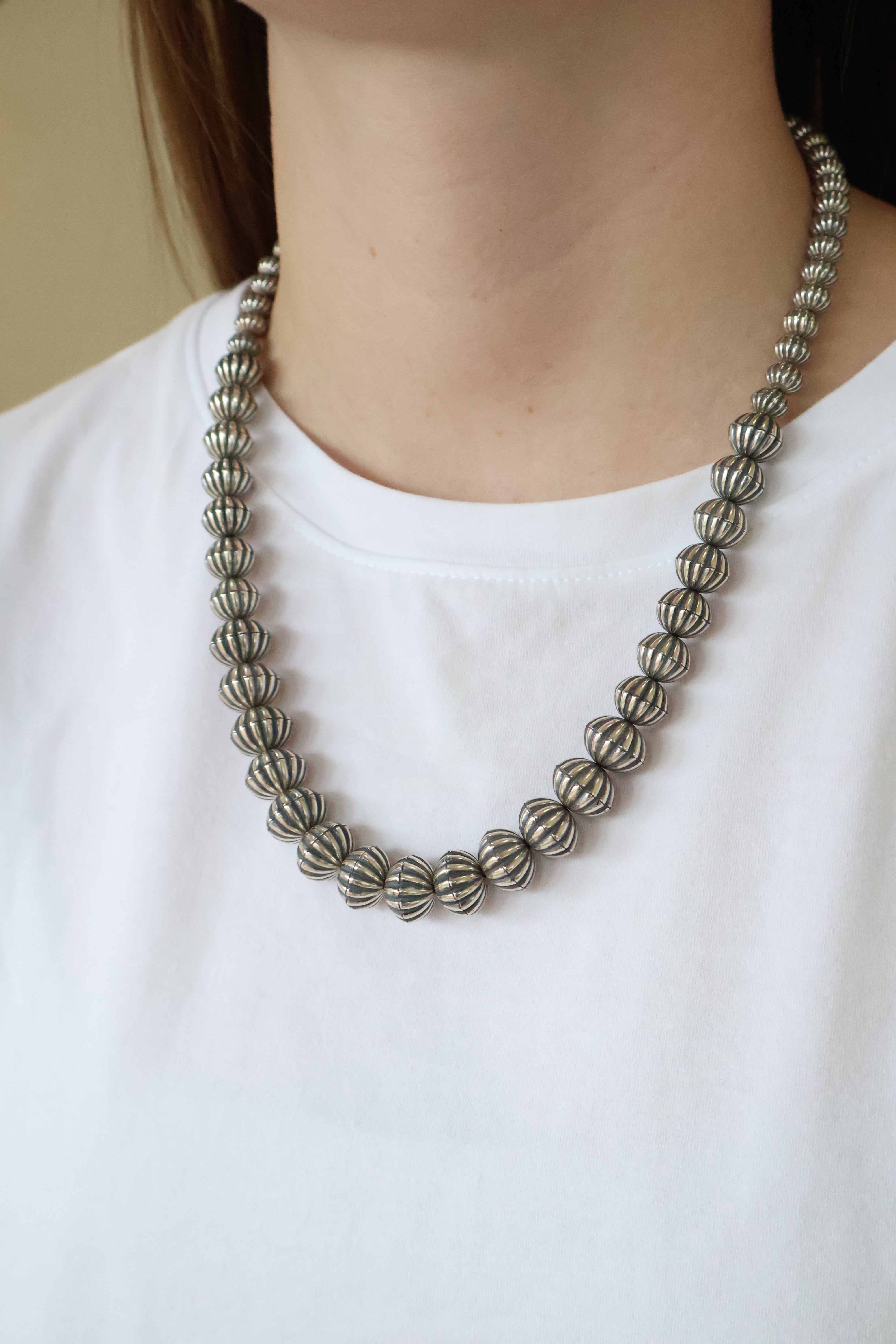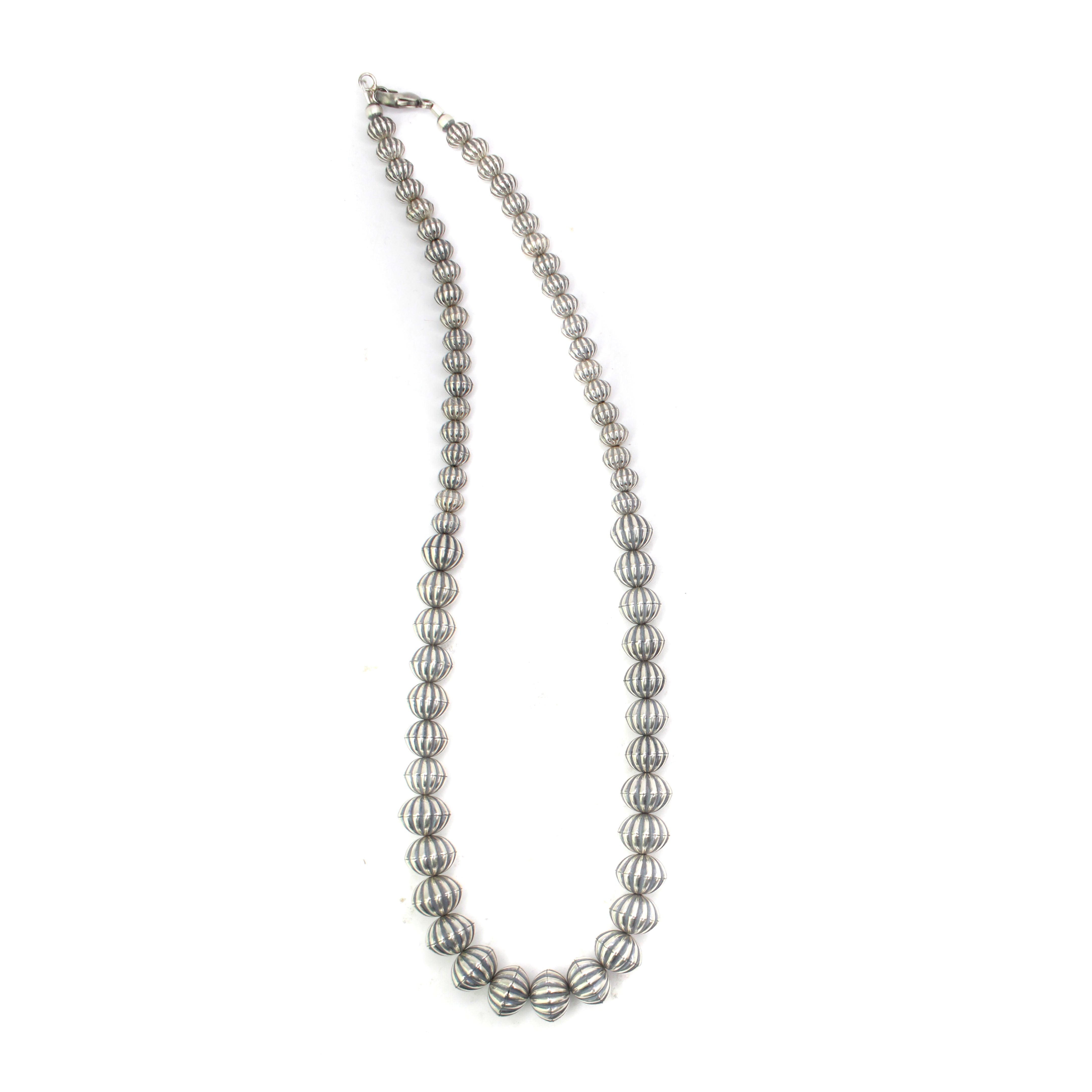 Creating hand-rolled silver beads is a celebrated tradition among Navajo silversmiths and an icon of Navajo jewelry. Handmade beads are meticulously crafted, with each bead being the result of an extremely labor-intensive process. These beads are shaped by hand using tools such as hammers, pliers, and files. The lengthy process includes melting, rolling, cutting, shaping, soldering & filing each sterling silver bead by BY HAND. This meticulous time honored method is a highly skilled trade that few artists have mastered.