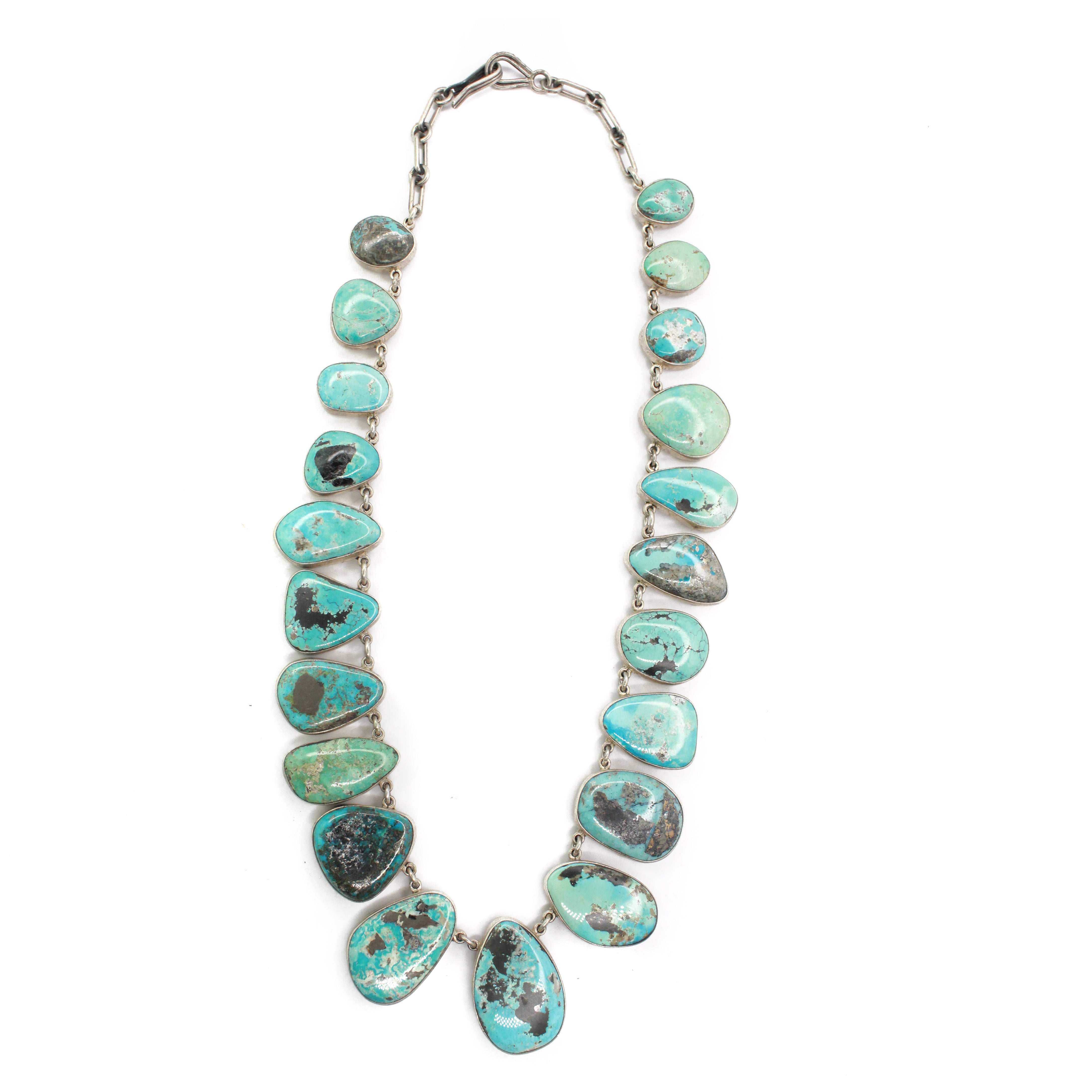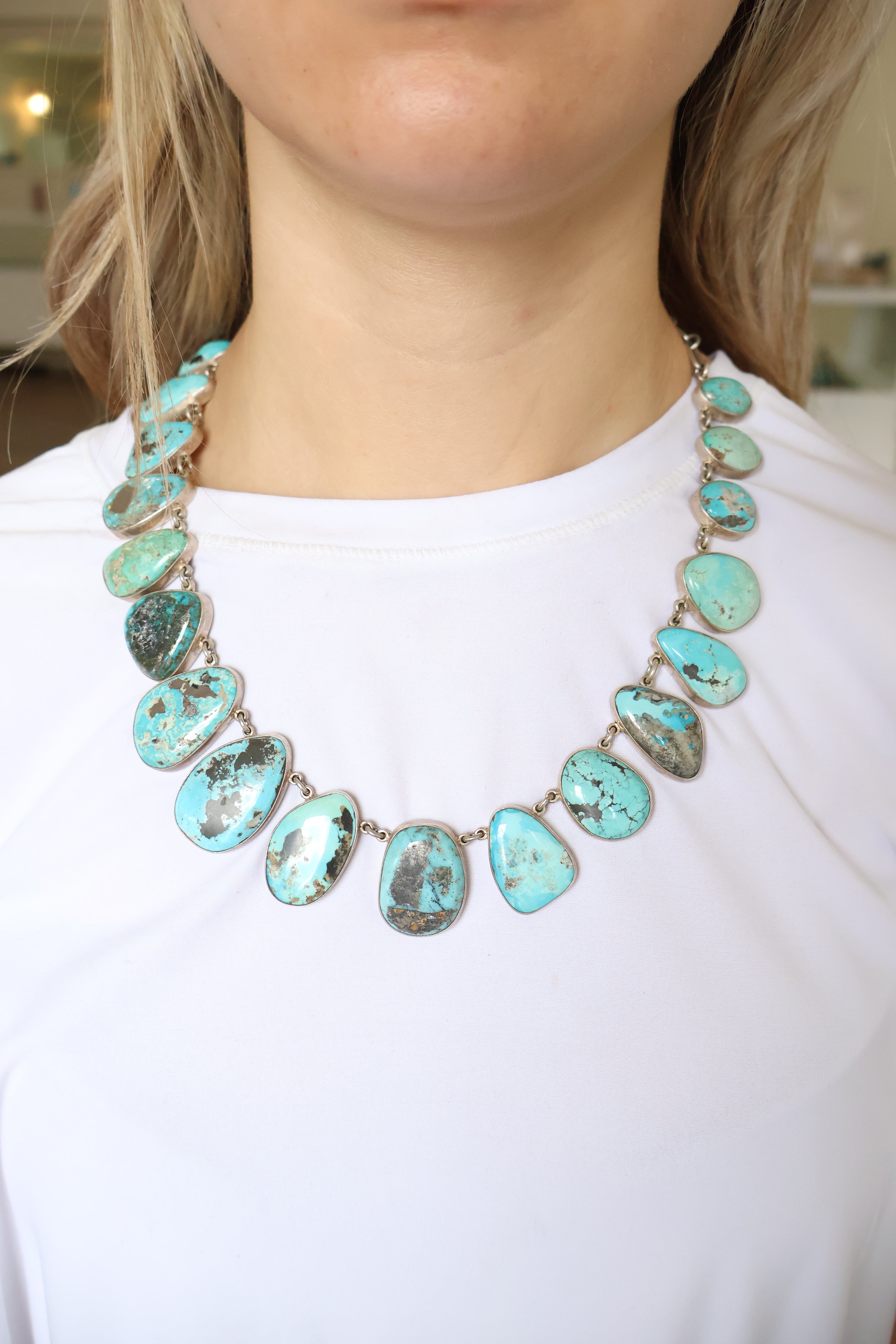 Sonoran turquoise, mined from the Campitos Mountain near Cananea, Sonora, Mexico. This region produces several distinctive types, including Sonoran Gold, known for its vibrant colors like aqua blue, lime, and two-tone blue and green with a golden-brown matrix; Sonoran Rose, a natural bright blue turquoise; and Sonoran Blue, valued for its hardness, shiny pyrite flakes, and black oxide veins.