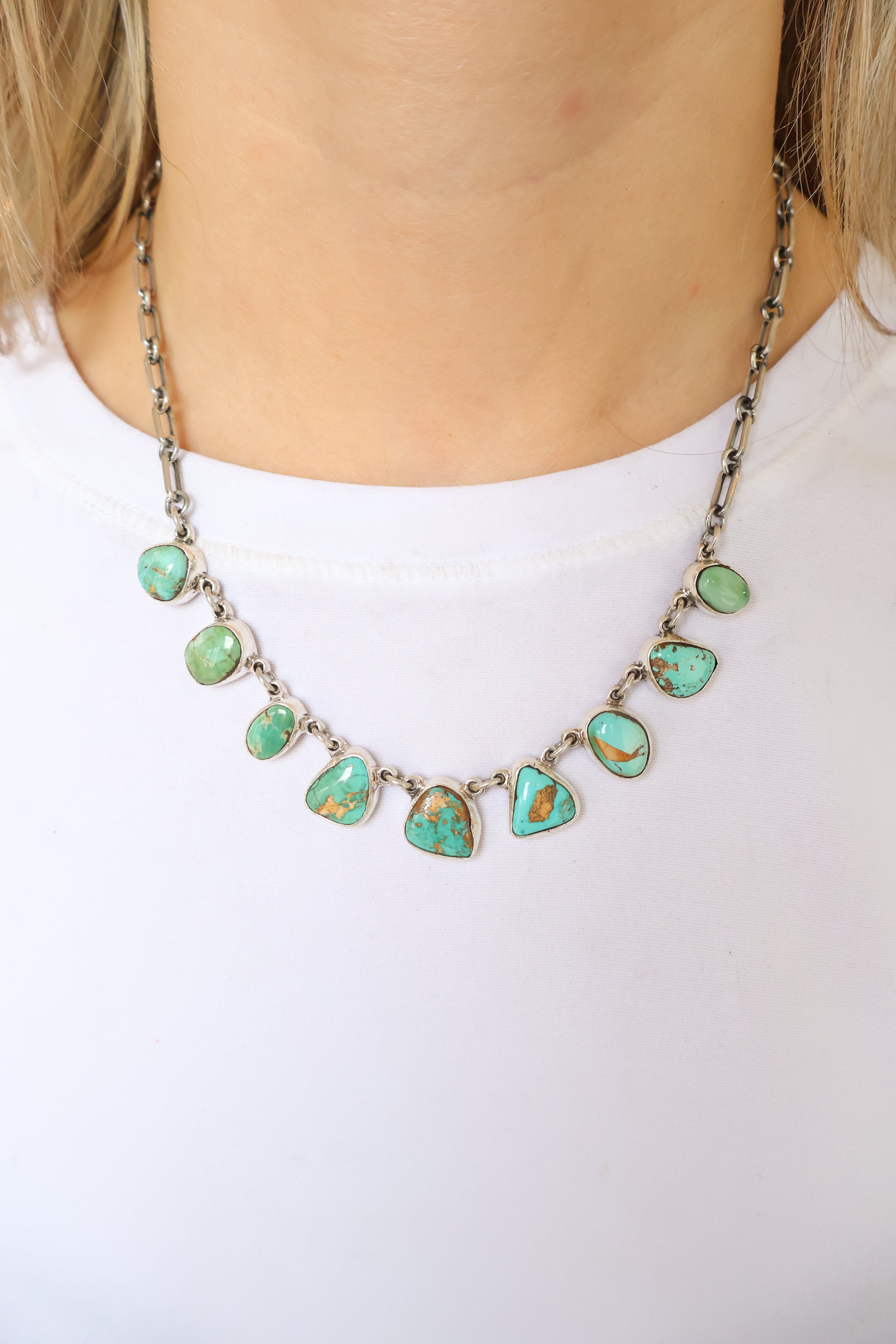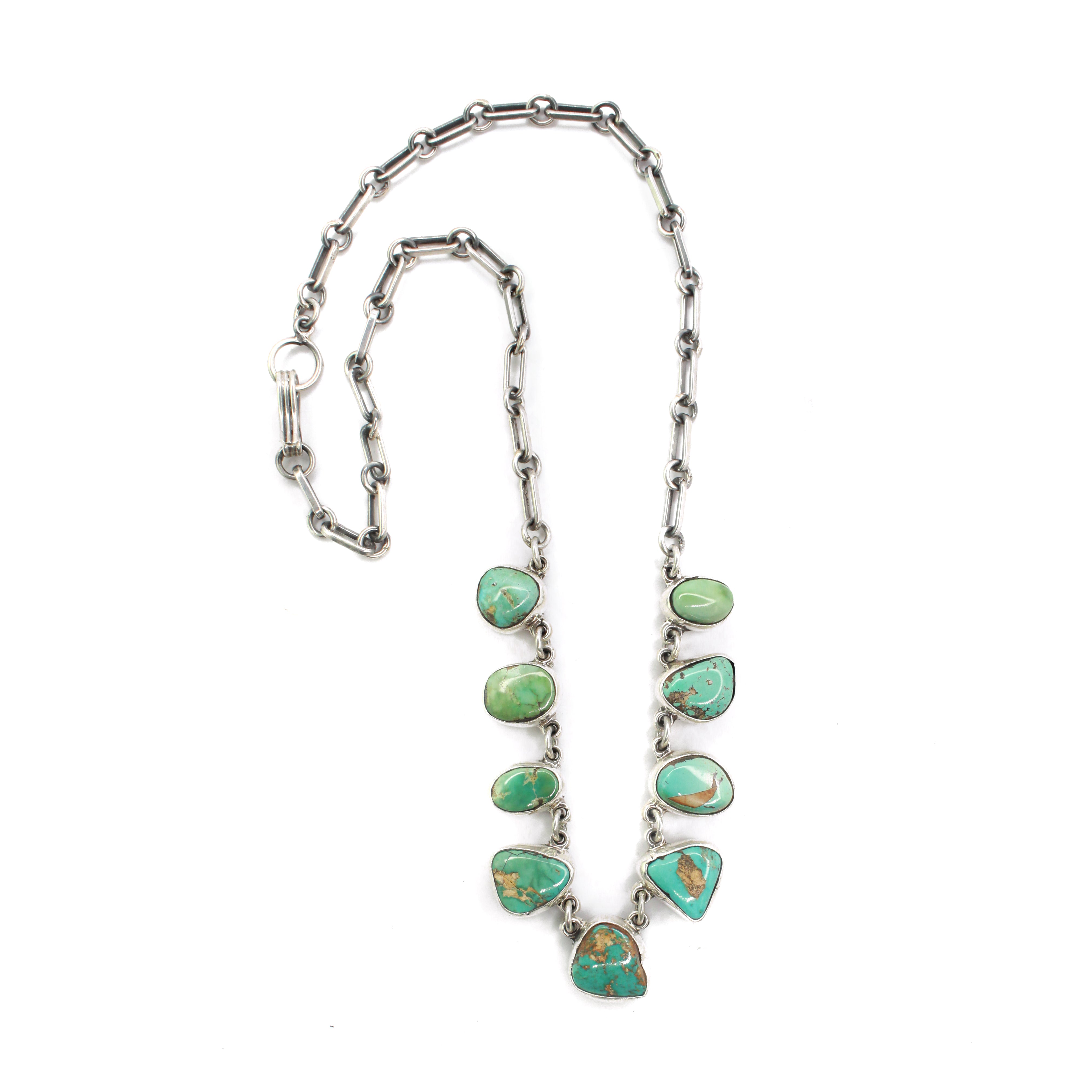 Sonoran turquoise, mined from the Campitos Mountain near Cananea, Sonora, Mexico. This region produces several distinctive types, including Sonoran Gold, known for its vibrant colors like aqua blue, lime, and two-tone blue and green with a golden-brown matrix; Sonoran Rose, a natural bright blue turquoise; and Sonoran Blue, valued for its hardness, shiny pyrite flakes, and black oxide veins.