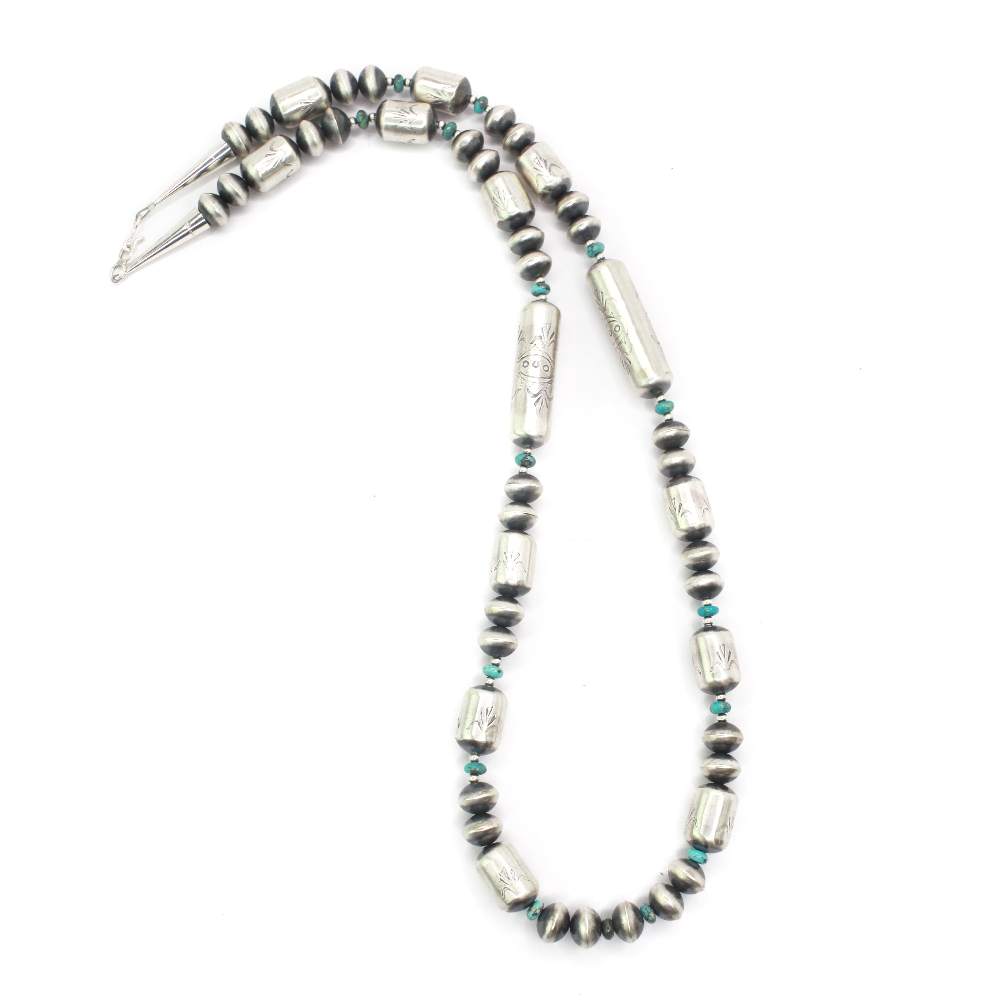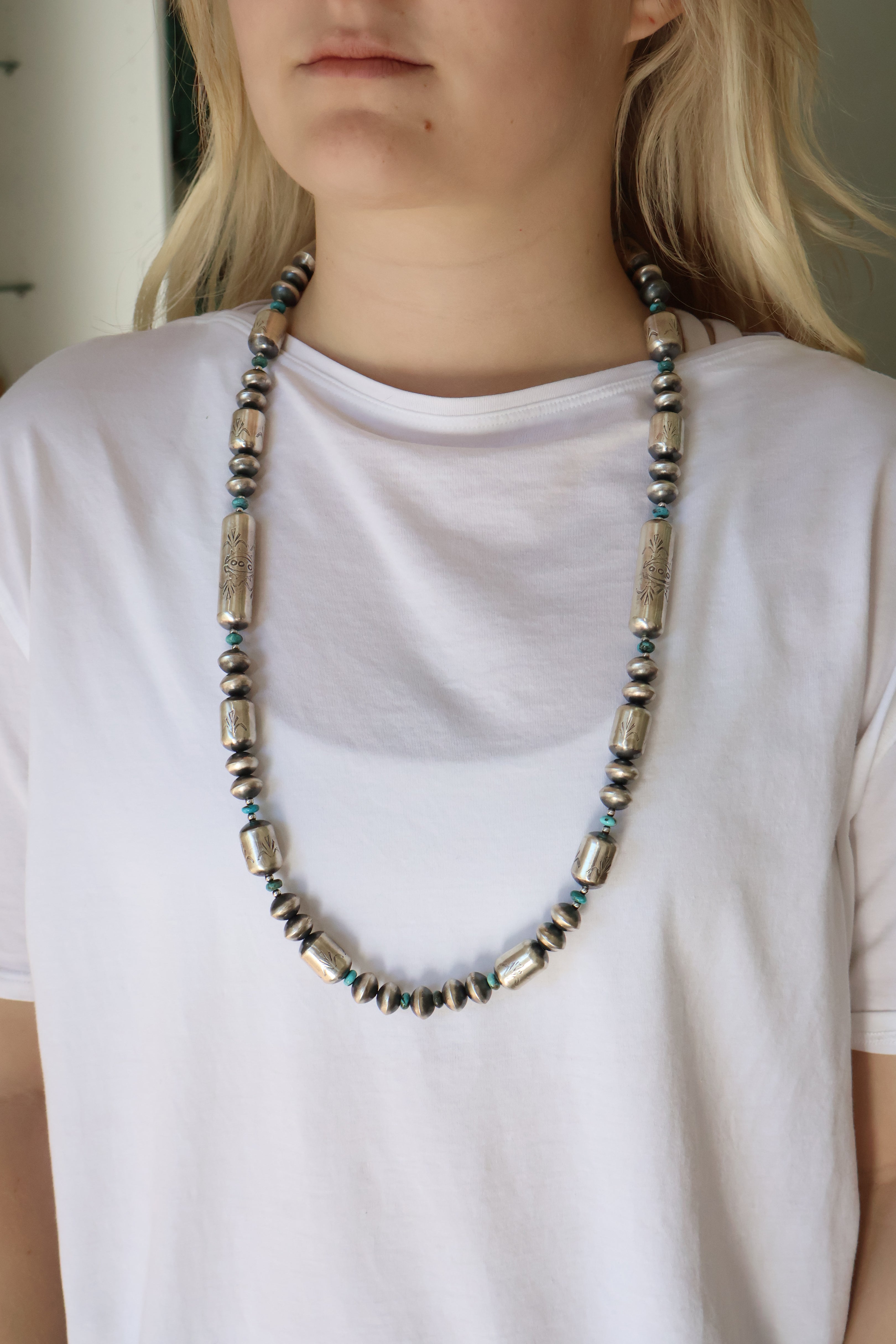 Creating hand-rolled silver beads is a celebrated tradition among Navajo silversmiths and an icon of Navajo jewelry. Handmade beads are meticulously crafted, with each bead being the result of an extremely labor-intensive process. These beads are shaped by hand using tools such as hammers, pliers, and files. The lengthy process includes melting, rolling, cutting, shaping, soldering & filing each sterling silver bead by BY HAND. This meticulous time honored method is a highly skilled trade that few artists have mastered.