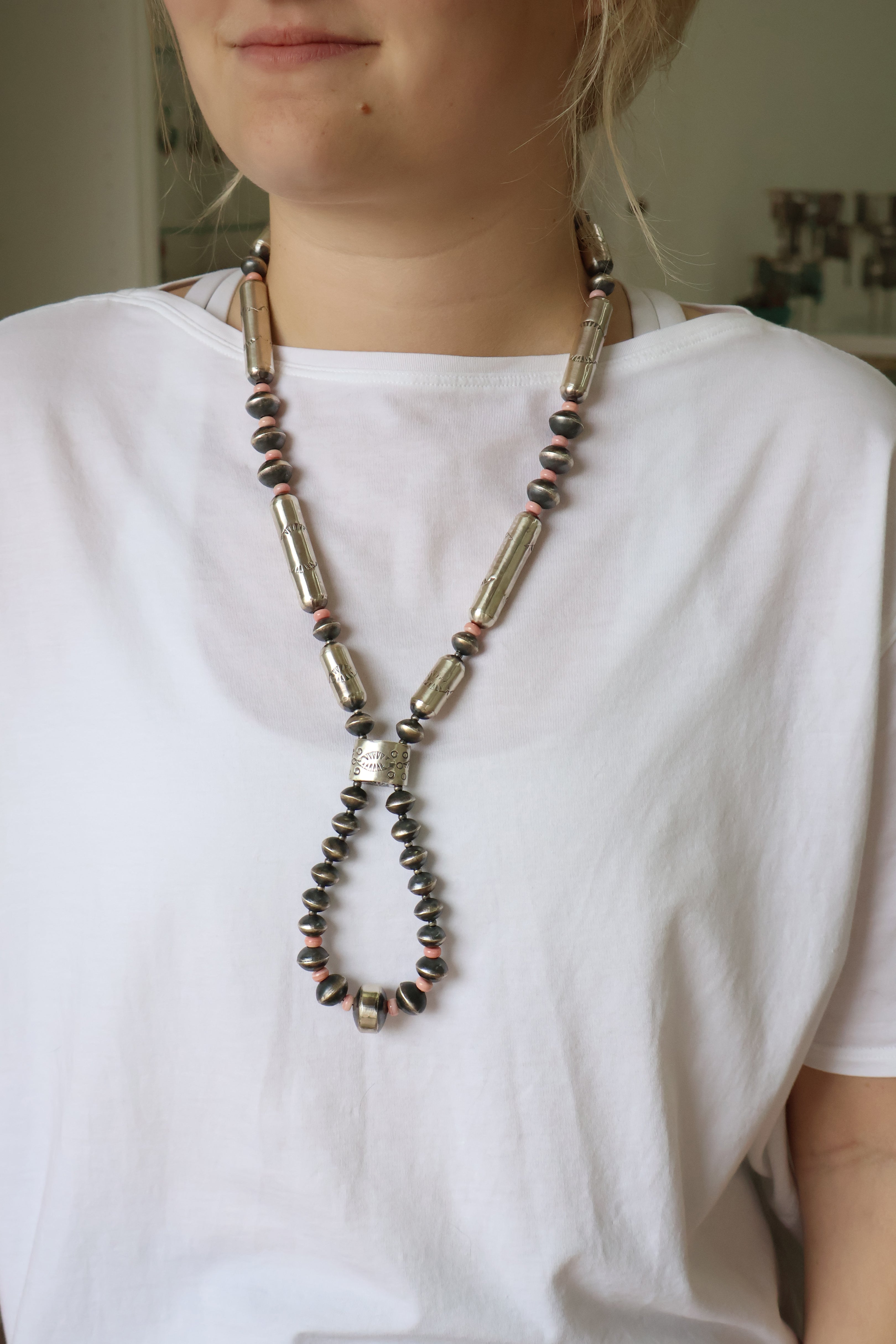 Creating hand-rolled silver beads is a celebrated tradition among Navajo silversmiths and an icon of Navajo jewelry. Handmade beads are meticulously crafted, with each bead being the result of an extremely labor-intensive process. These beads are shaped by hand using tools such as hammers, pliers, and files. The lengthy process includes melting, rolling, cutting, shaping, soldering & filing each sterling silver bead by BY HAND. This meticulous time honored method is a highly skilled trade that few artists have mastered.