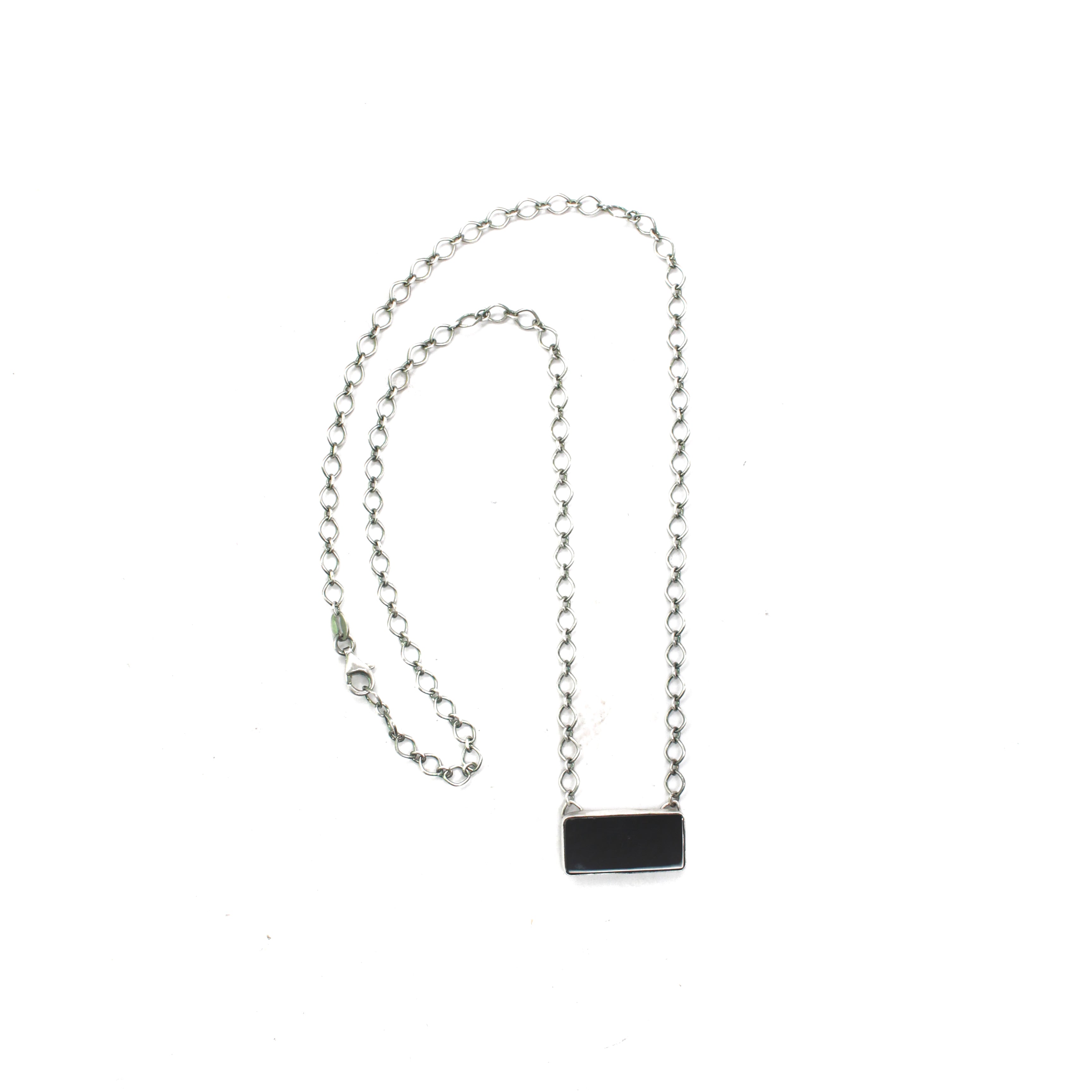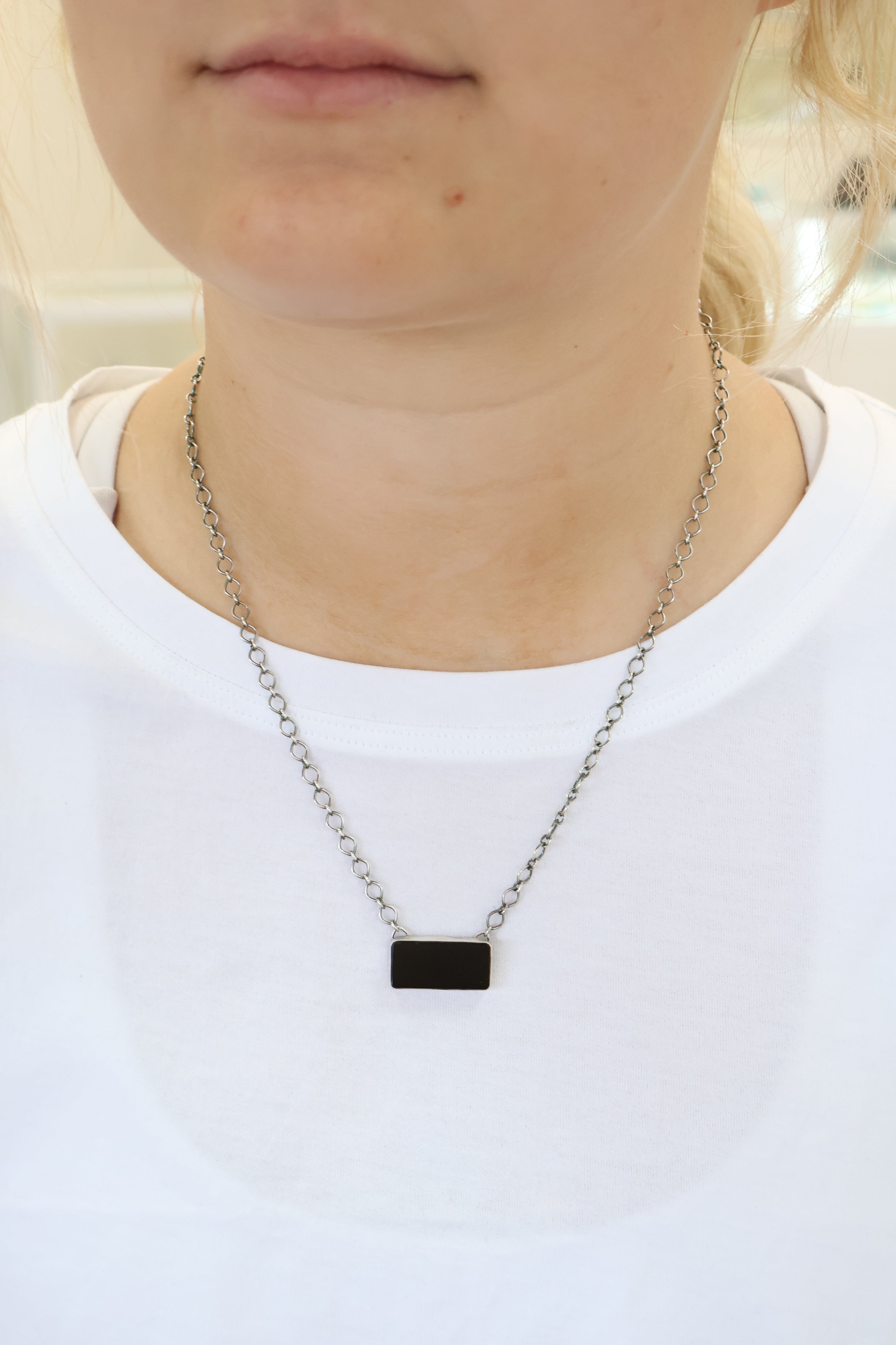 The length listed for bar necklaces is measured from clasp to hook, including the width of the bar. This total length does not directly reflect how the necklace will sit when worn. To more accurately determine where the necklace will sit, subtract the 'bar width' measurement from the 'length end to end" measurement.