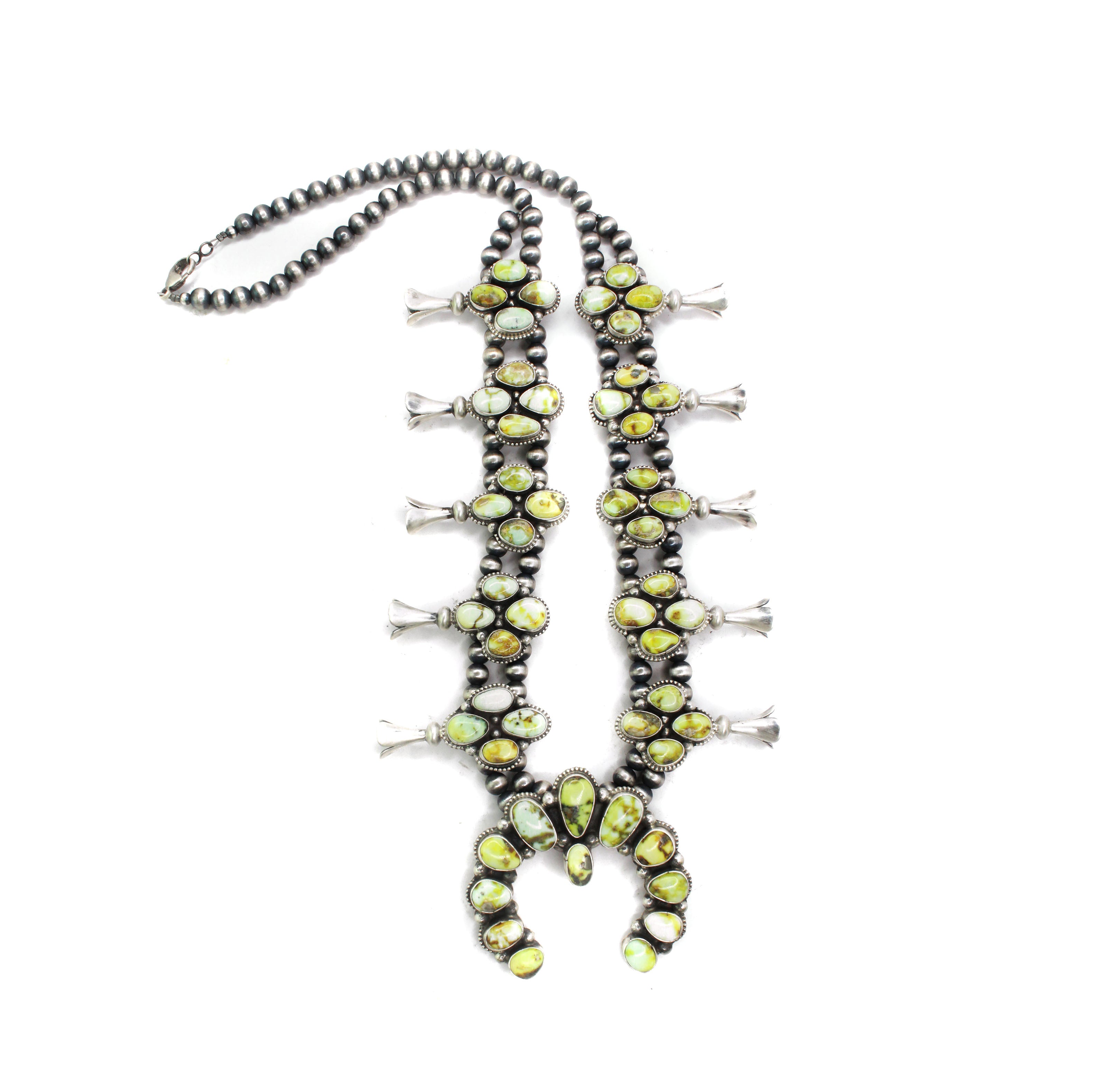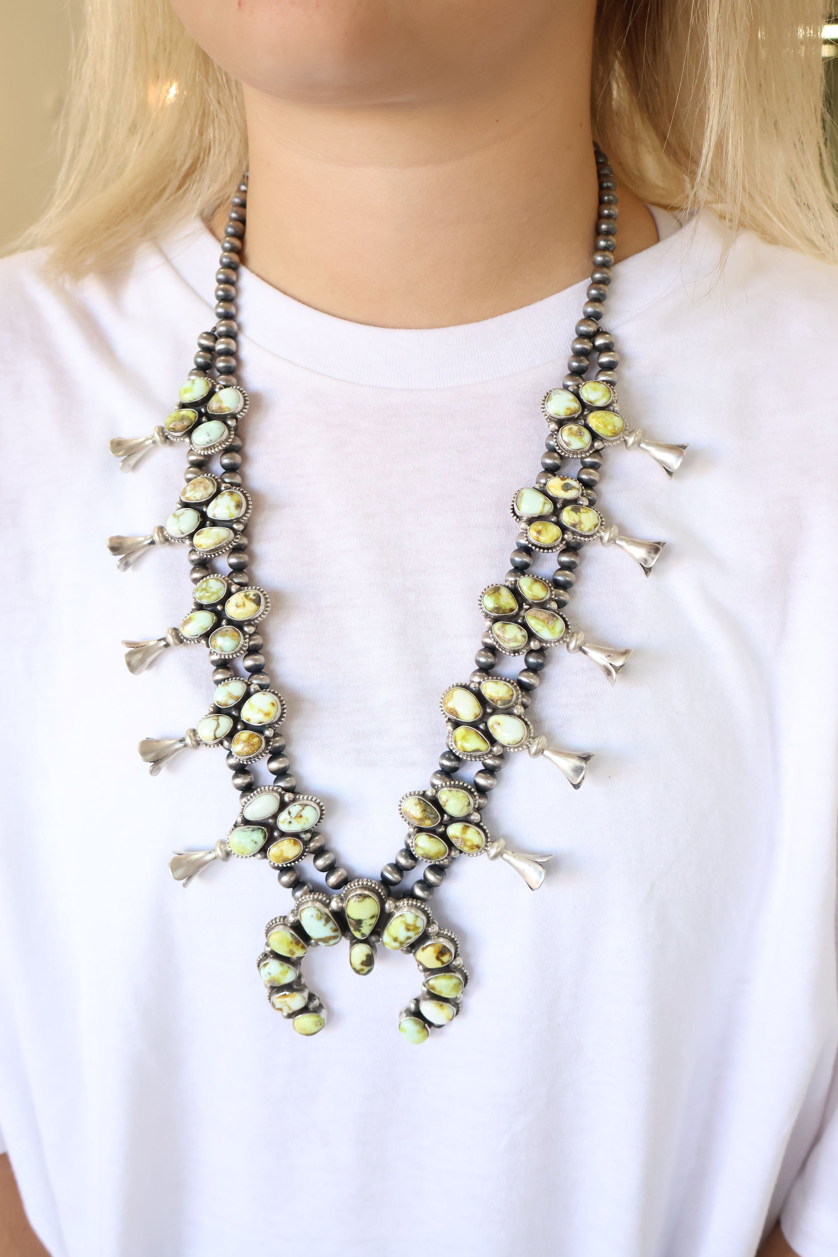 The 'end to end' length listed for Squash Blossom necklaces is measured from clasp to hook and does not include the 'drop' of the Naja. For a more accurate length reference, model photos are provided. Additionally, Naja measurements are also included to give a complete view of the necklace's dimensions.