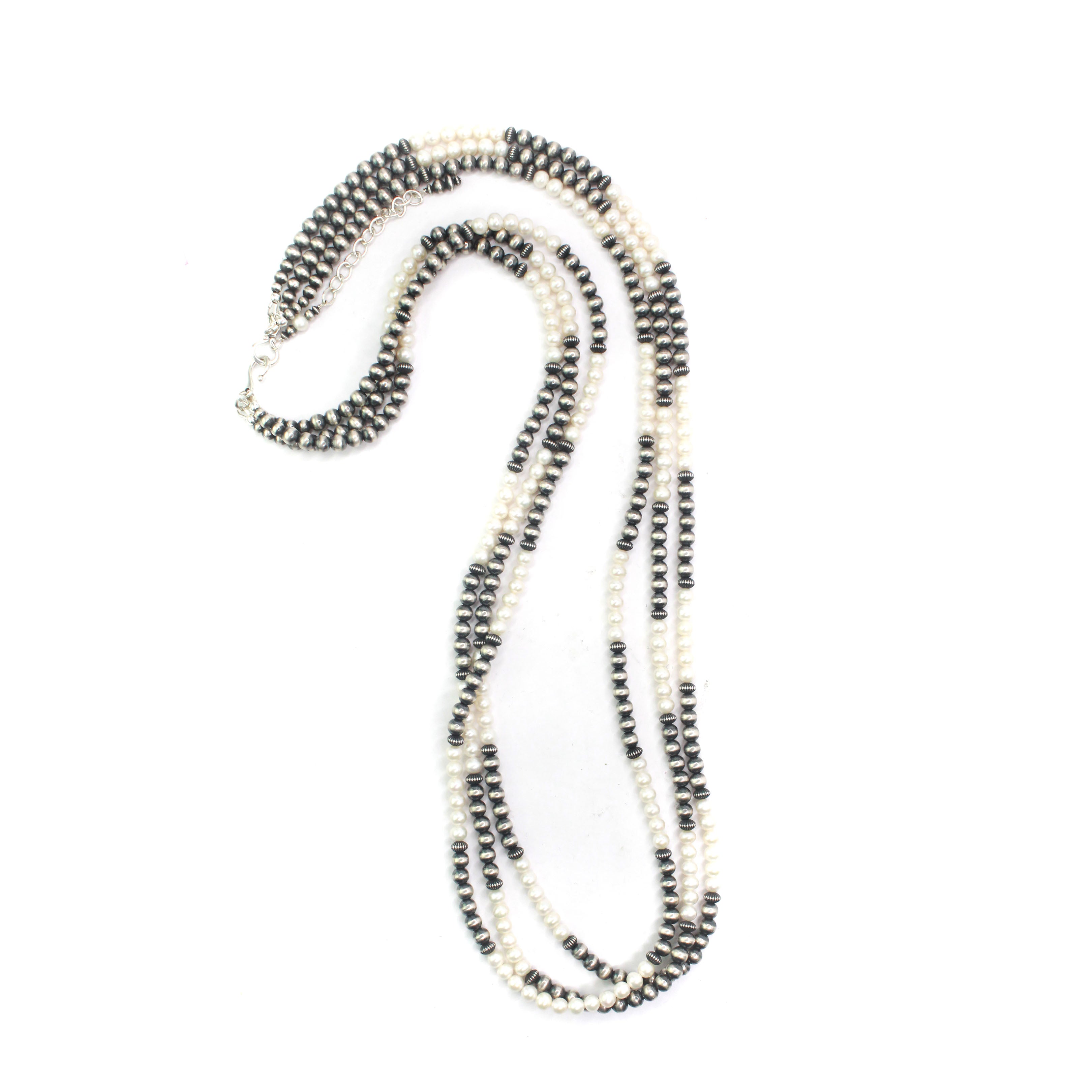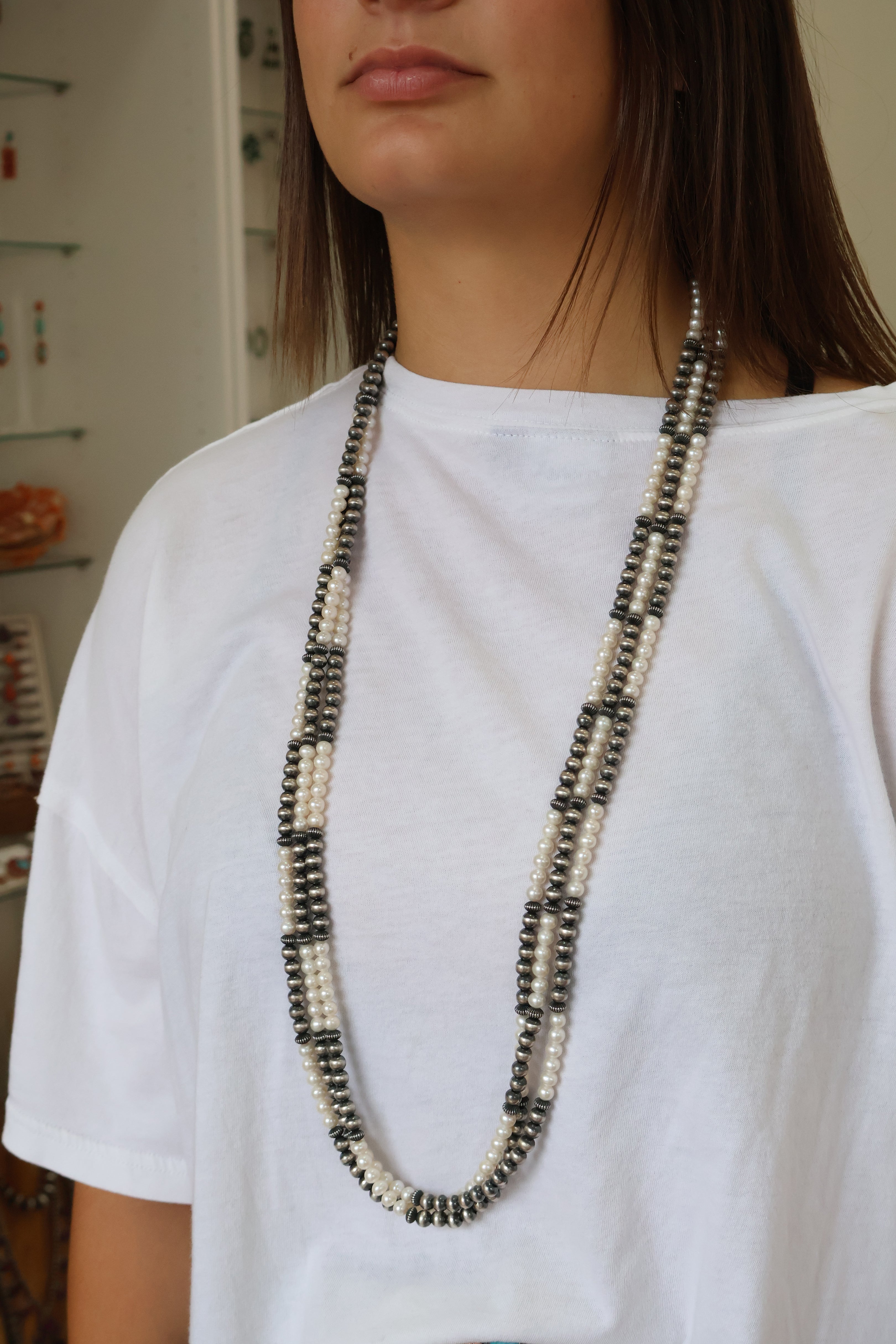 Navajo pearls by Marilyn Platero are a stunning blend of traditional style and contemporary craftsmanship. Known for her impeccable attention to detail, Marilyn strings her pearls on foxtail chain and finishes the ends with soldered clasps for added durability. Her use of machine-made beads provides a uniform and consistent appearance compared to handmade options. The use of machines also allows her to create pearls that range in size from 4mm. Unlike other machine-made beads, Marilyn's have a substantial weight and feel, adding to their quality and appearance. Her beads are oxidized and buffed by hand by Navajo artist Bronson Belone.