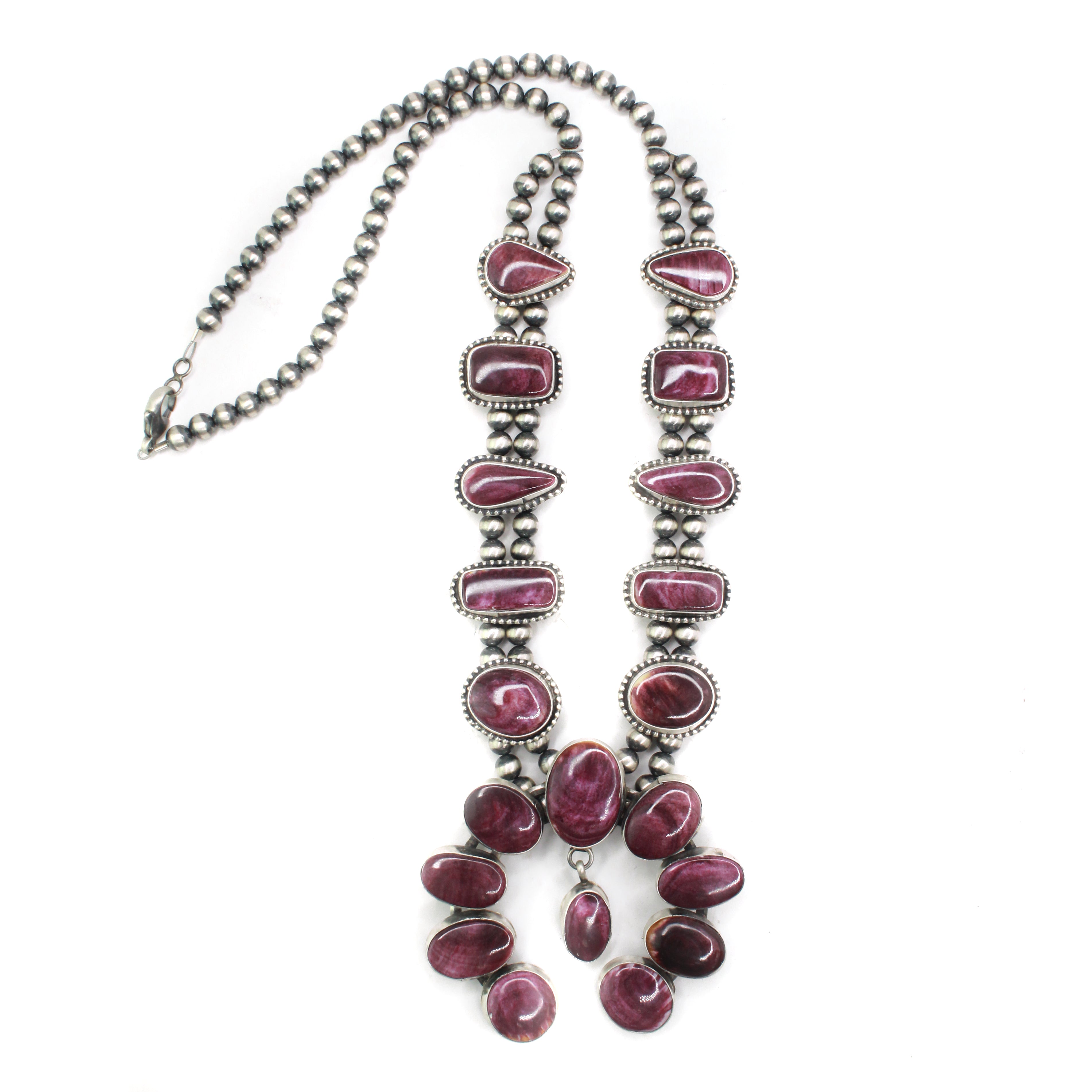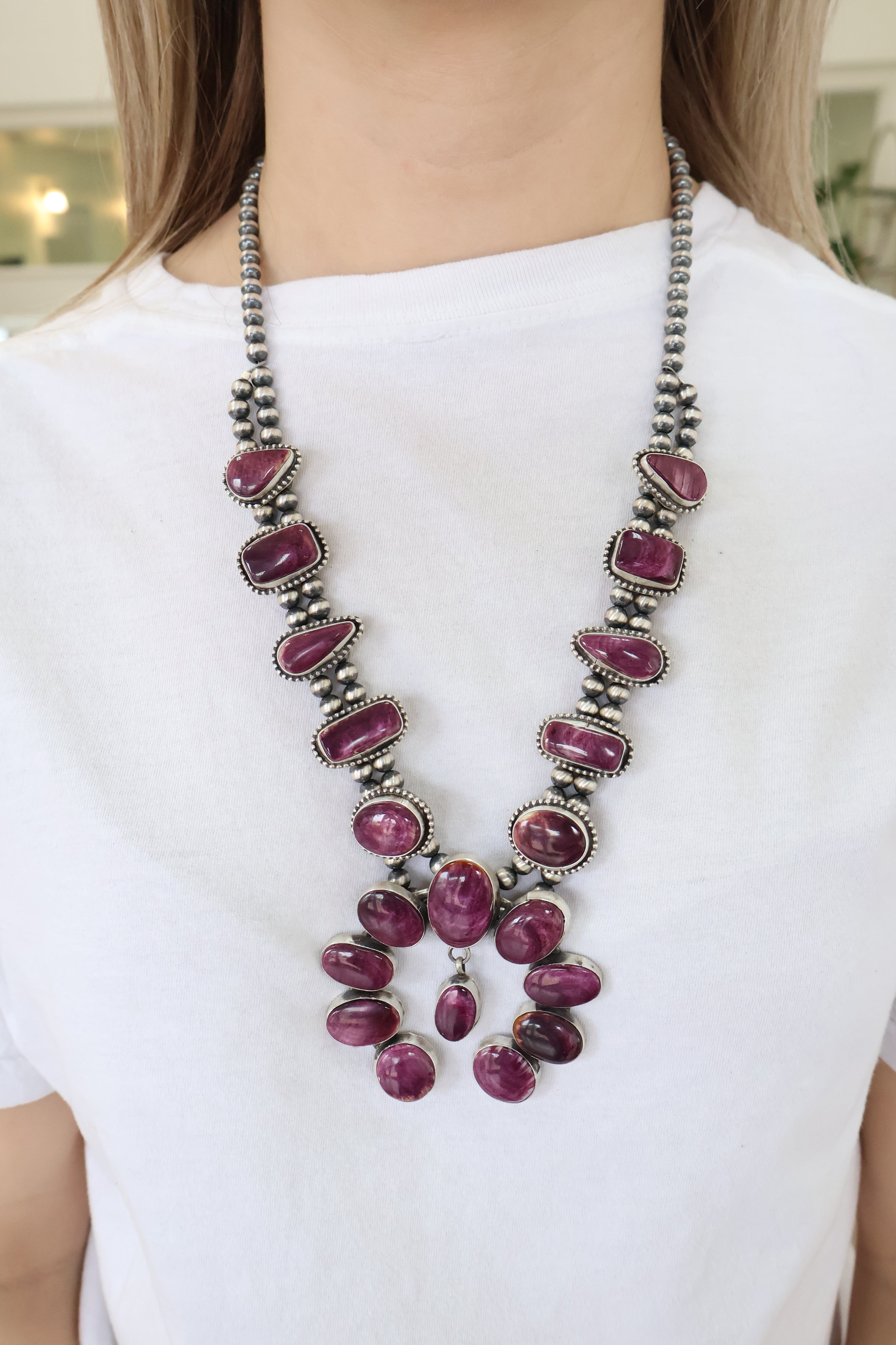 The 'end to end' length listed for Squash Blossom necklaces is measured from clasp to hook and does not include the 'drop' of the Naja. For a more accurate length reference, model photos are provided. Additionally, Naja measurements are also included to give a complete view of the necklace's dimensions.
