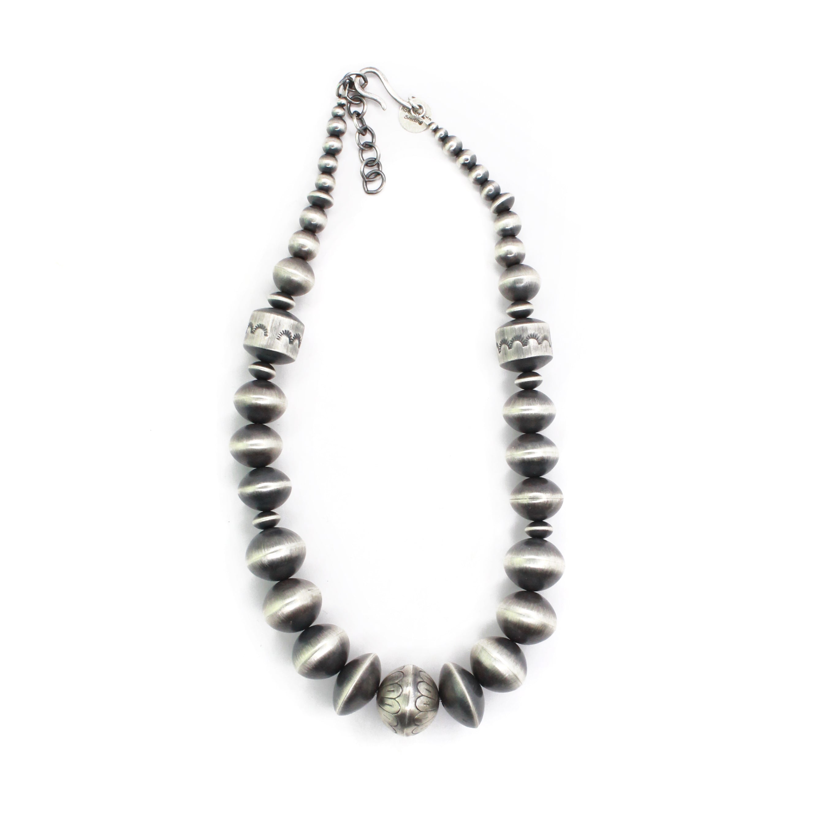 Creating hand-rolled silver beads is a celebrated tradition among Navajo silversmiths and an icon of Navajo jewelry. Handmade beads are meticulously crafted, with each bead being the result of an extremely labor-intensive process. These beads are shaped by hand using tools such as hammers, pliers, and files. The lengthy process includes melting, rolling, cutting, shaping, soldering & filing each sterling silver bead by BY HAND. This meticulous time honored method is a highly skilled trade that few artists have mastered.