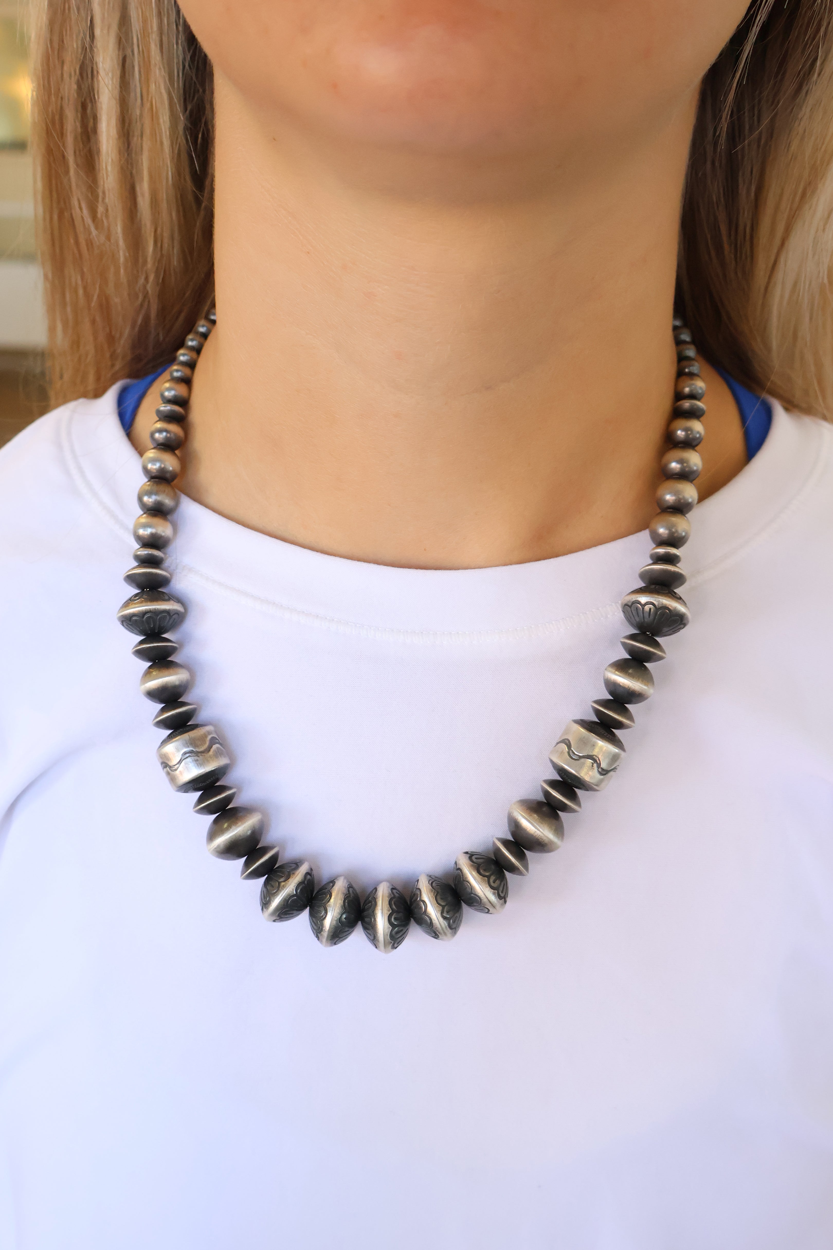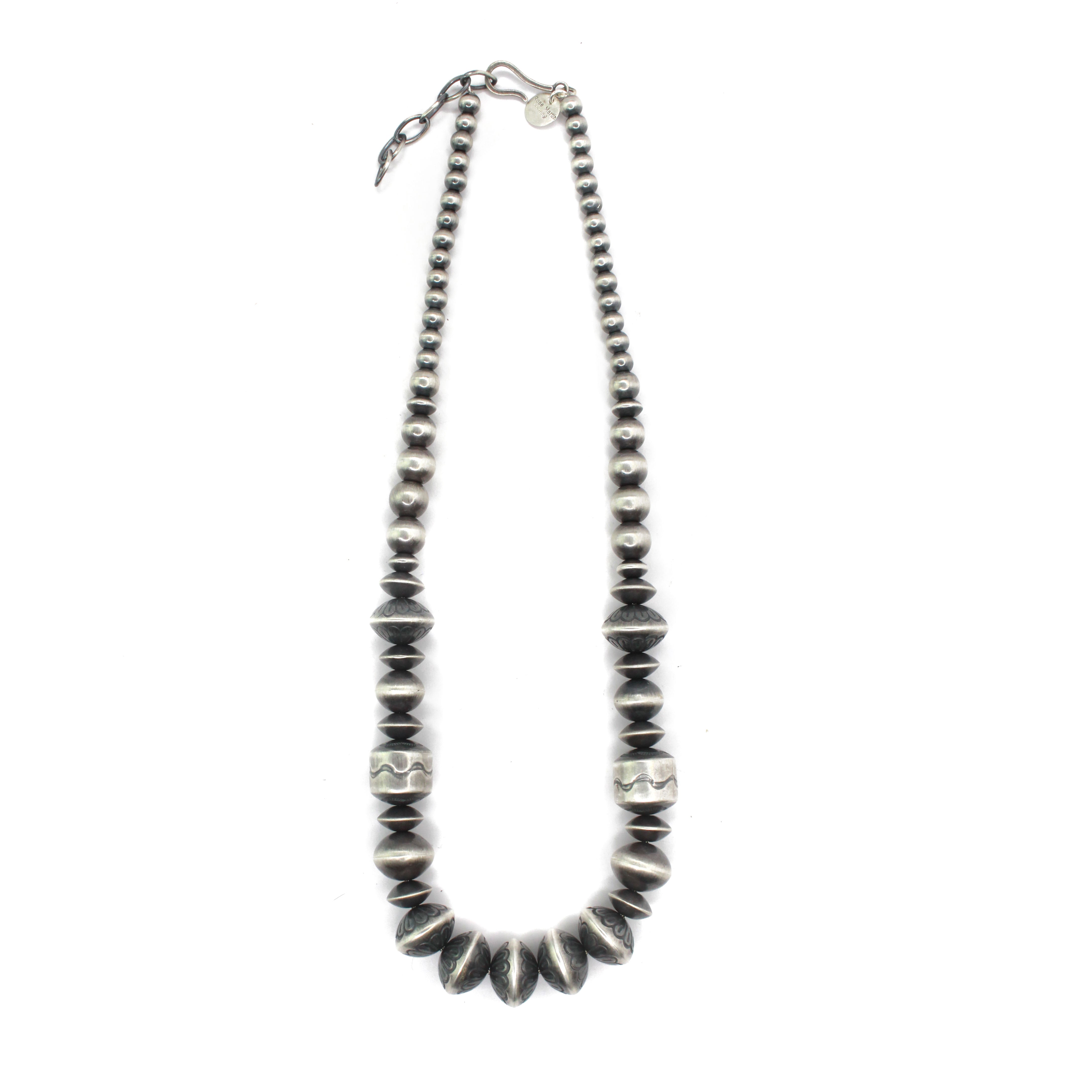 Creating hand-rolled silver beads is a celebrated tradition among Navajo silversmiths and an icon of Navajo jewelry. Handmade beads are meticulously crafted, with each bead being the result of an extremely labor-intensive process. These beads are shaped by hand using tools such as hammers, pliers, and files. The lengthy process includes melting, rolling, cutting, shaping, soldering & filing each sterling silver bead by BY HAND. This meticulous time honored method is a highly skilled trade that few artists have mastered.
