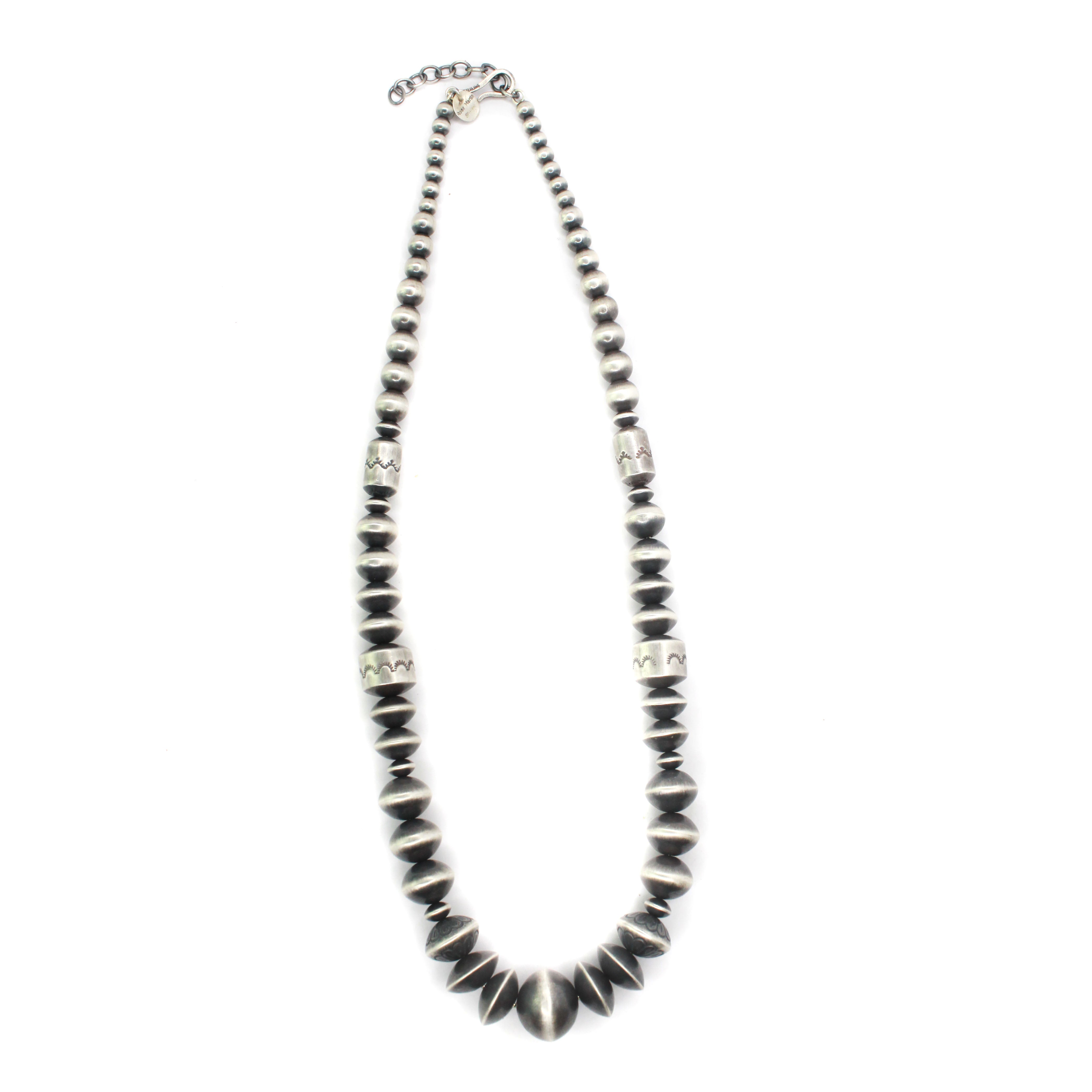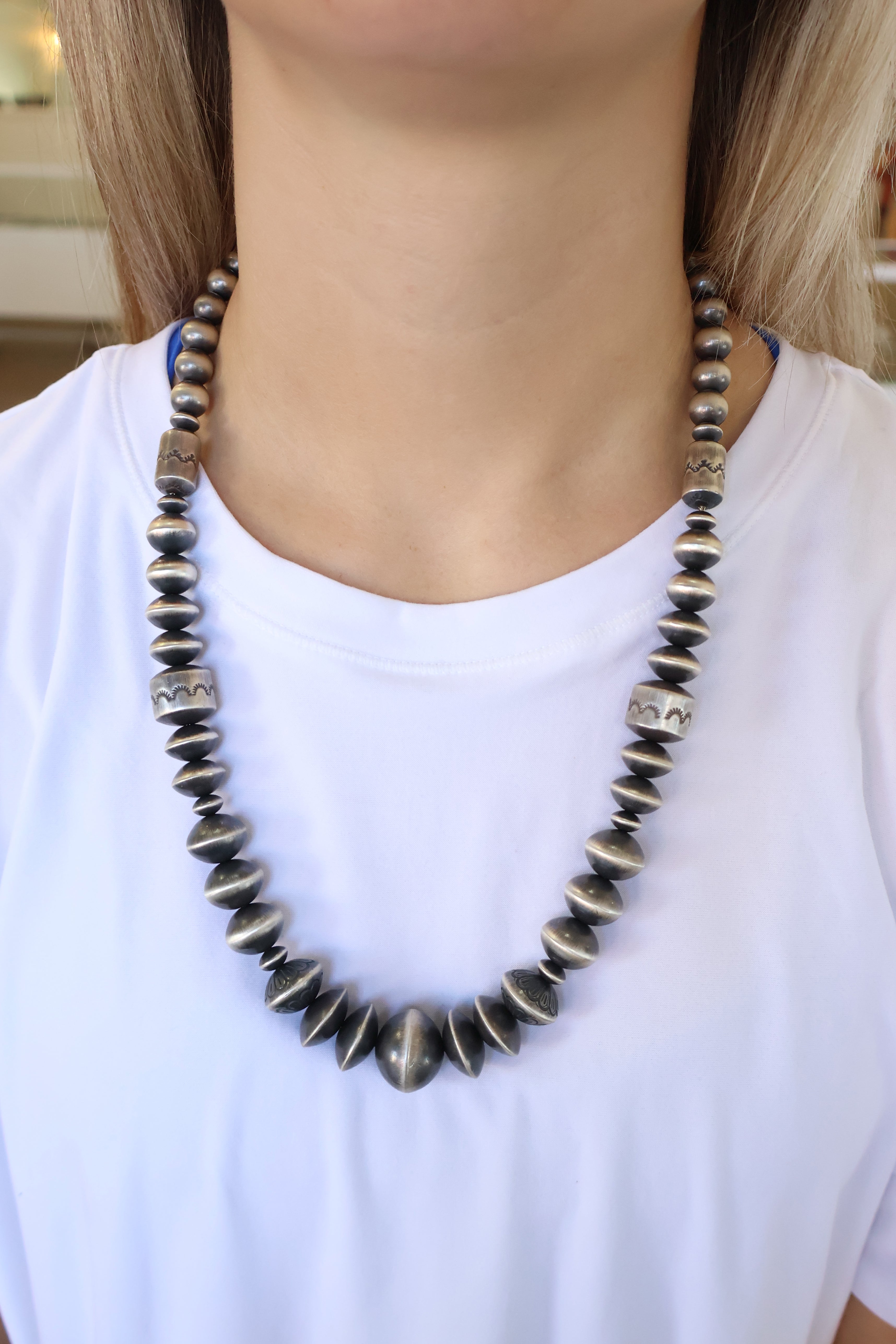 Creating hand-rolled silver beads is a celebrated tradition among Navajo silversmiths and an icon of Navajo jewelry. Handmade beads are meticulously crafted, with each bead being the result of an extremely labor-intensive process. These beads are shaped by hand using tools such as hammers, pliers, and files. The lengthy process includes melting, rolling, cutting, shaping, soldering & filing each sterling silver bead by BY HAND. This meticulous time honored method is a highly skilled trade that few artists have mastered.