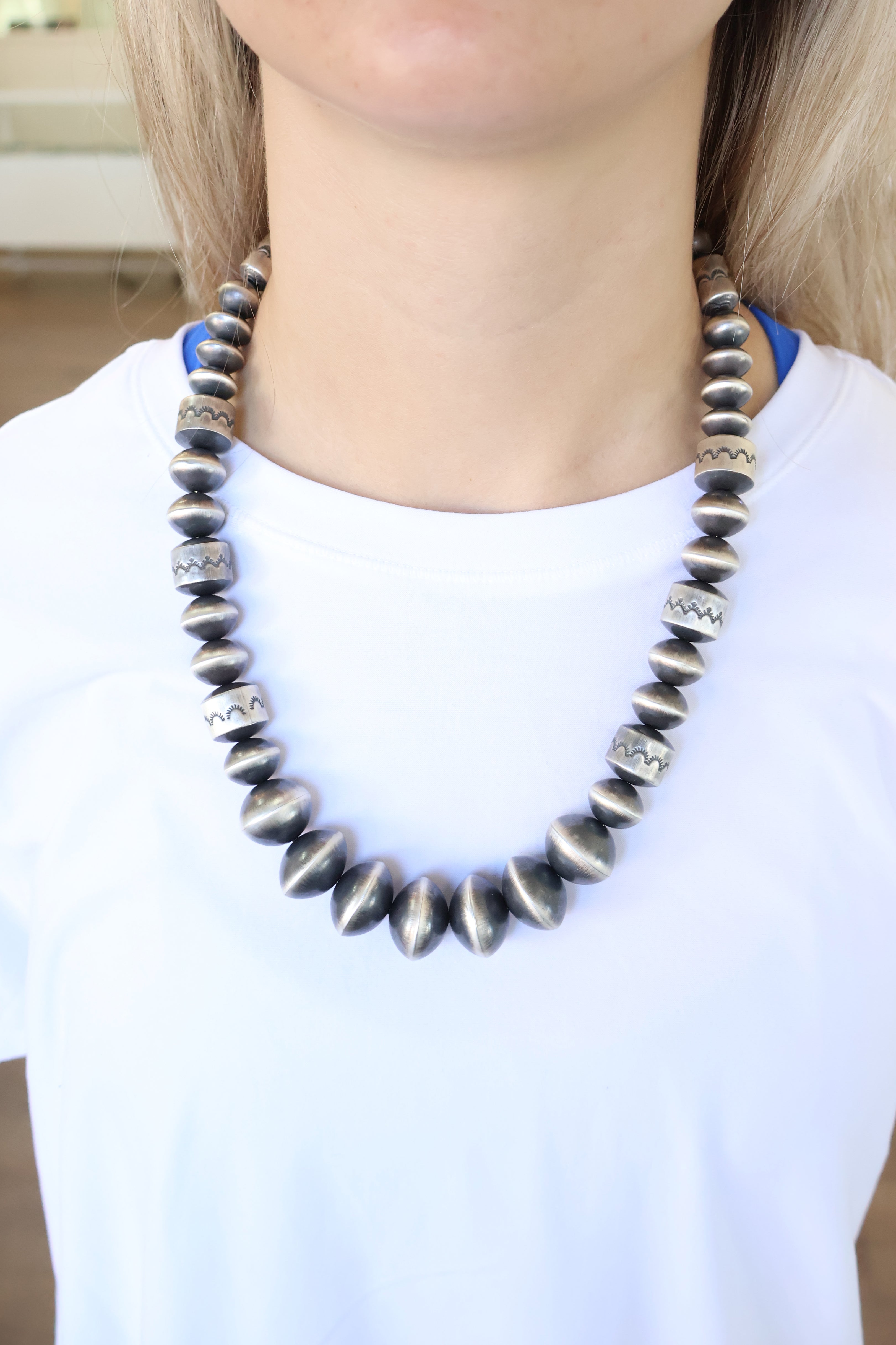 Creating hand-rolled silver beads is a celebrated tradition among Navajo silversmiths and an icon of Navajo jewelry. Handmade beads are meticulously crafted, with each bead being the result of an extremely labor-intensive process. These beads are shaped by hand using tools such as hammers, pliers, and files. The lengthy process includes melting, rolling, cutting, shaping, soldering & filing each sterling silver bead by BY HAND. This meticulous time honored method is a highly skilled trade that few artists have mastered.