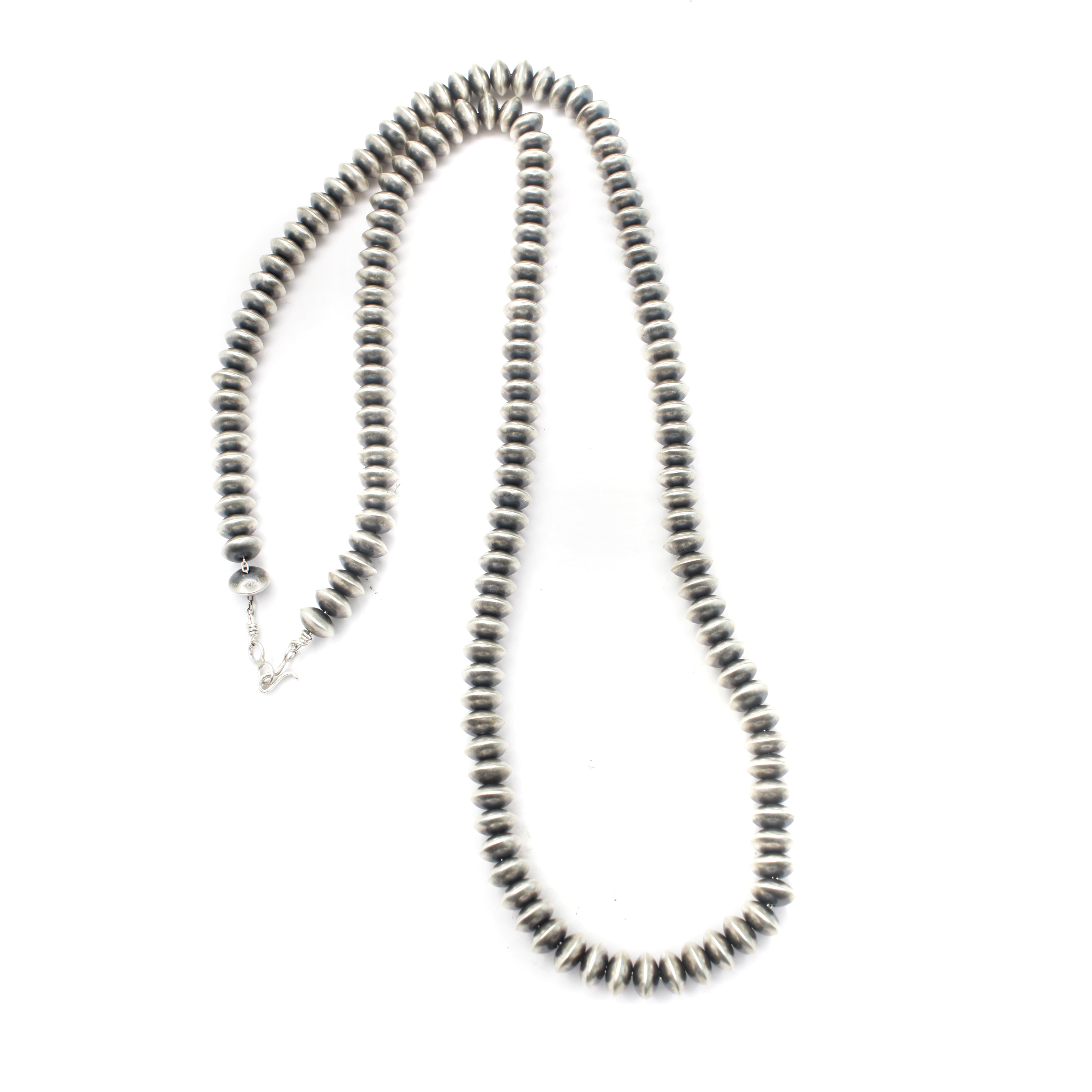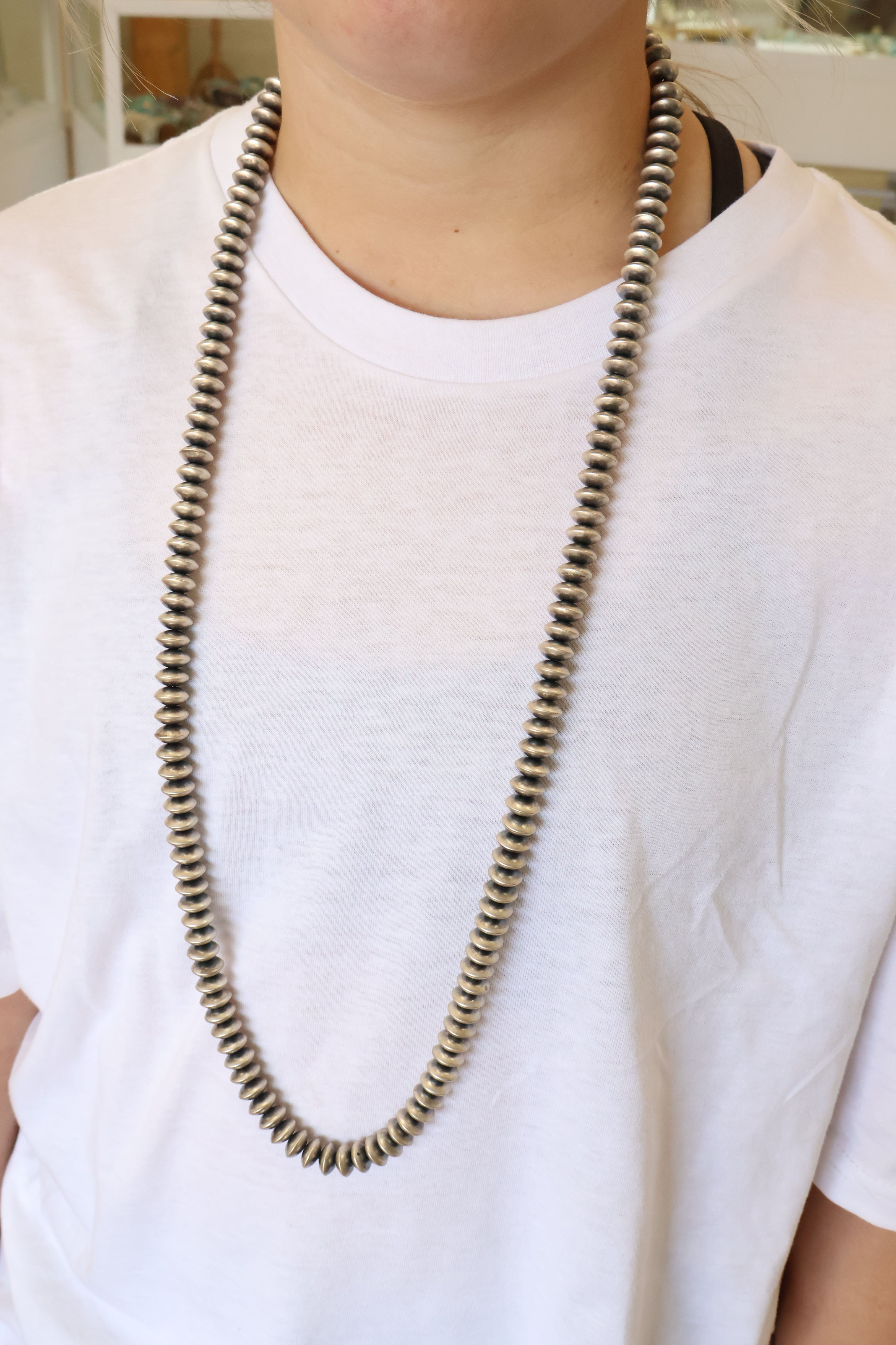 Creating hand-rolled silver beads is a celebrated tradition among Navajo silversmiths and an icon of Navajo jewelry. Handmade beads are meticulously crafted, with each bead being the result of an extremely labor-intensive process. These beads are shaped by hand using tools such as hammers, pliers, and files. The lengthy process includes melting, rolling, cutting, shaping, soldering & filing each sterling silver bead by BY HAND. This meticulous time honored method is a highly skilled trade that few artists have mastered.