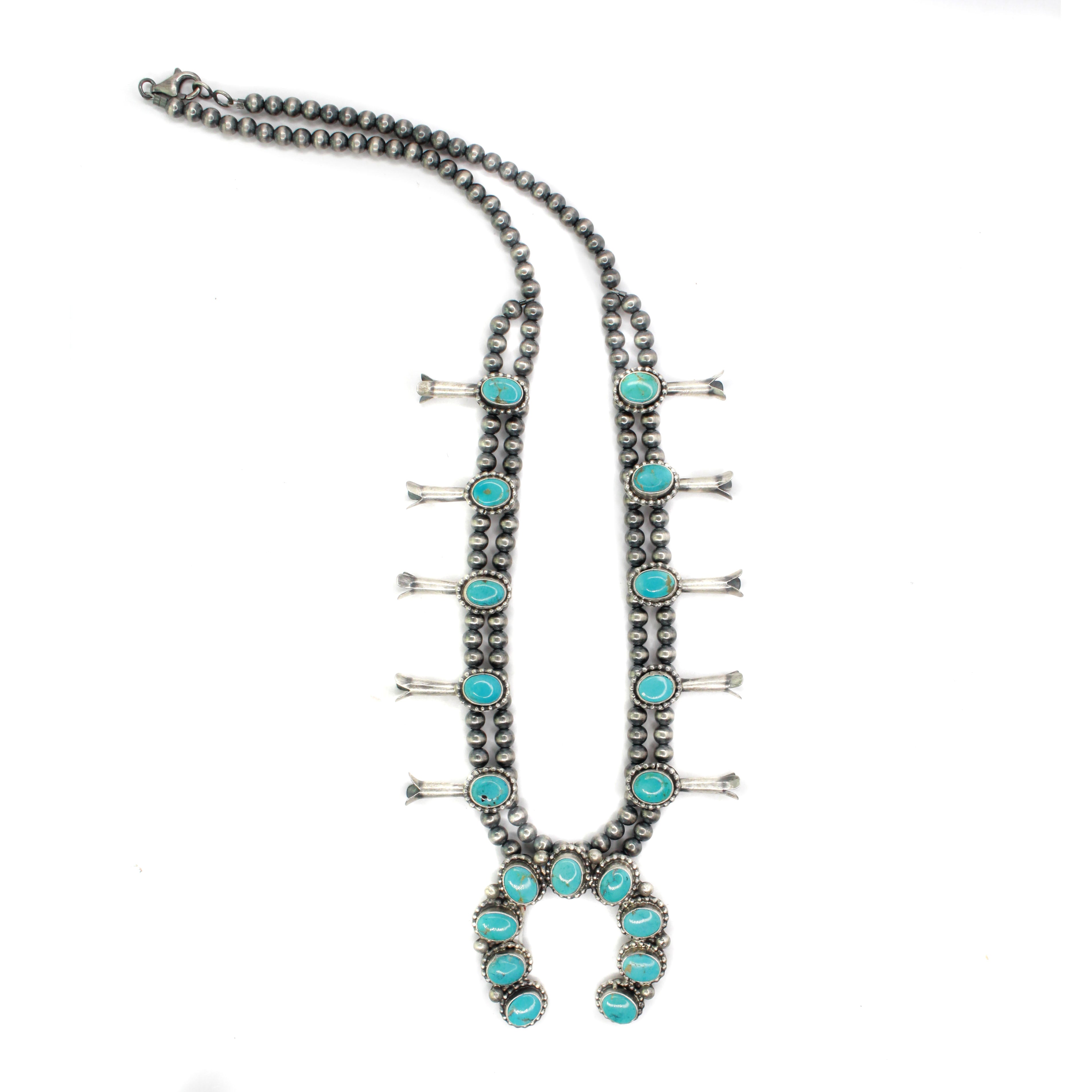 The 'end to end' length listed for Squash Blossom necklaces is measured from clasp to hook and does not include the 'drop' of the Naja. For a more accurate length reference, model photos are provided. Additionally, Naja measurements are also included to give a complete view of the necklace's dimensions.